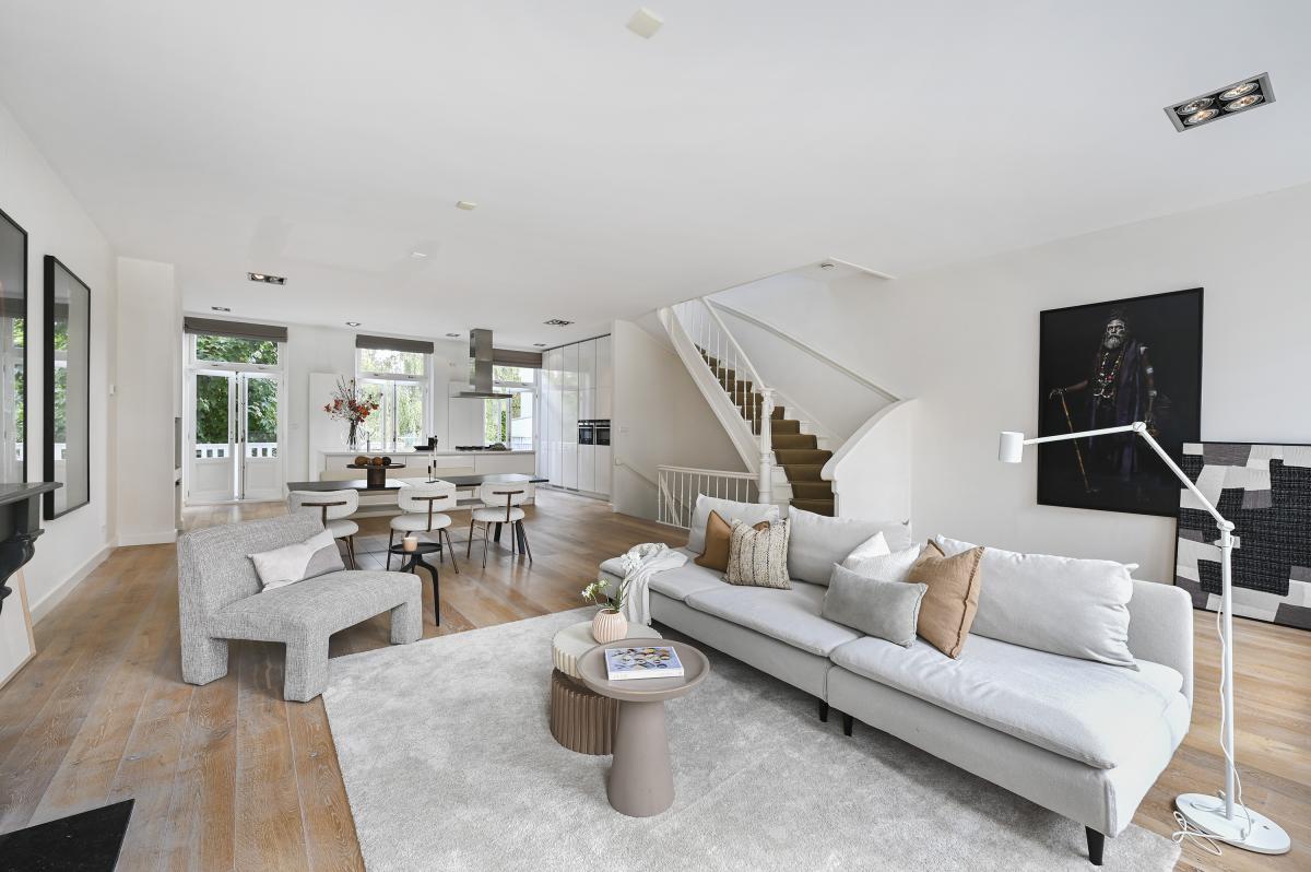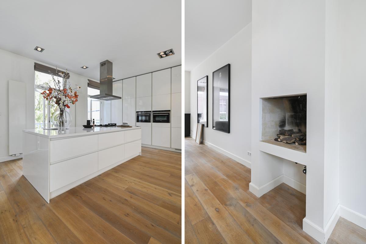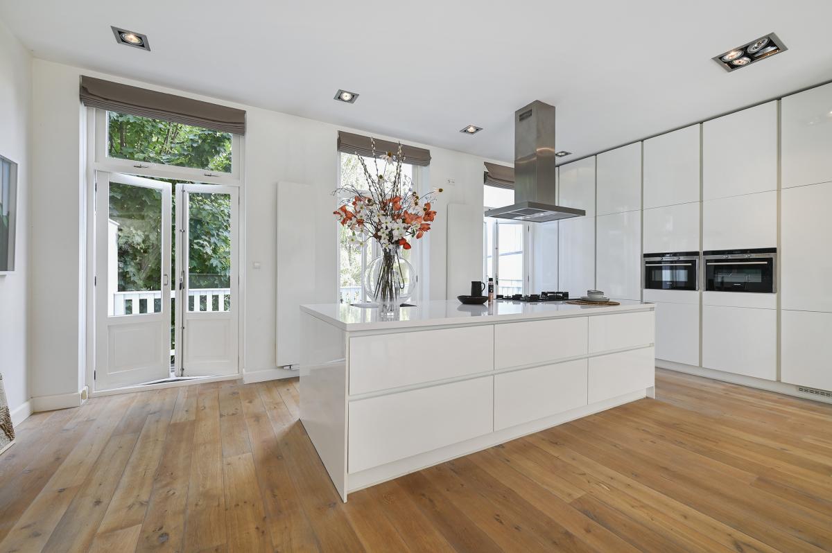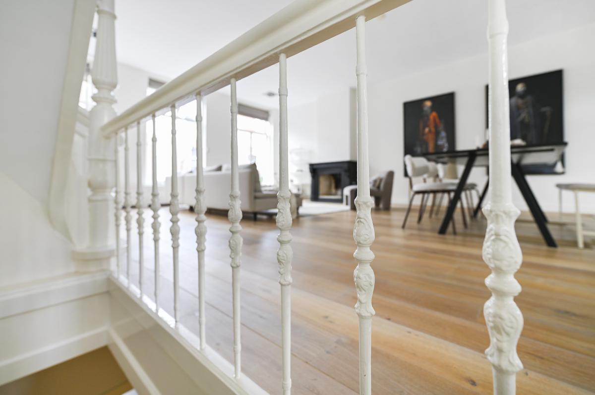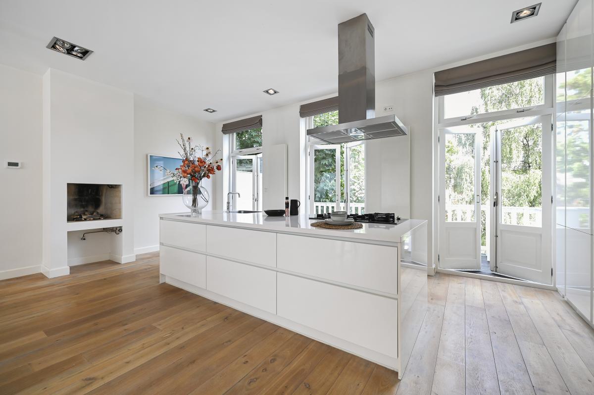 Een brede, luie trap, voorzien van fraaie originele geornamenteerde trapspijlen, geeft toegang tot de op de eerste verdieping gelegen zeer royale living met open keuken. Deze verdieping is maar liefst 76 m² groot en geeft door het open plan een heerlijk ruimtelijk gevoel. Voor de gezelligheid vindt u hier een houtgestookte openhaard en een gashaard. De keuken is voorzien van een groot kook-/spoeleiland met composiet topblad en een hoge kastenwand. De keuken is uiteraard voorzien van diverse inbouwapparatuur, waaronder een Quooker, vaatwasser, 5-pits gaskookplaat, afzuigkap, koelkast, vriezer, heteluchtoven, en combimagnetron/oven. Aan de achterzijde bieden twee dubbele openslaande deuren toegang tot een ruim terras over de gehele breedte van het huis.