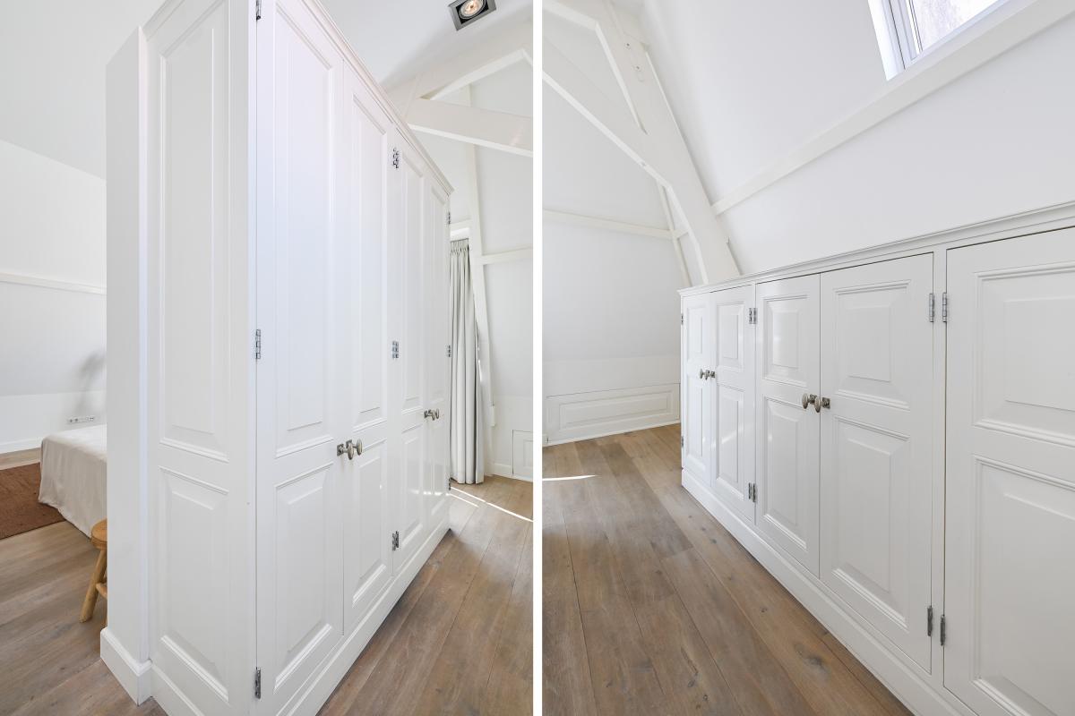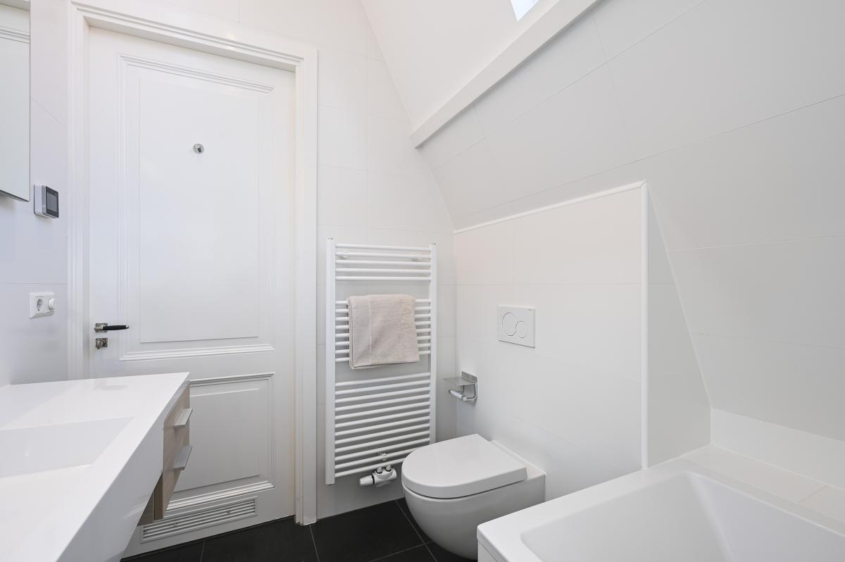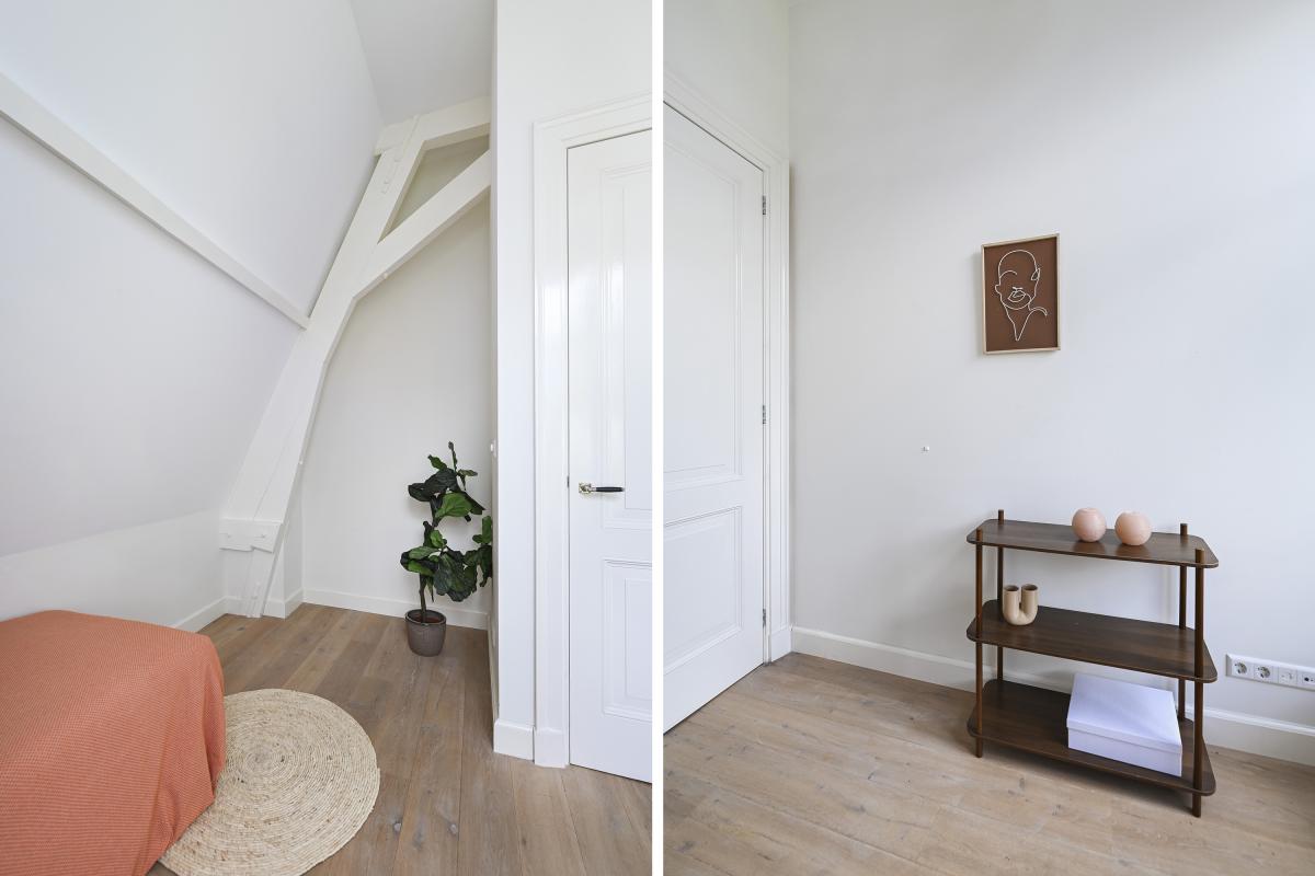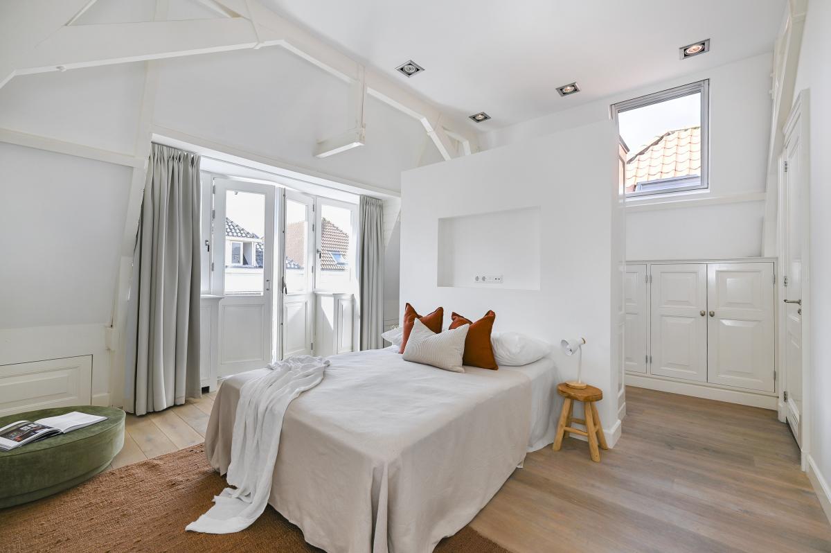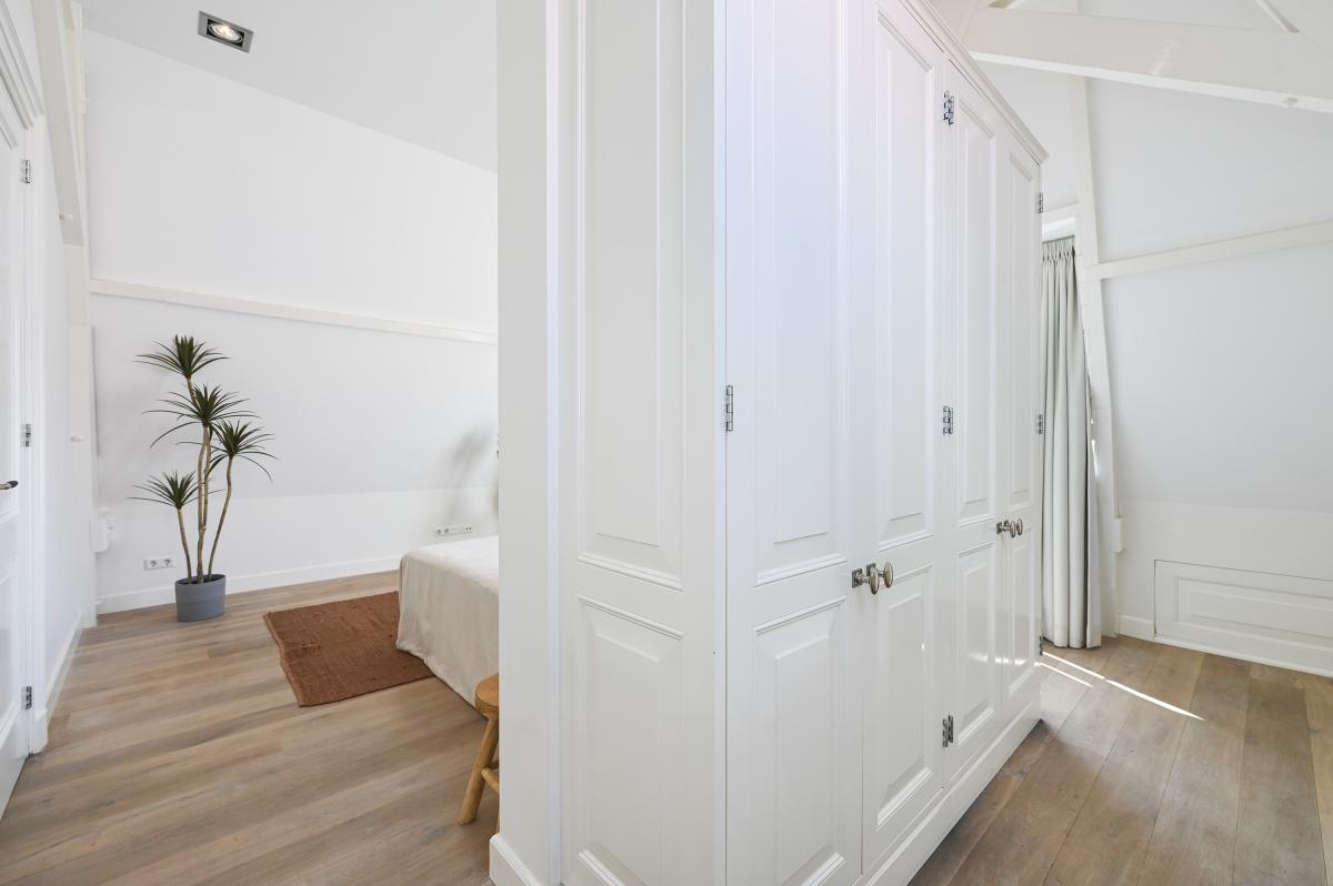Trap naar de tweede verdieping, alwaar u eerst op een royale overloopkomt, die door de ramen zeer licht van opzet is. Aan de overloop bevindt zich een modern, separaat toilet met fontein en de eerste badkamer, die is voorzien van een inloopdouche en wastafelmeubel. Aan de voorzijde is de hoofdslaapkamer gelegen, over de volle breedte van de woning met de originele spantenconstructie nog in het zicht. De slaapkamer is voorzien van een tussenwandwand met aansluiting voor een televisie en daarachter bevindt zich de dressing room met veel kasten aan weerszijden. Aan de voorzijde bevinden zich openslaande deuren naar een Frans balkon en een leuk detail hier is de nog aanwezige originele hijsbalk. De hoofdslaapkamer heeft een eigen, moderne badkamer die is voorzien van inloopdouche, toilet, ligbad en wastafelmeubel. Aan de achterzijde van het huis bevinden zich nog twee ruime slaapkamers van ca. 12,5 m² en ca. 11 m².