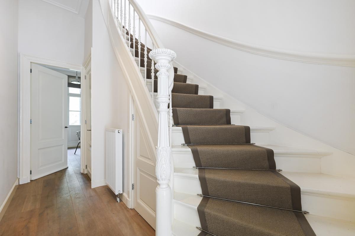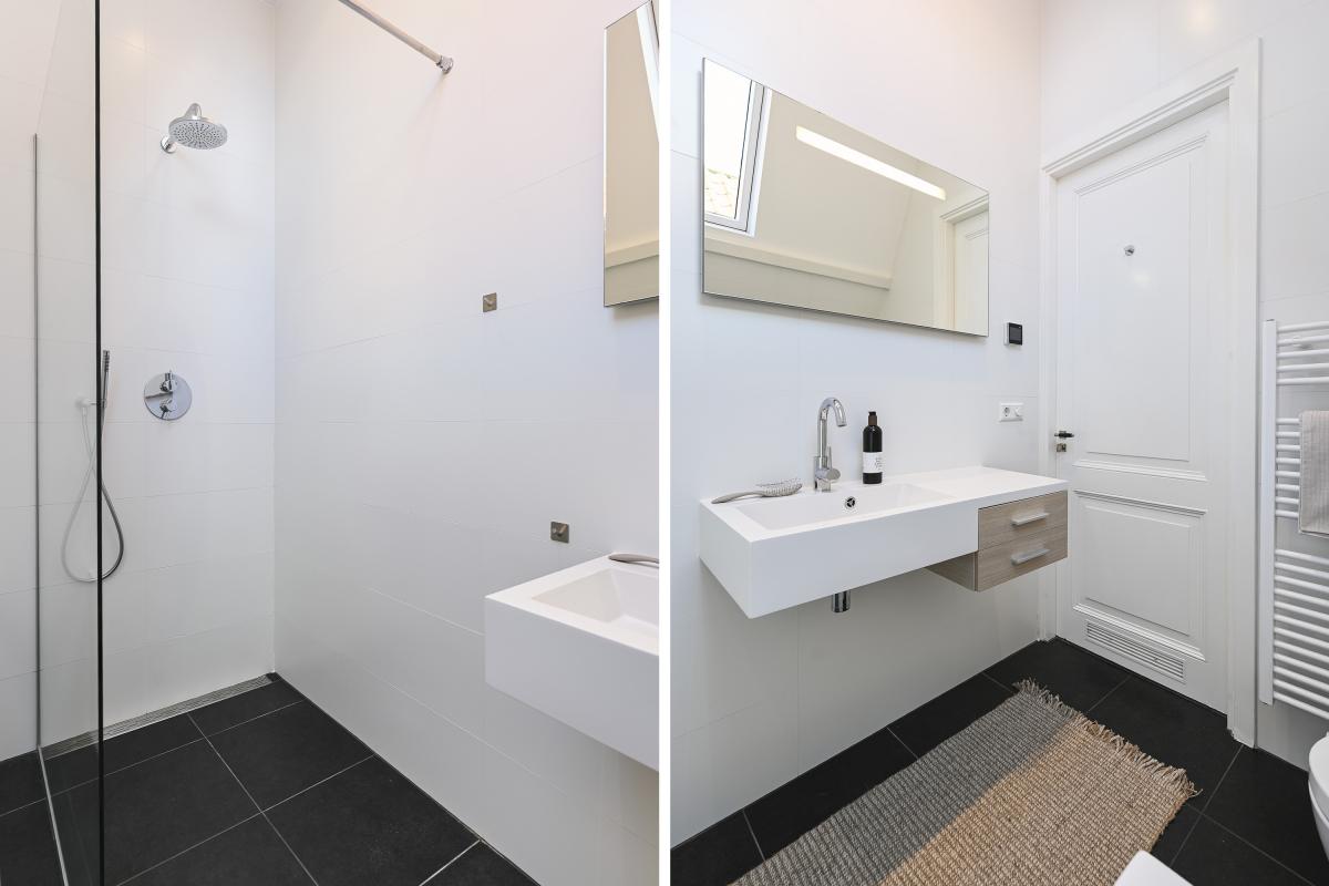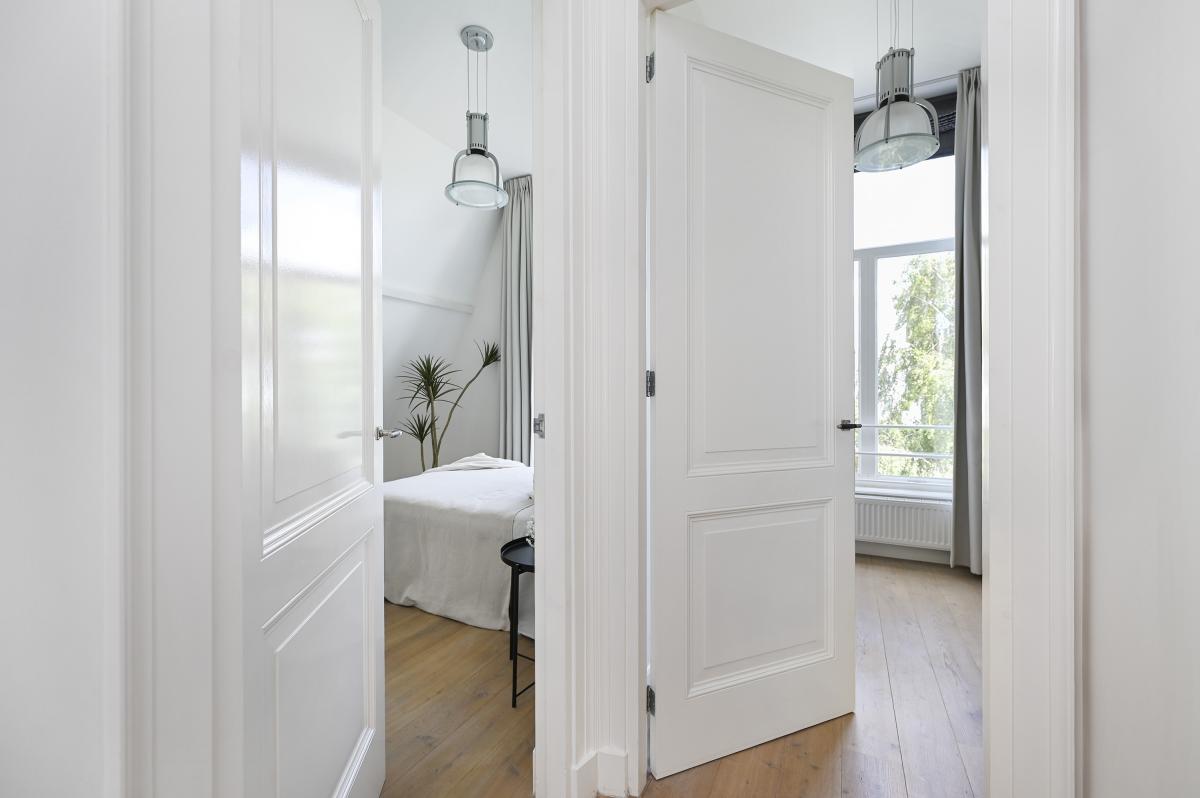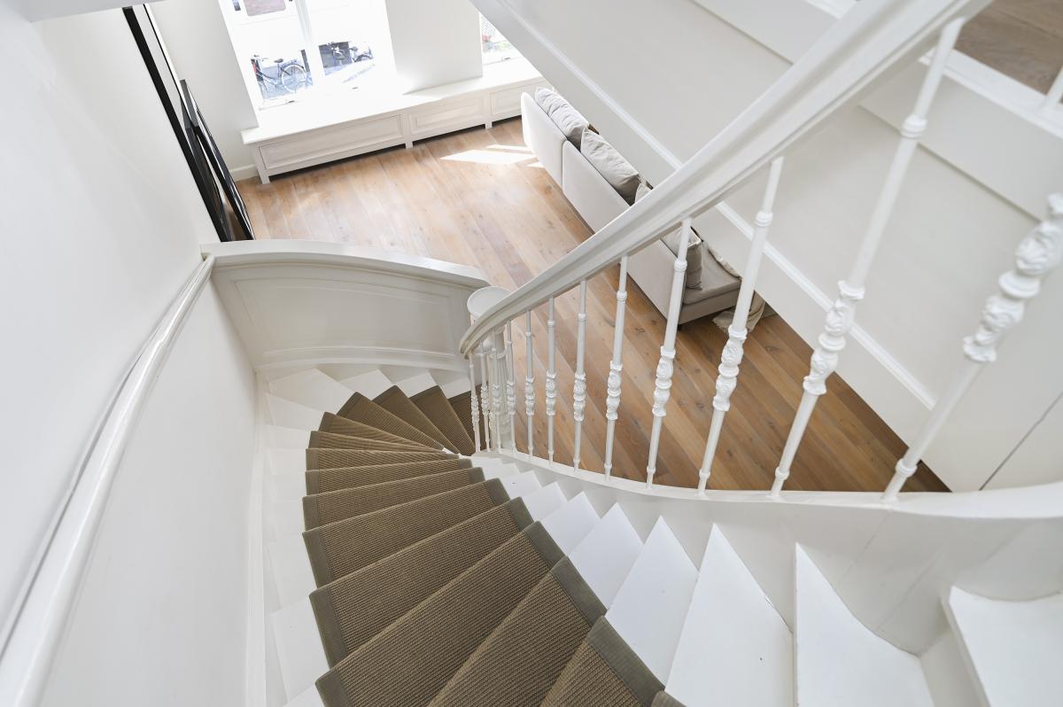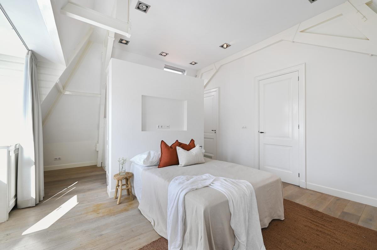 Trap naar de tweede verdieping, alwaar u eerst op een royale overloopkomt, die door de ramen zeer licht van opzet is. Aan de overloop bevindt zich een modern, separaat toilet met fontein en de eerste badkamer, die is voorzien van een inloopdouche en wastafelmeubel. Aan de voorzijde is de hoofdslaapkamer gelegen, over de volle breedte van de woning met de originele spantenconstructie nog in het zicht. De slaapkamer is voorzien van een tussenwandwand met aansluiting voor een televisie en daarachter bevindt zich de dressing room met veel kasten aan weerszijden. Aan de voorzijde bevinden zich openslaande deuren naar een Frans balkon en een leuk detail hier is de nog aanwezige originele hijsbalk. De hoofdslaapkamer heeft een eigen, moderne badkamer die is voorzien van inloopdouche, toilet, ligbad en wastafelmeubel. Aan de achterzijde van het huis bevinden zich nog twee ruime slaapkamers van ca. 12,5 m² en ca. 11 m².