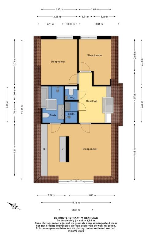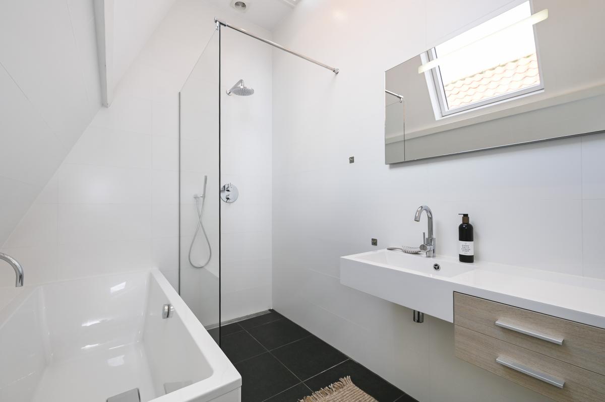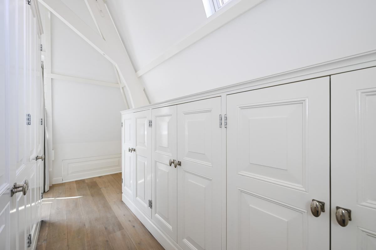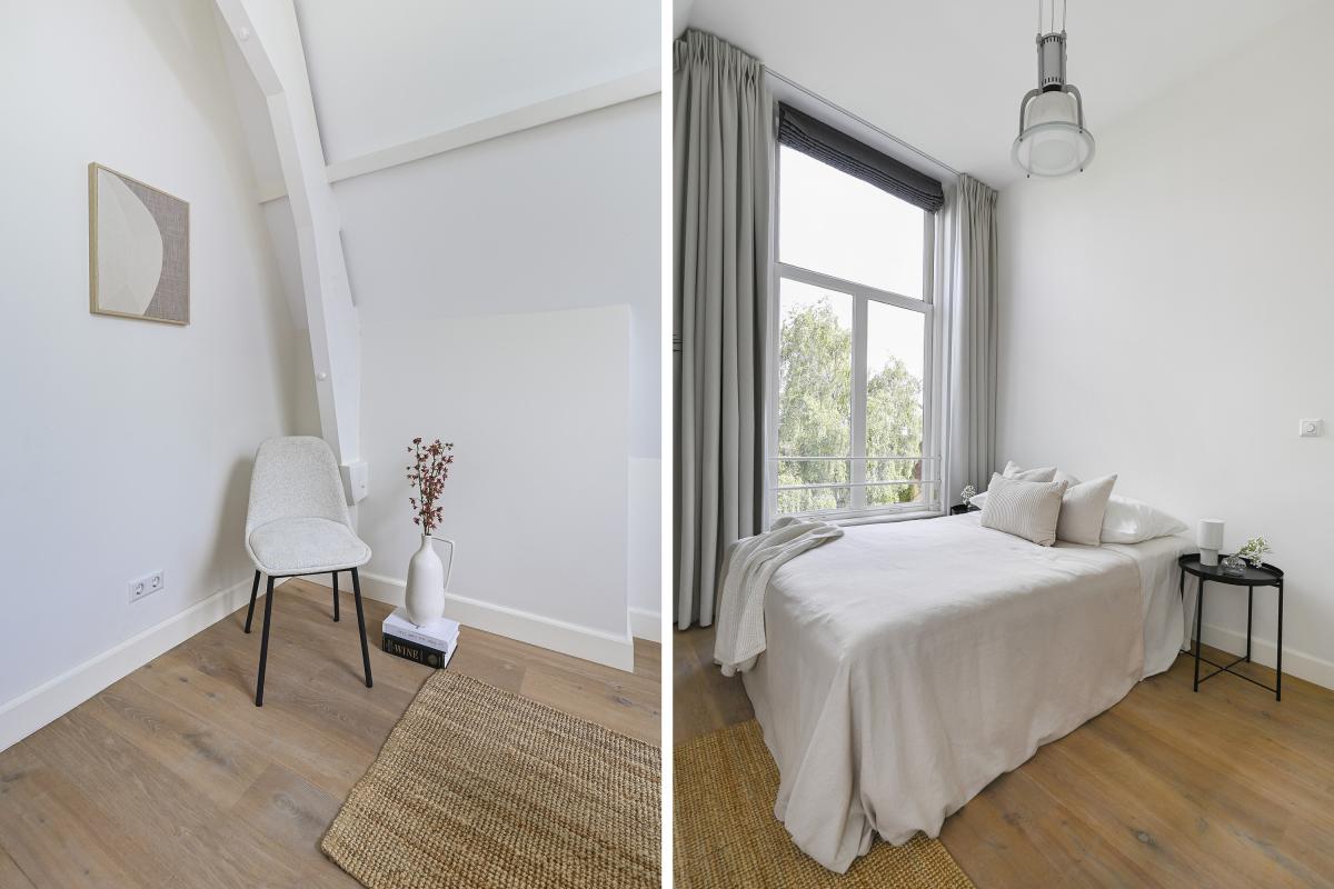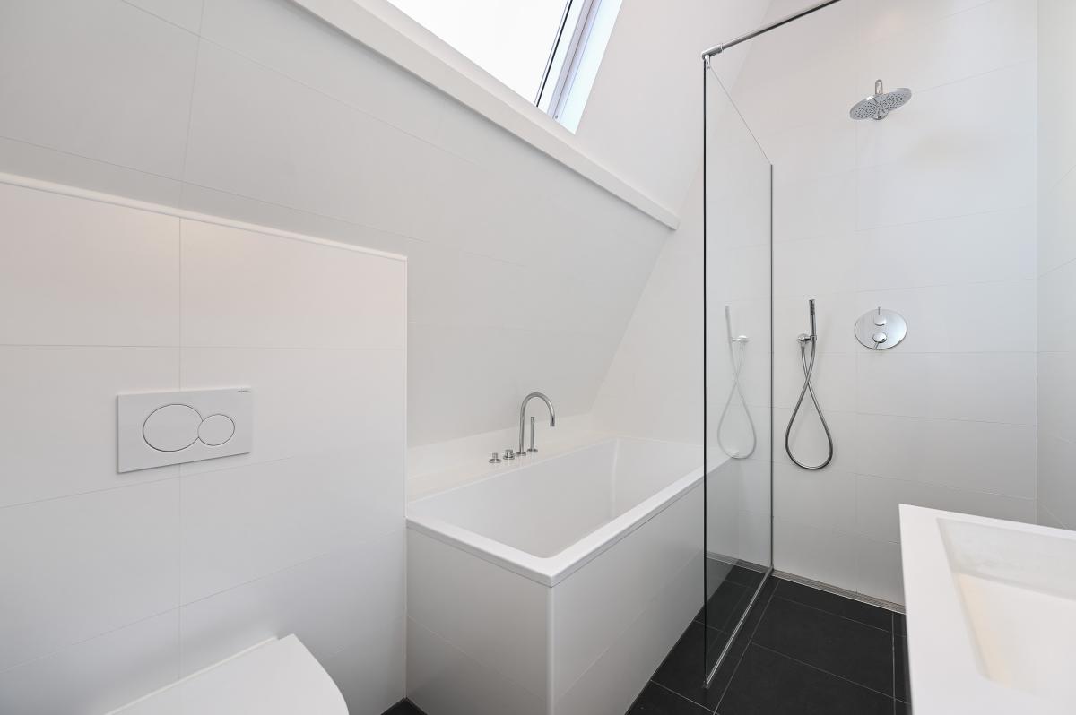 Trap naar de tweede verdieping, alwaar u eerst op een royale overloopkomt, die door de ramen zeer licht van opzet is. Aan de overloop bevindt zich een modern, separaat toilet met fontein en de eerste badkamer, die is voorzien van een inloopdouche en wastafelmeubel. Aan de voorzijde is de hoofdslaapkamer gelegen, over de volle breedte van de woning met de originele spantenconstructie nog in het zicht. De slaapkamer is voorzien van een tussenwandwand met aansluiting voor een televisie en daarachter bevindt zich de dressing room met veel kasten aan weerszijden. Aan de voorzijde bevinden zich openslaande deuren naar een Frans balkon en een leuk detail hier is de nog aanwezige originele hijsbalk. De hoofdslaapkamer heeft een eigen, moderne badkamer die is voorzien van inloopdouche, toilet, ligbad en wastafelmeubel. Aan de achterzijde van het huis bevinden zich nog twee ruime slaapkamers van ca. 12,5 m² en ca. 11 m².