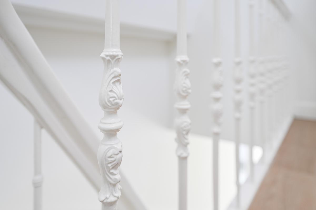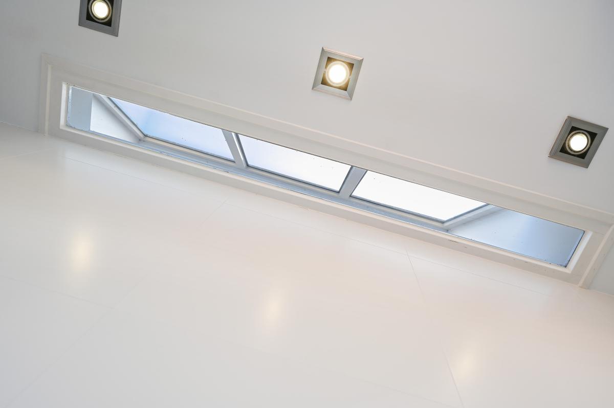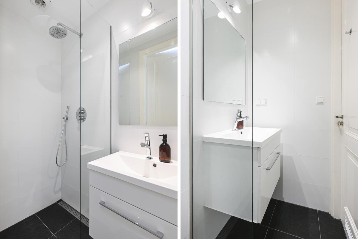 Stairs lead to the second floor, where you first arrive at a spacious landing, wth loads of natural light thanks to the roof windows. Onto the landing is a modern, separate toilet with a hand basin and adjacent the first bathroom, which features a walk-in shower and sink. At the front is the master bedroom, spanning the full width of the house, with the original trusses still visible. The bedroom features a partition wall with a television connection, and behind it is a dressing room with ample closet space on either side. At the front, French doors open onto a French balcony, and a charming detail here is the original hoisting beam. The master bedroom has its own modern bathroom with a walk-in shower, toilet, bathtub, and vanity. At the rear of the house are two spacious bedrooms, of approximately 12.5 m² and 11 m².