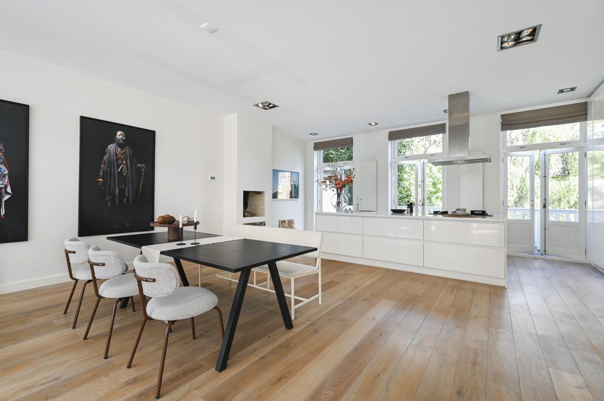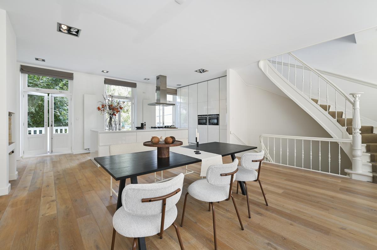A wide, gentle staircase, featuring beautiful original ornamented balusters, leads to the very spacious living room with open-plan kitchen on the first floor. This floor spans a generous 76 m² and, thanks to its open plan, offers a wonderful sense of space. For a cozy atmosphere, you'll find a wood-burning fireplace and a gas fireplace. The kitchen features a large island with a composite countertop and a tall wall of cabinets. The kitchen is equipped with various built-in appliances, including a Quooker, dishwasher, 5-burner gas stove, extractor hood, refrigerator, freezer, convection oven, and combination microwave/oven. At the rear, two sets of French doors open onto a spacious terrace spanning the entire width of the house.