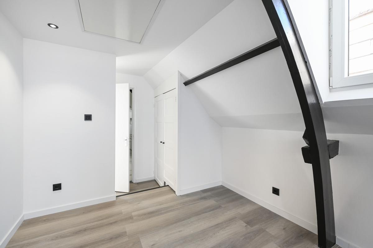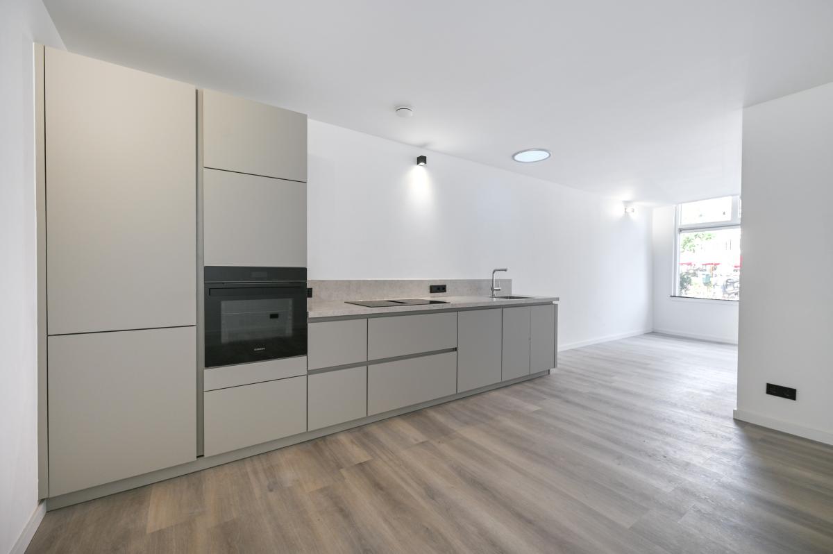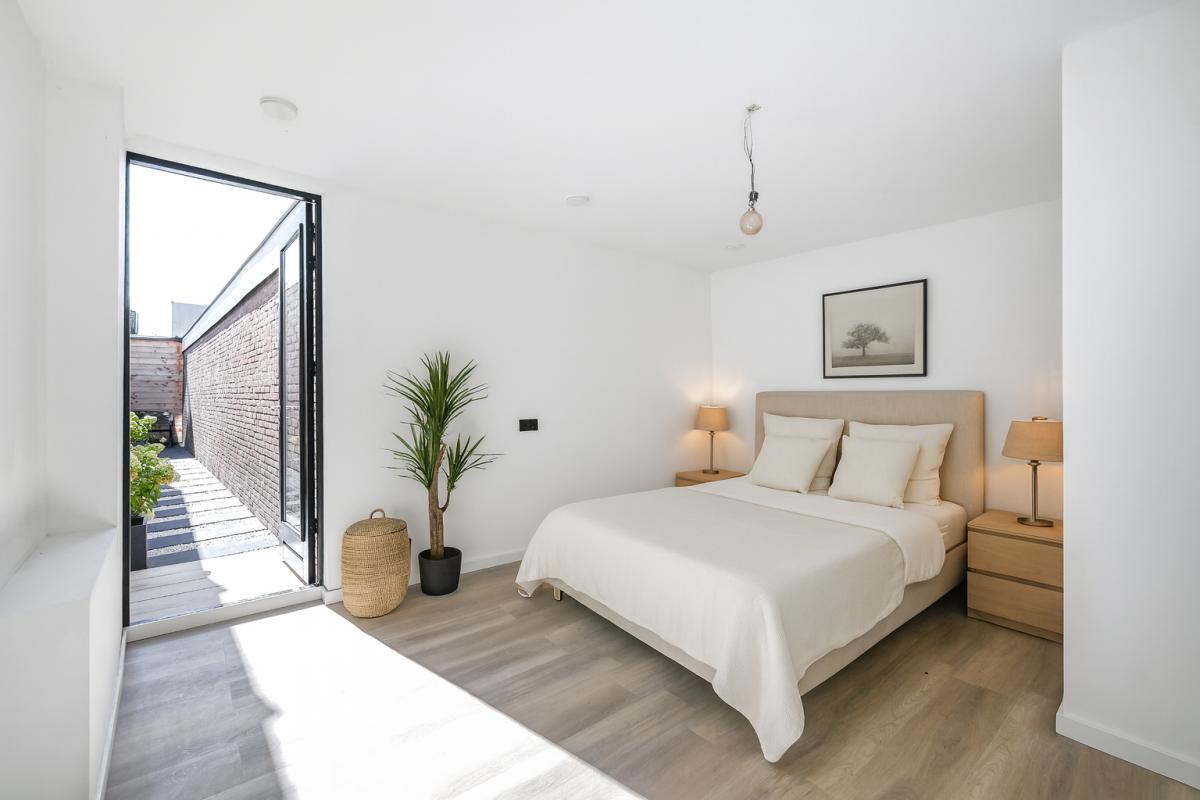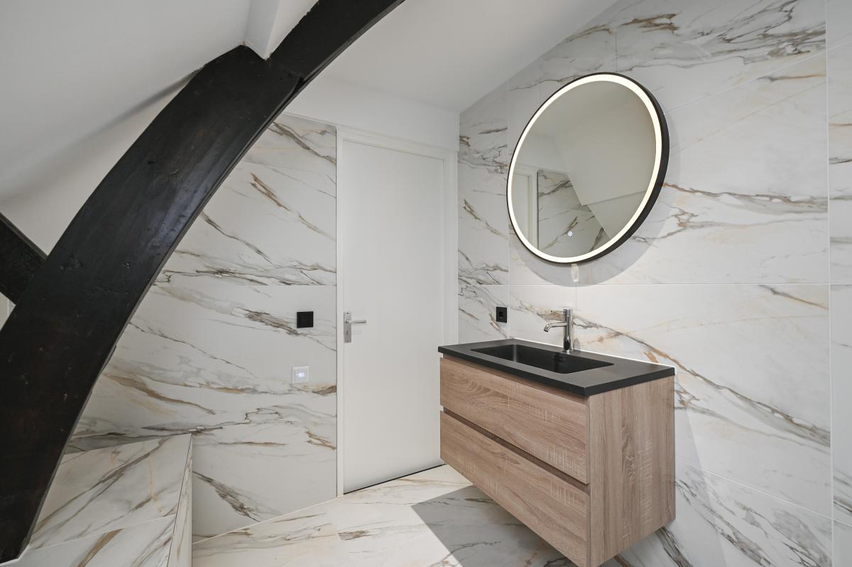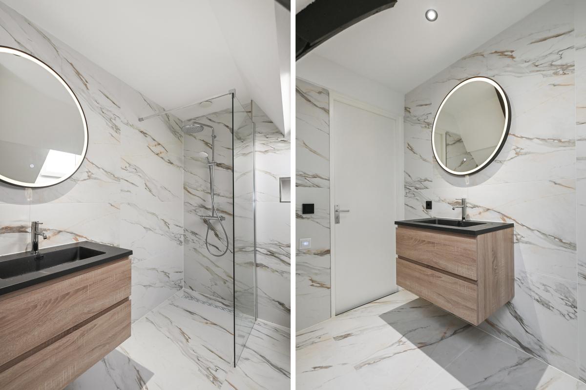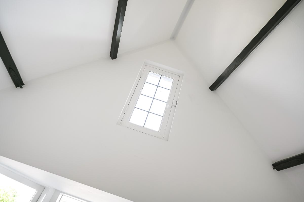 The layout: Spacious, bright entrance hall with a small staircase on the left leading to a spacious toilet with a wall-hung toilet and vanity. From the hall, you reach the L-shaped kitchen/diner. There is room for a seating area at the front. At the rear, the kitchen/diner is a generous 5.40 meters wide, providing ample space for a large dining table. Two Sola-tubes provide this part of the room with additional natural light. The new kitchen unit is placed against the wall. It features a composite countertop and various built-in appliances, including a fridge/freezer, oven, dishwasher, and induction cooktop with a built-in extractor fan. A basement is also accessible from the kitchen, providing storage space and space for the washing machine. At the rear of the kitchen, you reach the first bedroom of approximately 17 m². This bedroom has an en-suite bathroom with a walk-in shower and vanity. From this bedroom, you can access the outdoor area, which consists of a path that leads to a small courtyard.
