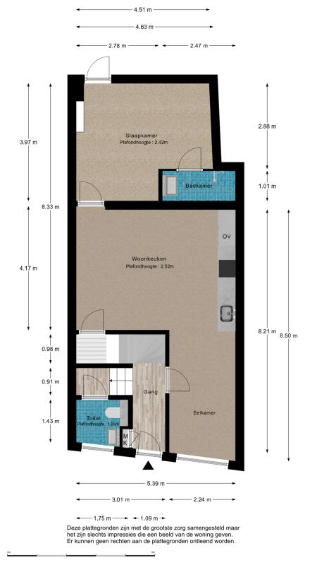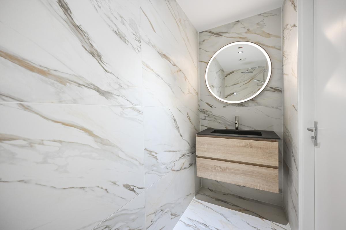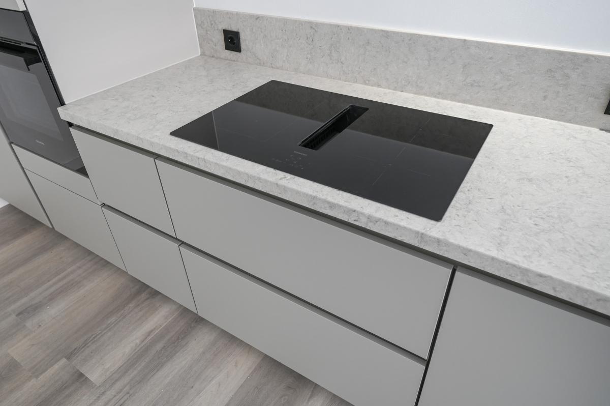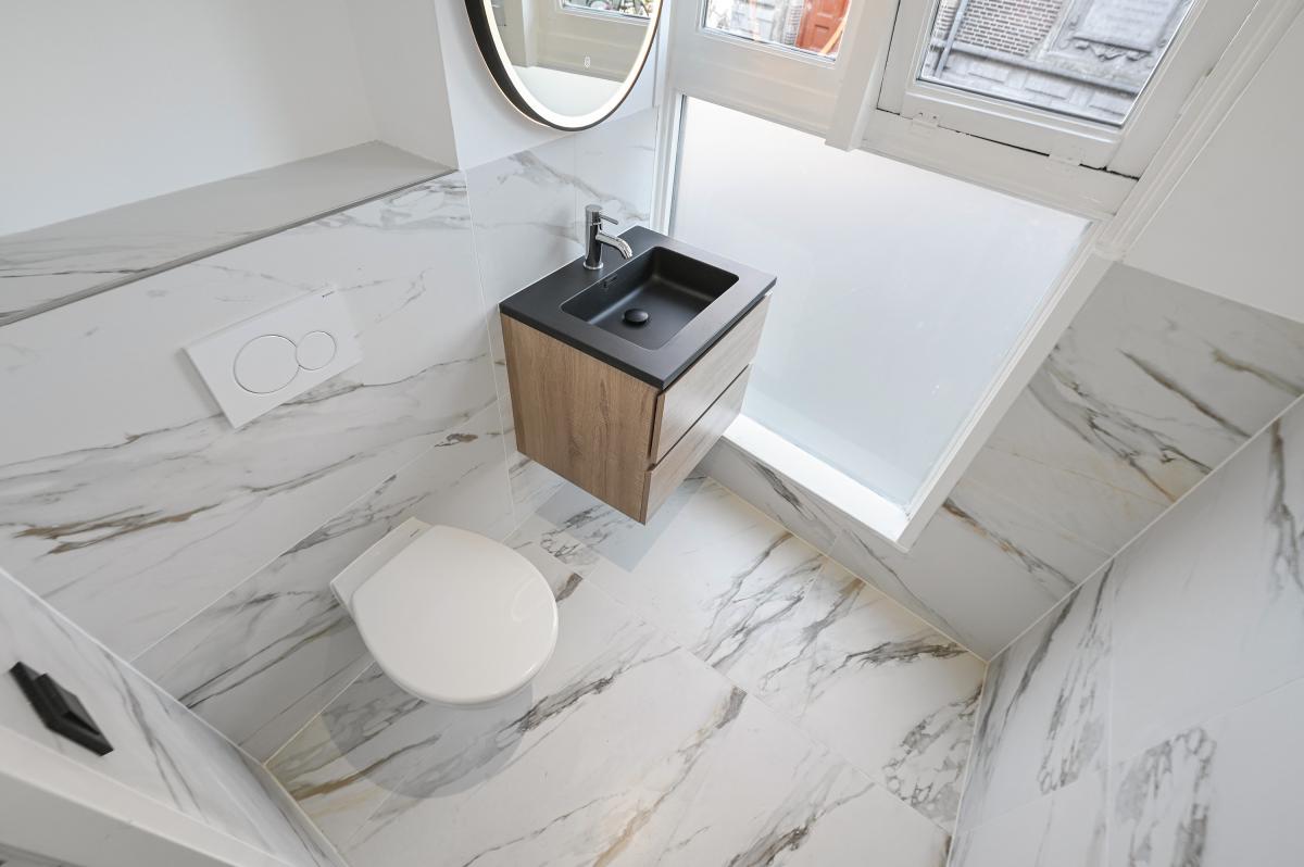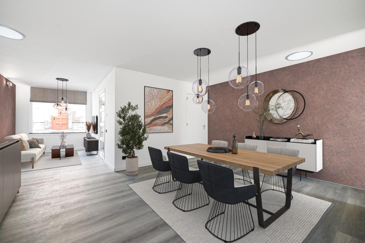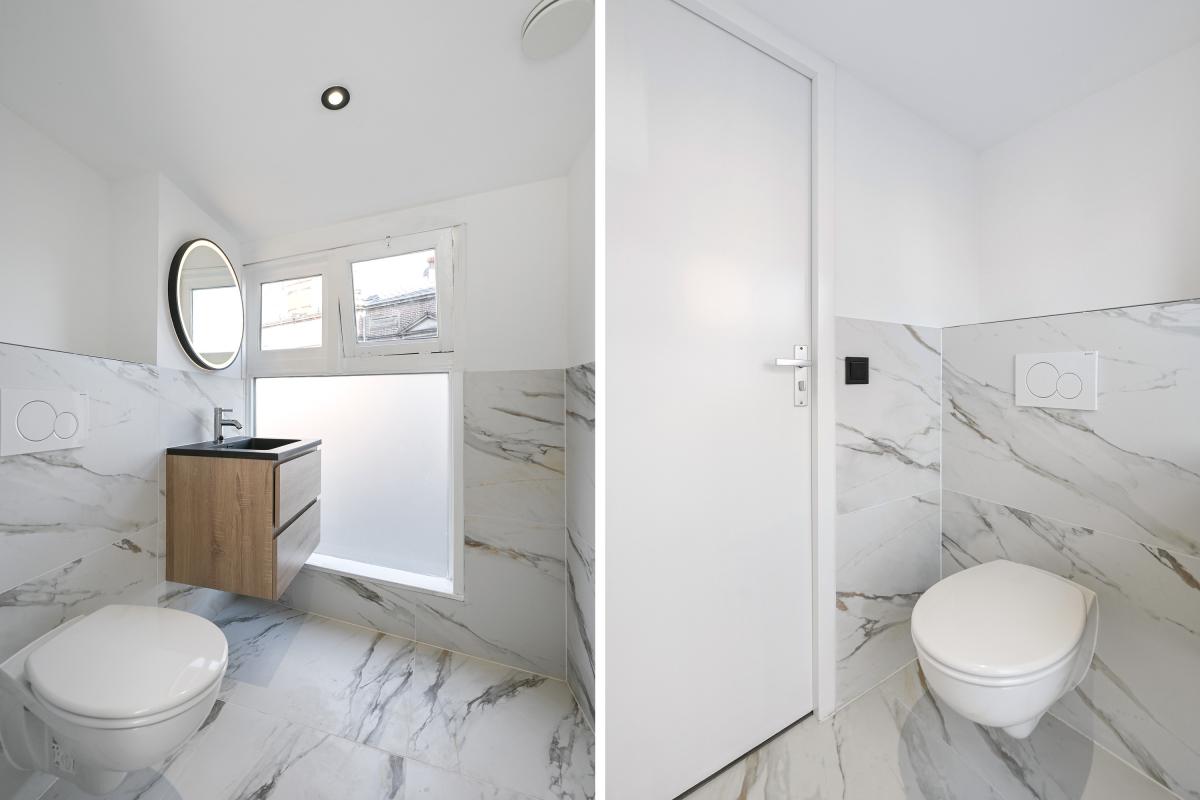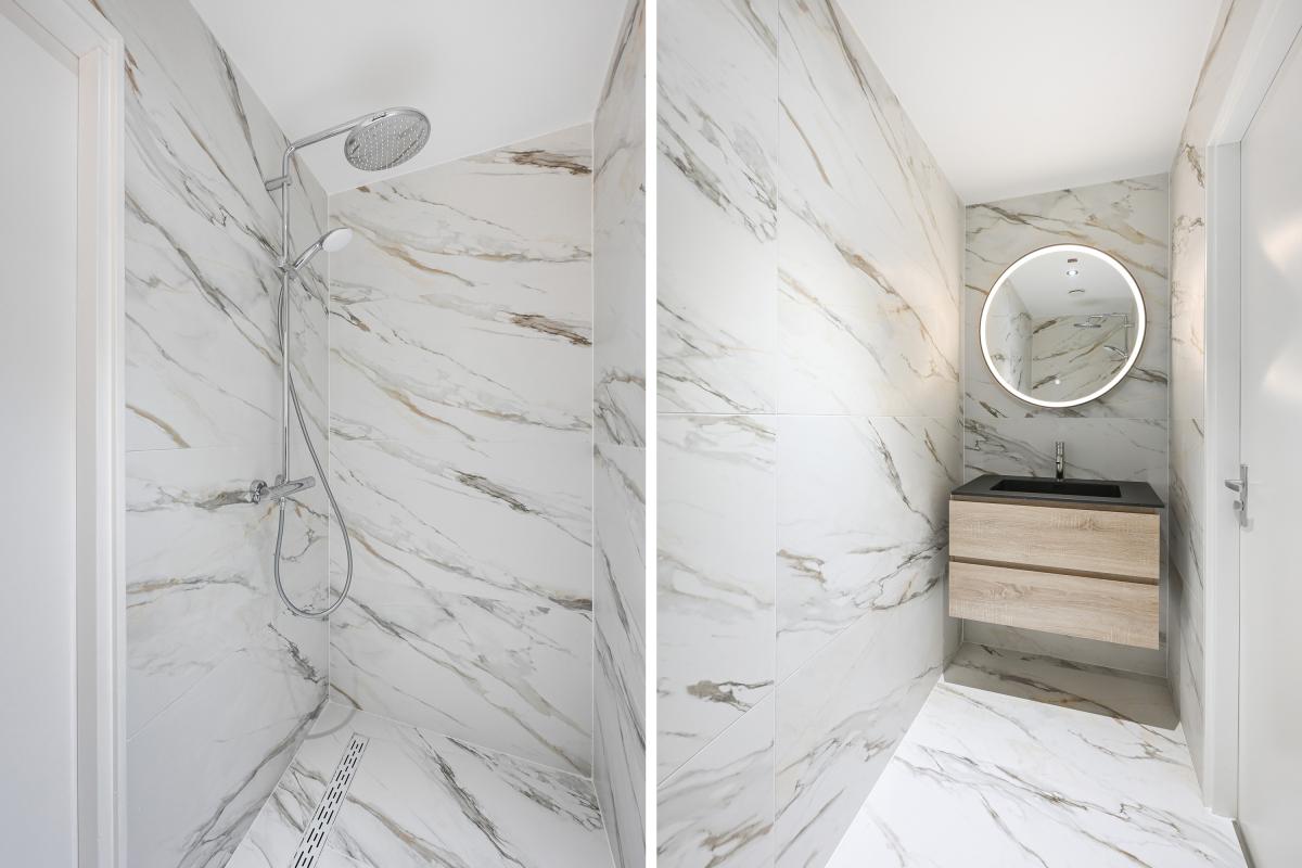 The layout: Spacious, bright entrance hall with a small staircase on the left leading to a spacious toilet with a wall-hung toilet and vanity. From the hall, you reach the L-shaped kitchen/diner. There is room for a seating area at the front. At the rear, the kitchen/diner is a generous 5.40 meters wide, providing ample space for a large dining table. Two Sola-tubes provide this part of the room with additional natural light. The new kitchen unit is placed against the wall. It features a composite countertop and various built-in appliances, including a fridge/freezer, oven, dishwasher, and induction cooktop with a built-in extractor fan. A basement is also accessible from the kitchen, providing storage space and space for the washing machine. At the rear of the kitchen, you reach the first bedroom of approximately 17 m². This bedroom has an en-suite bathroom with a walk-in shower and vanity. From this bedroom, you can access the outdoor area, which consists of a path that leads to a small courtyard.