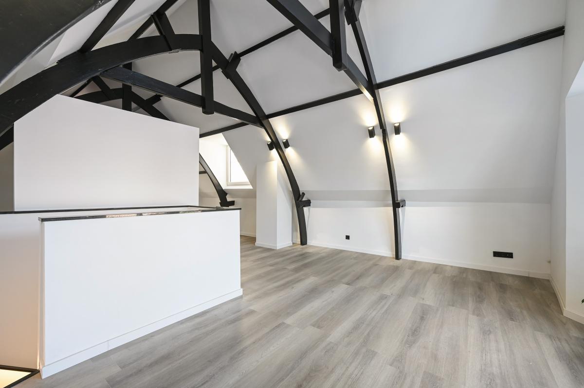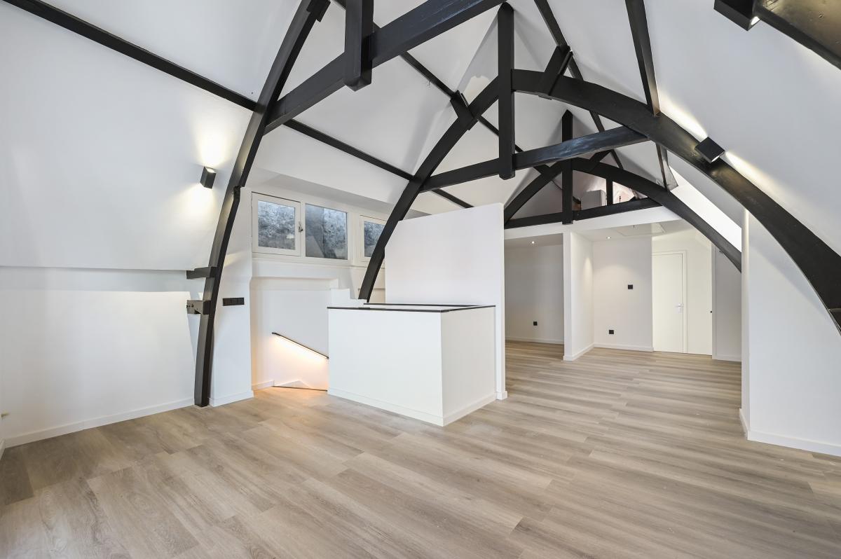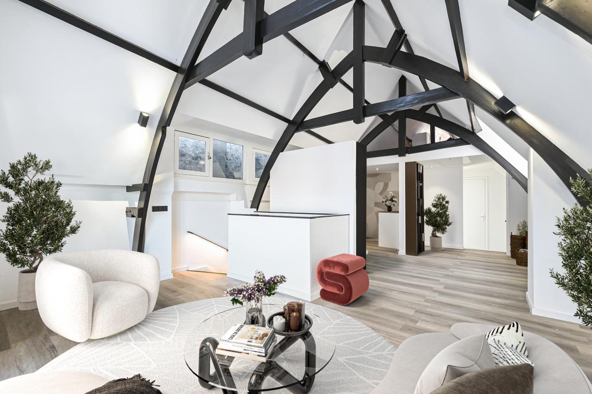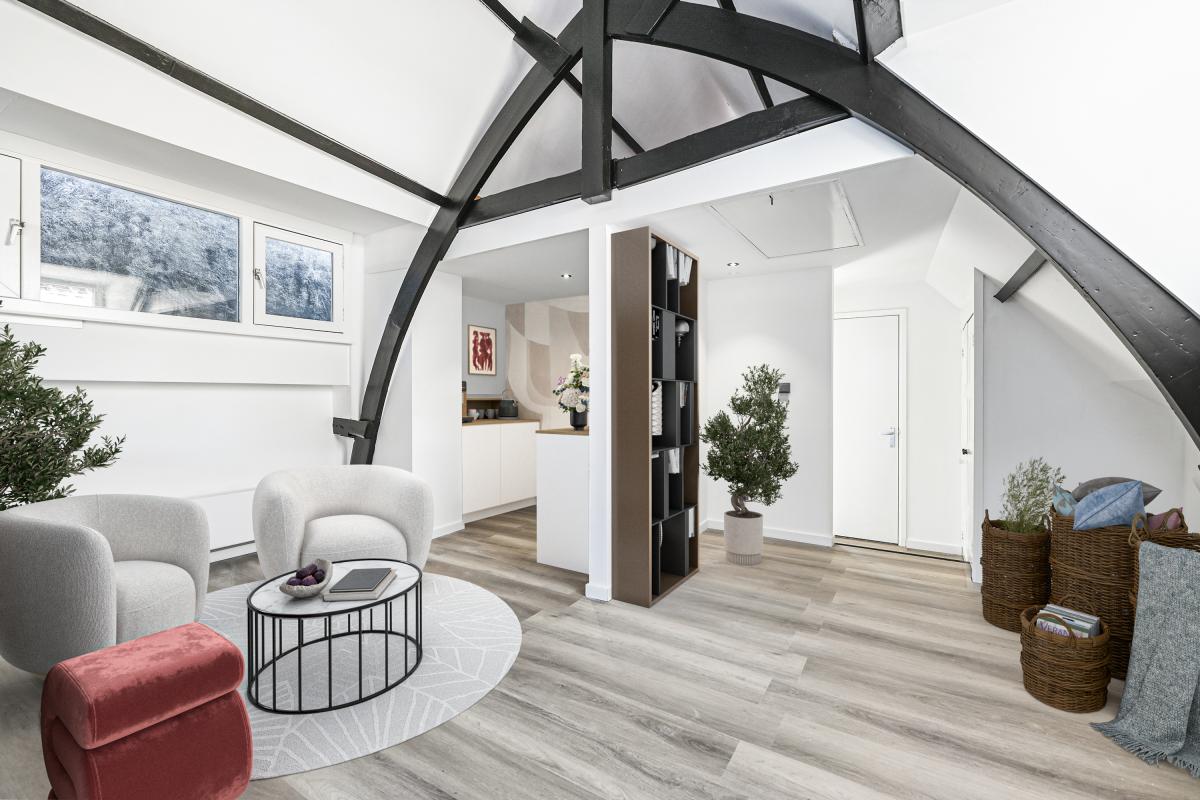 From the entrance hall, a staircase with illuminated banisters provides access to the first floor. Here you'll find the living area, which features various zones, allowing everyone to customize the layout. The original truss structure is truly spectacular, and its height creates a great sense of space. A loft ladder leads to a storage attic where you'll also find the hybrid central heating boiler and the inverter for the solar panels. At the rear is the second bedroom (approx. 13 m²) with an adjacent second bathroom, equipped with a walk-in shower, vanity, toilet, and (electric) underfloor heating.