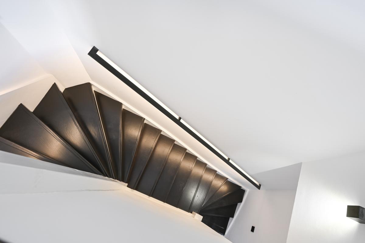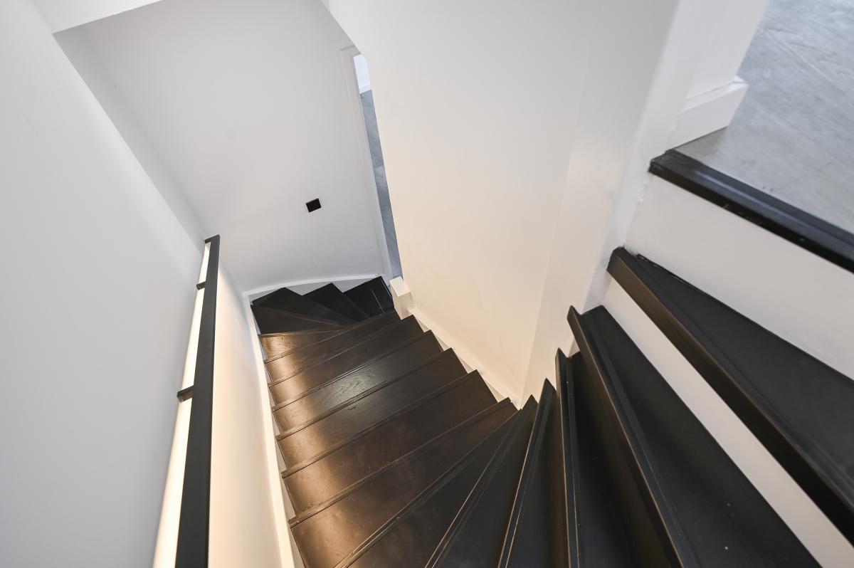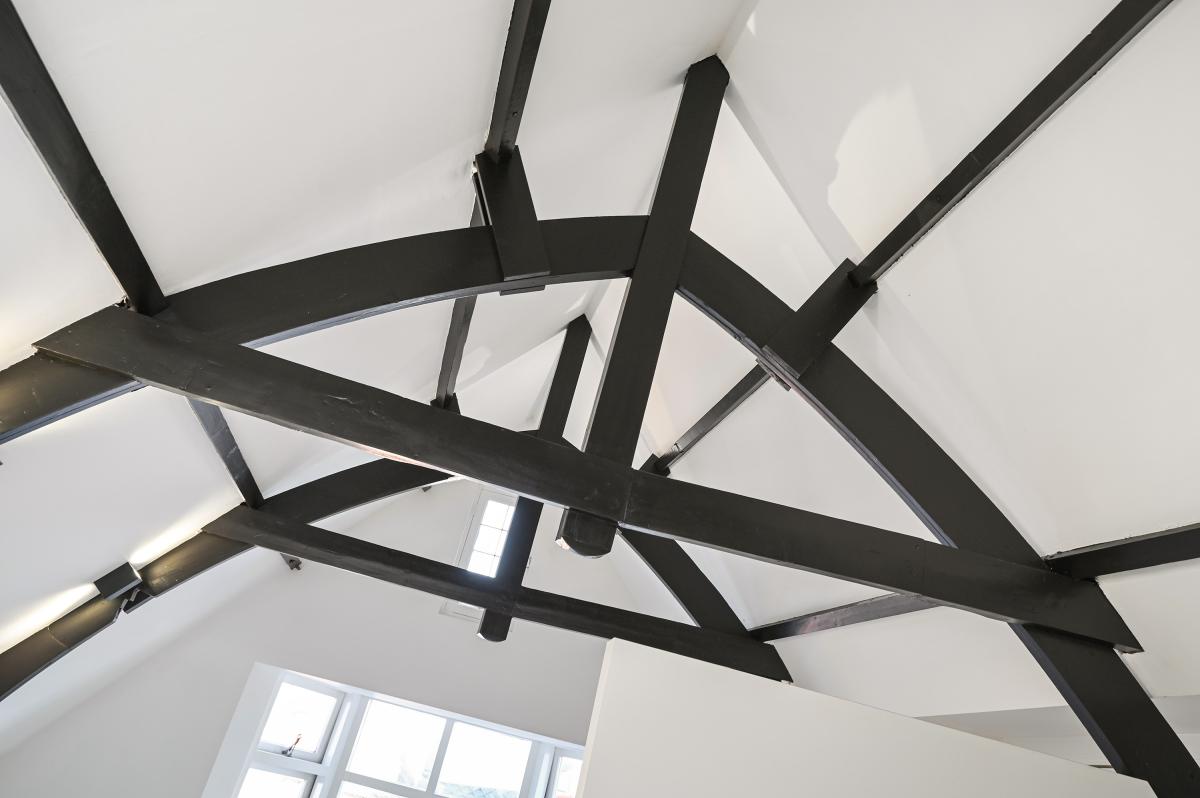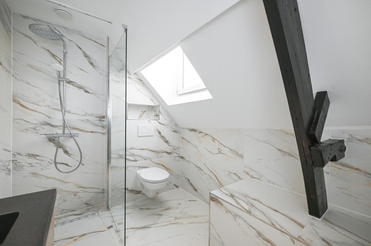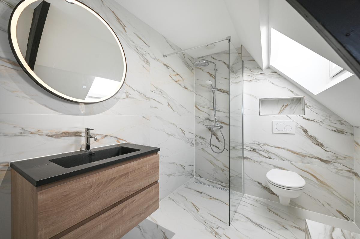 From the entrance hall, a staircase with illuminated banisters provides access to the first floor. Here you'll find the living area, which features various zones, allowing everyone to customize the layout. The original truss structure is truly spectacular, and its height creates a great sense of space. A loft ladder leads to a storage attic where you'll also find the hybrid central heating boiler and the inverter for the solar panels. At the rear is the second bedroom (approx. 13 m²) with an adjacent second bathroom, equipped with a walk-in shower, vanity, toilet, and (electric) underfloor heating.