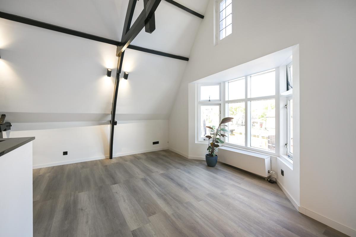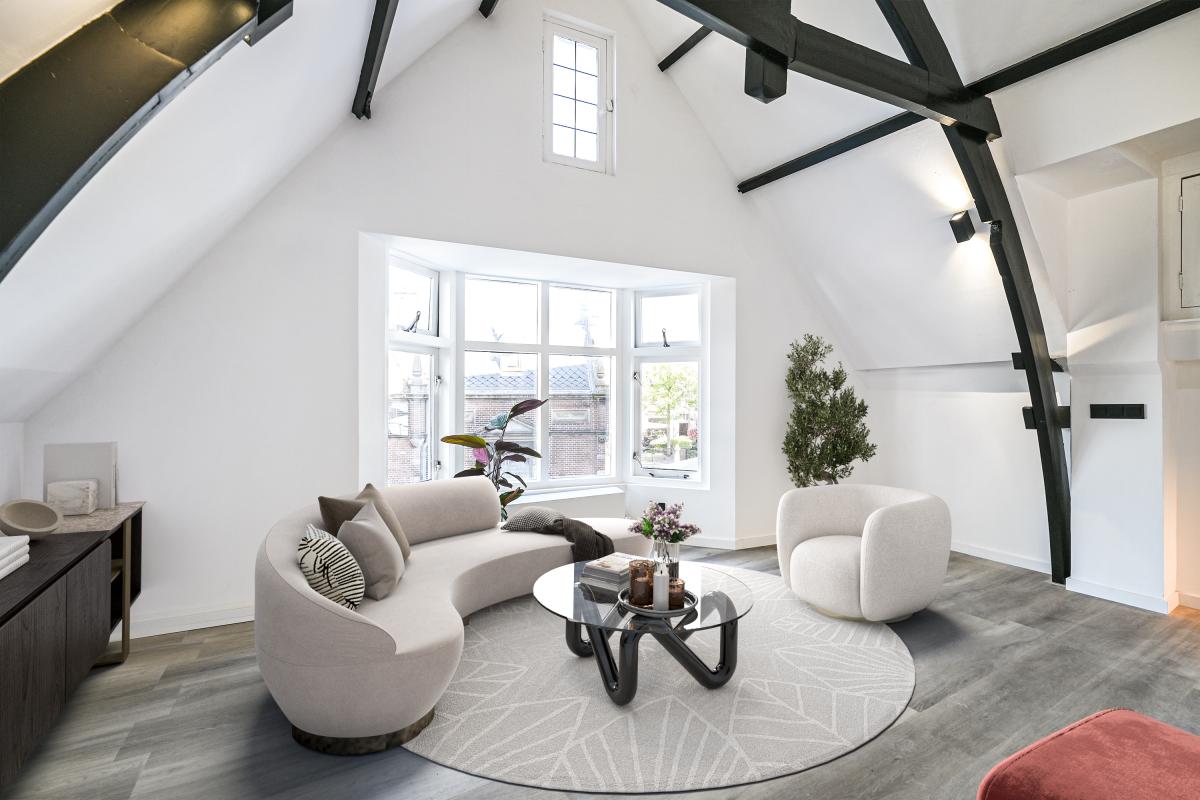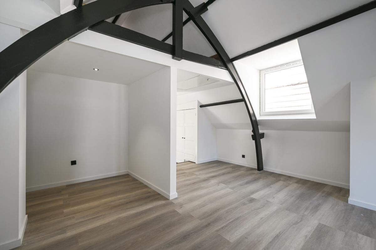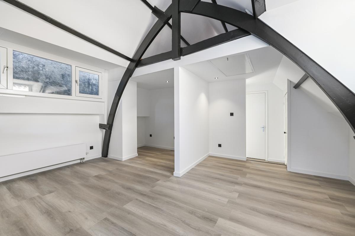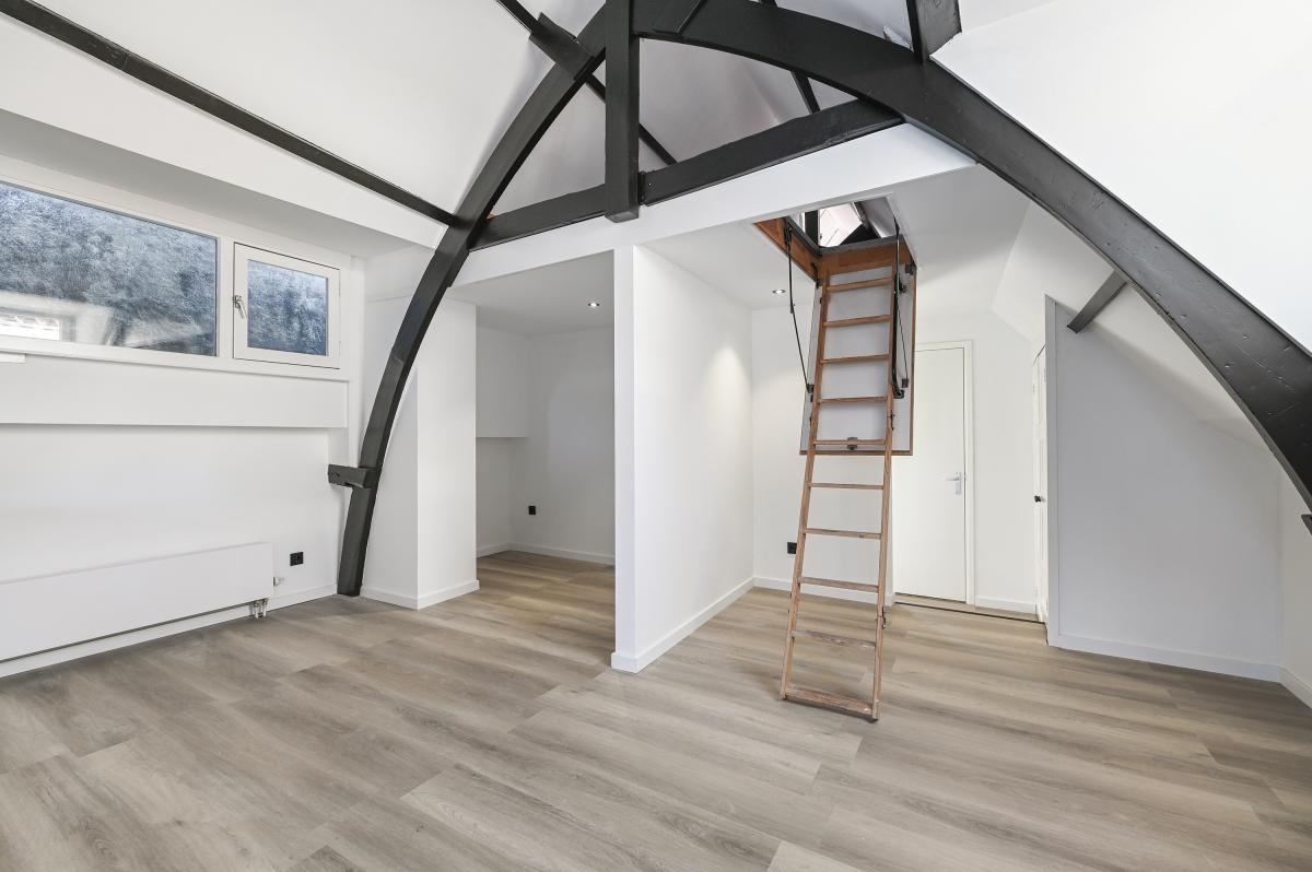 Vanuit de entreehal biedt een trap met verlichte trapleuningen toegang tot de eerste verdieping. Hier vindt u de woonruimte met verschillende zones en hoekjes, zodat iedereen de indeling op zijn eigen manier kan doen (zie artist impressions om u een idee te geven). De originele spantenconstructie is echte spectaculair en deze geeft door de hoogte een groot gevoel van ruimte. Via een vlizotrap is een bergzolder bereikbaar alwaar u ook de hybride c.v.-ketel vindt en de omvormer van de zonnepanelen. Aan de achterzijde bevindt zich de tweede slaapkamer (ca. 13 m²) met daarnaast gelegen tweede badkamer, die is voorzien van een inloopdouche, wastafel, toilet en (elektrische) vloerverwarming.