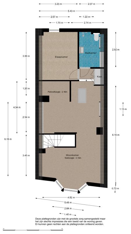 De indeling: Ruime, lichte entreehal met aan de linkerzijde een trapje naar een royaal toilet met vrij hangend closet en wastafelmeubel. Vanuit de hal is de L-vormige woonkeuken te bereiken. Hier is aan de voorzijde plaats voor een zitje. De achterzijde is de woonkeuken maar liefst 5,40 meter breed, waardoor hier een zee van ruimte is om een grote eettafel te plaatsen. Twee Sola-tubes voorzien dit gedeelte van de ruimte van extra daglichttoetreding. Tegen de wand is het nieuwe keukenblok geplaatst. Dit is voorzien van een composiet keukenblad en diverse inbouwapparatuur waaronder een koel-/vrieskombinatie, oven, vaatwasser en inductiekookplaat met ingebouwde afzuiging. Vanuit de keuken is tevens een souterrain bereikbaar t.b.v. opslagruimte en de opstelplaats voor de wasmachine. Aan de achterzijde van de keuken bereikt men de eerste slaapkamer van circa 17 m². Deze heeft een eigen badkamer met inloopdouche en wastafelmeubel. Vanuit deze slaapkamer is de buitenruimte te bereiken die bestaat uit een pad dat uitmondt in een plaatsje.