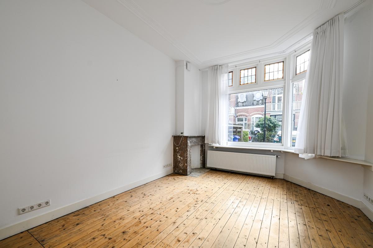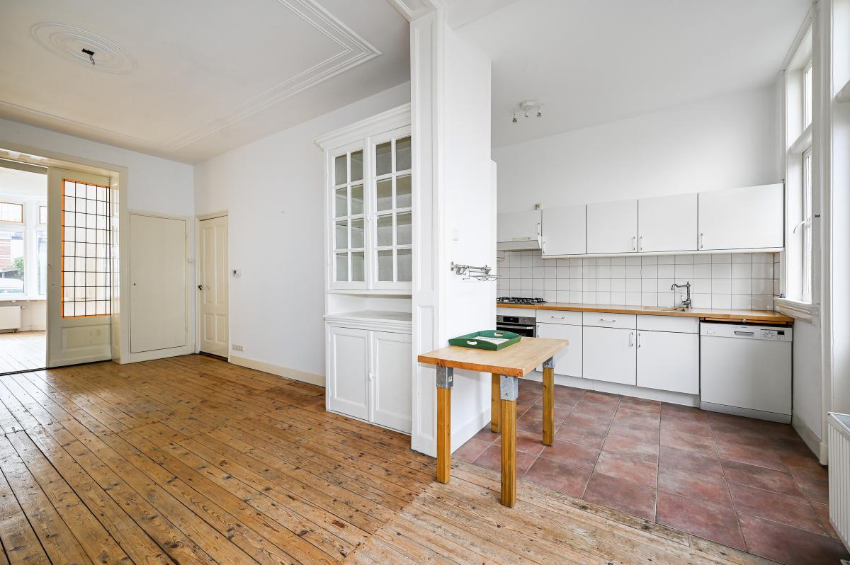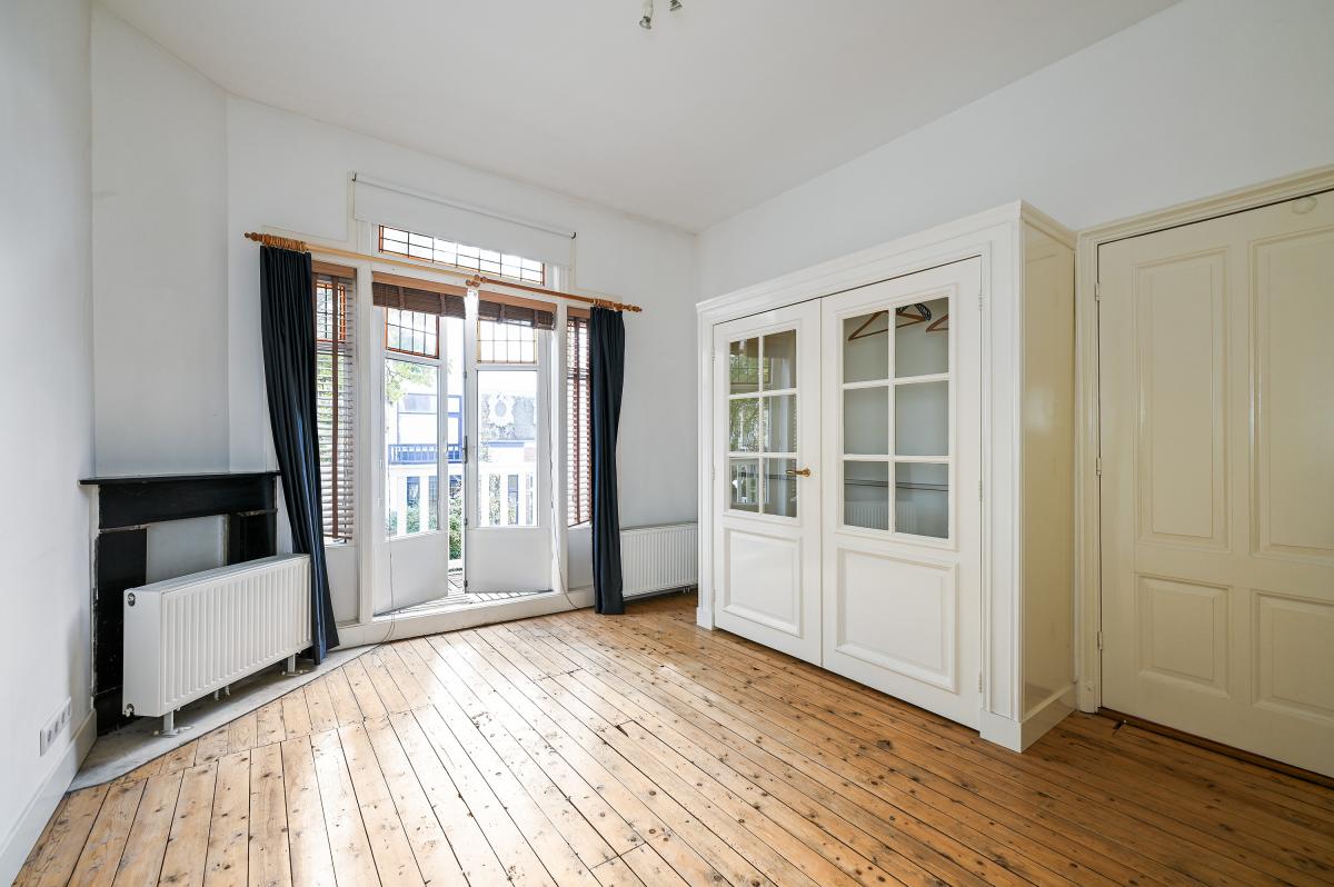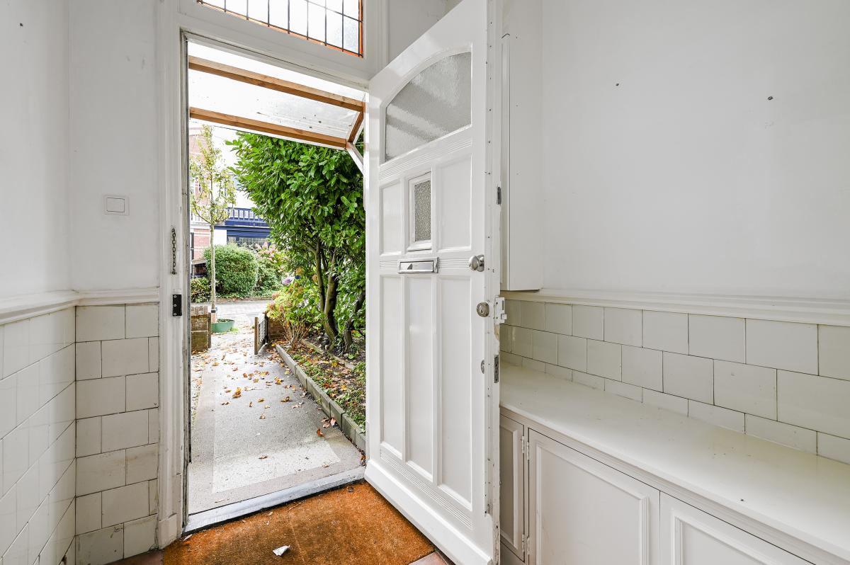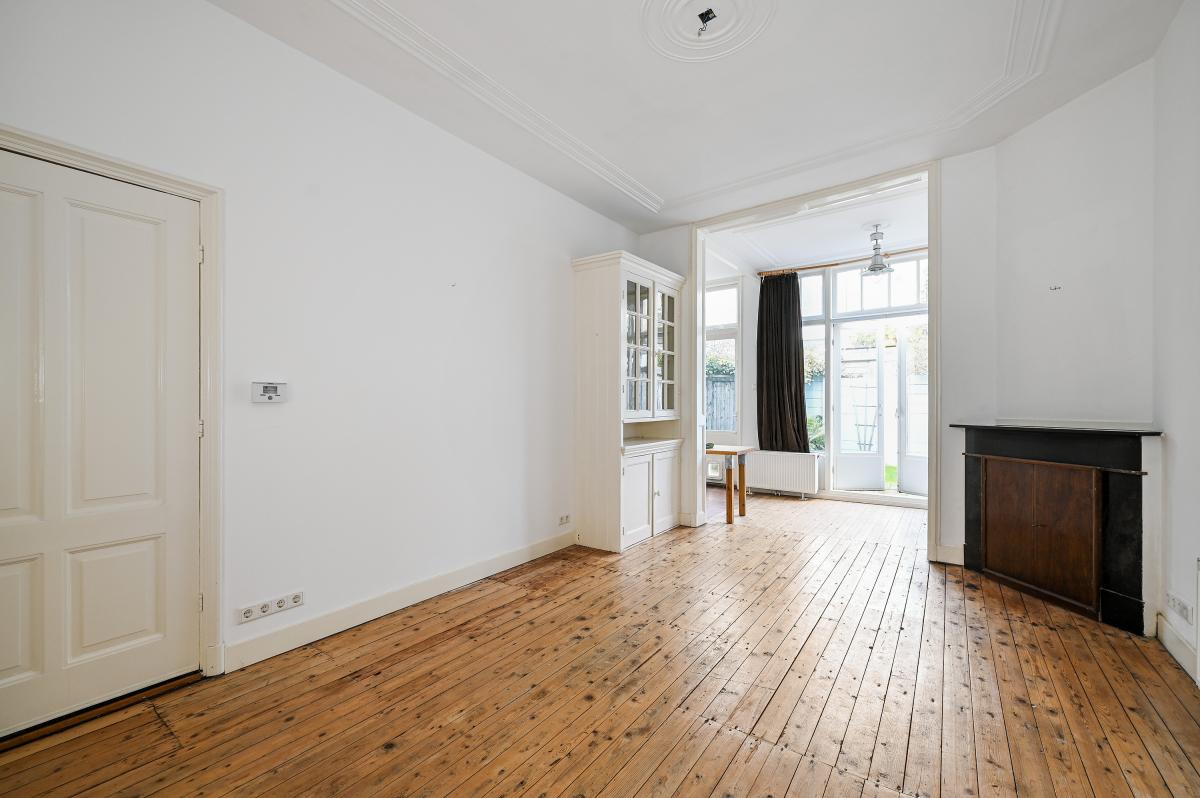 Layout: The entrance to the house is reached via the front garden. Vestibule with a closet and meter cupboard and beautiful door that leads to the hallway, which offers space under the stairs, a built-in closet, and a toilet with a small sink. In the hallway, two doors provide access to the front and back rooms of the en-suite rooms. These rooms still retain various period features, such as marble fireplaces, ceilings with molded ceilings and the original suite partition, which features sliding doors with stained glass and four built-in cupboards. At the rear is a conservatory, which has been opened up towards the kitchen. The kitchen, which is also accessible from the hallway, has a simple yet functional design and is equipped with some built-in appliances. The small back garden is accessible from the kitchen, as well as through French doors from the conservatory. This garden is approximately 5 meters deep and faces northwest. A storage room is located in the garden.
