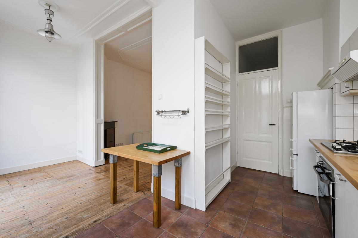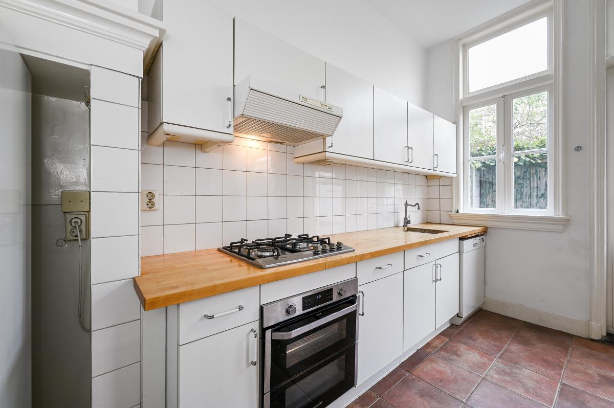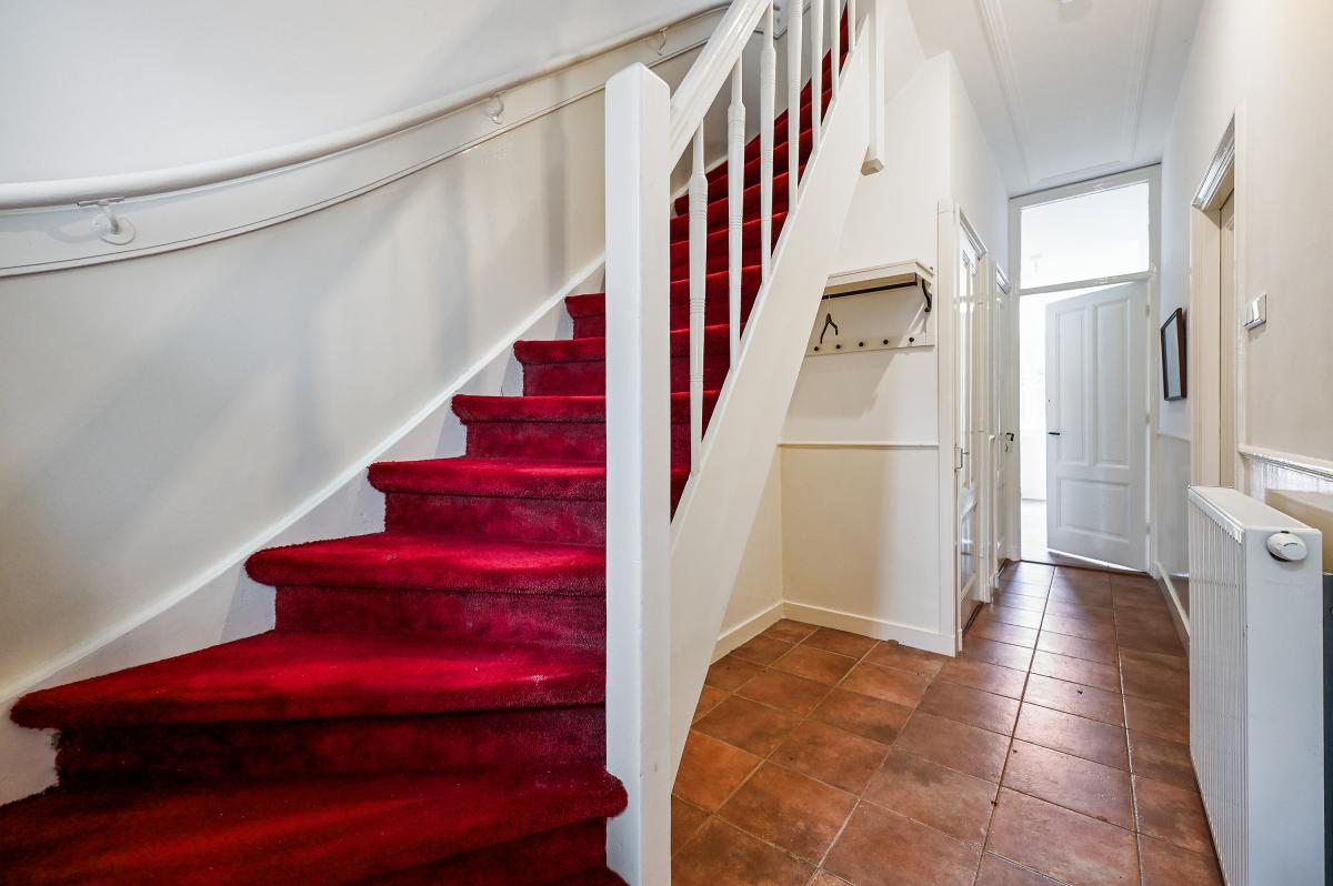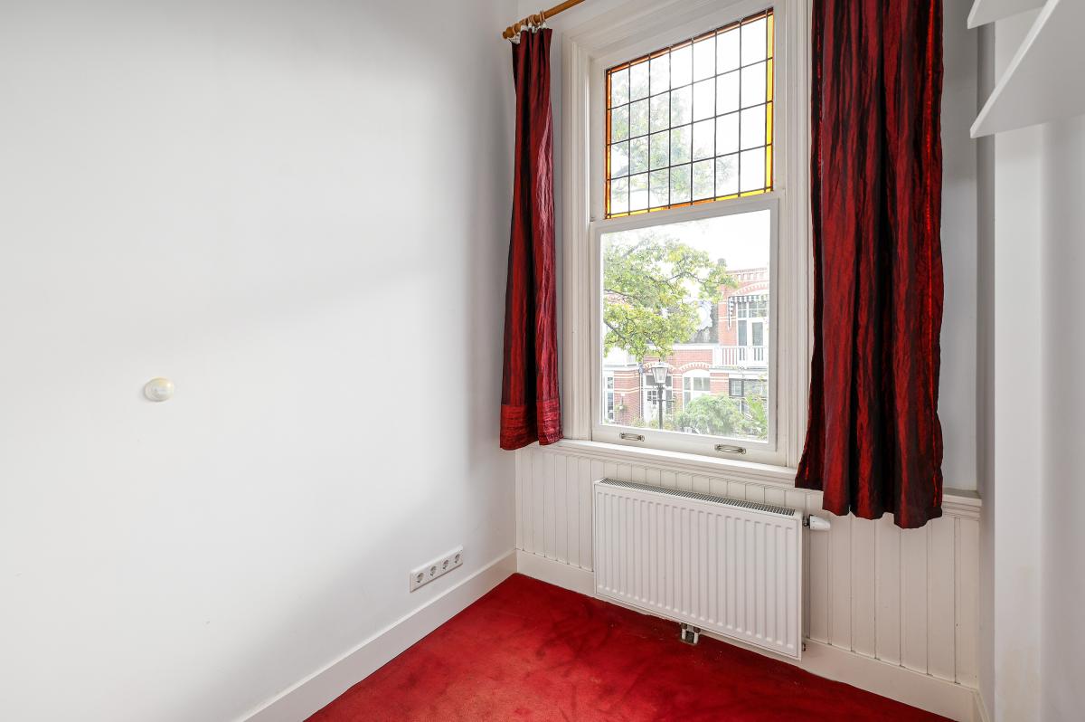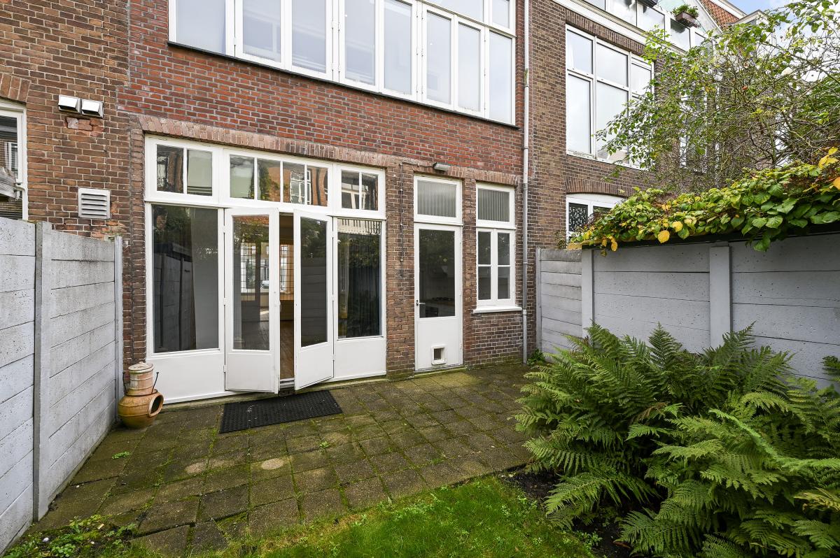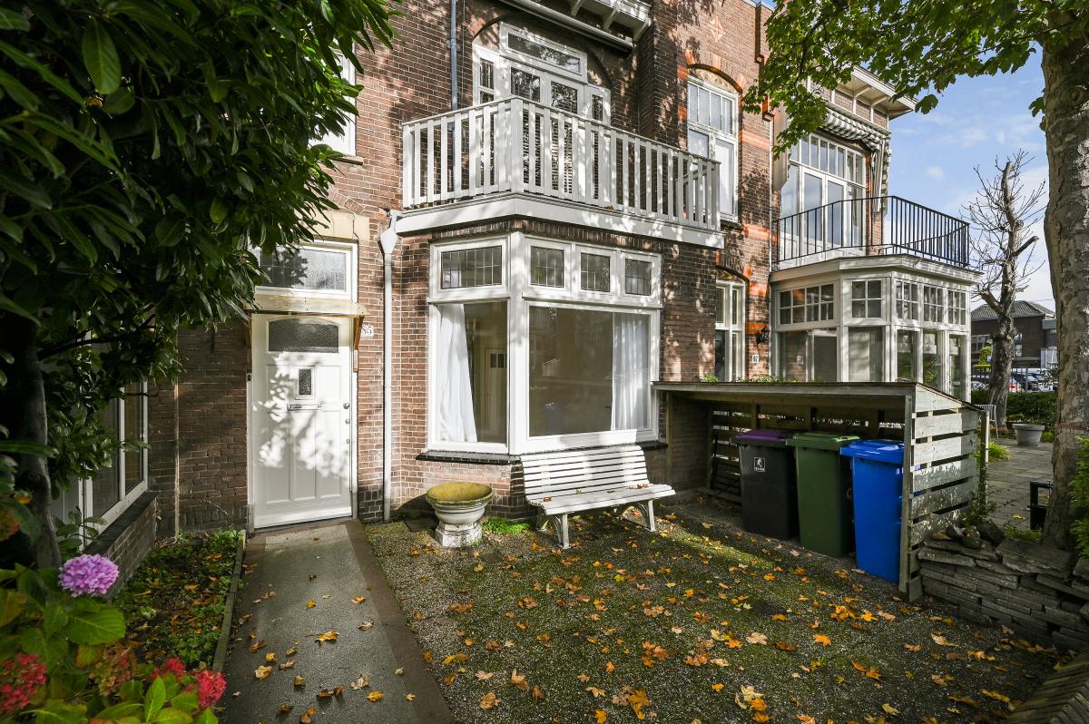Layout: The entrance to the house is reached via the front garden. Vestibule with a closet and meter cupboard and beautiful door that leads to the hallway, which offers space under the stairs, a built-in closet, and a toilet with a small sink. In the hallway, two doors provide access to the front and back rooms of the en-suite rooms. These rooms still retain various period features, such as marble fireplaces, ceilings with molded ceilings and the original suite partition, which features sliding doors with stained glass and four built-in cupboards. At the rear is a conservatory, which has been opened up towards the kitchen. The kitchen, which is also accessible from the hallway, has a simple yet functional design and is equipped with some built-in appliances. The small back garden is accessible from the kitchen, as well as through French doors from the conservatory. This garden is approximately 5 meters deep and faces northwest. A storage room is located in the garden.