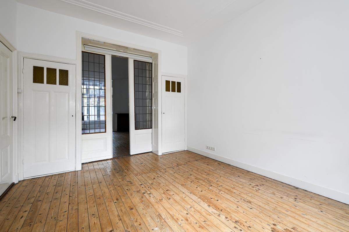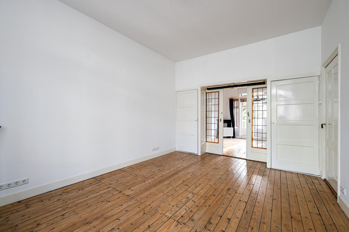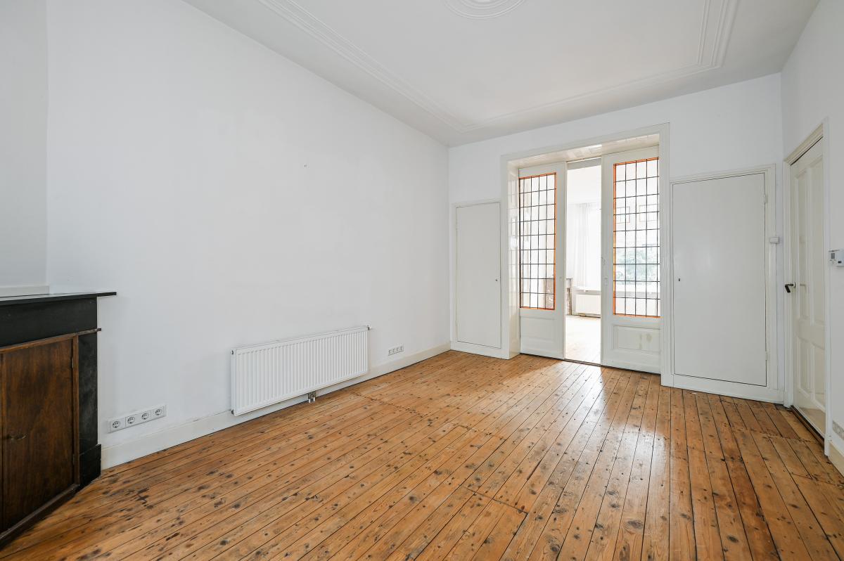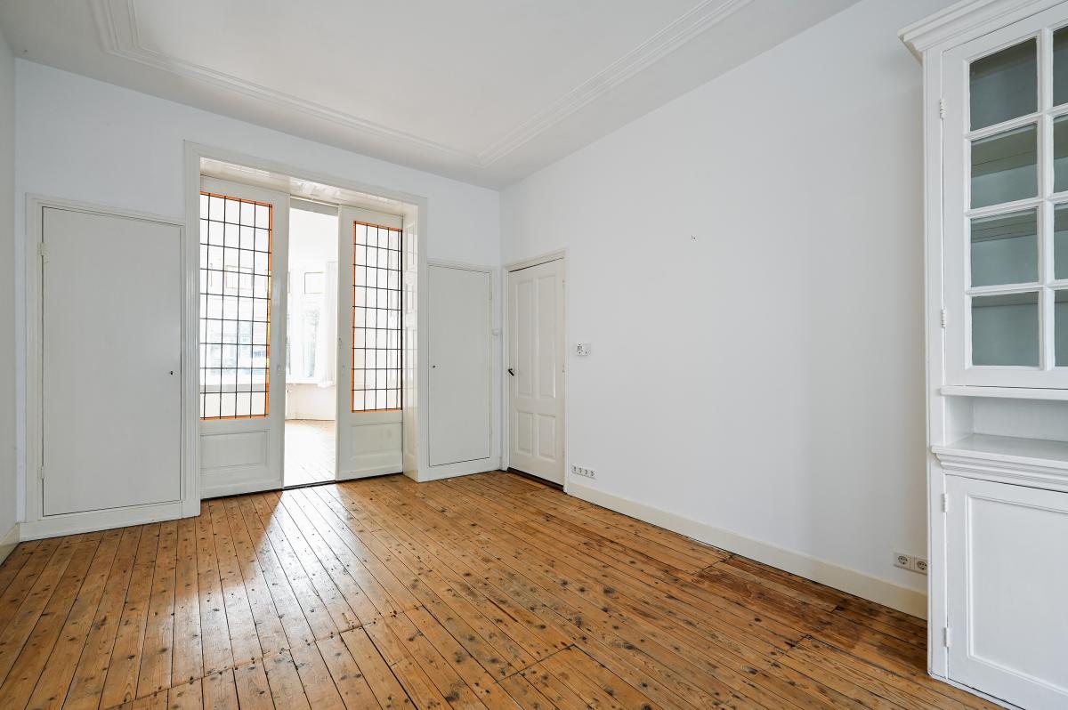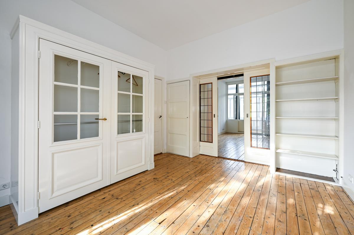 The beautiful staircase leads to the first floor. Here, you reach the landing, with a toilet. At the front is a side room, ideal for a home office. At the rear is the first bathroom, which features a walk-in shower, vanity, and space for the washing machine. The bathroom also has (electric) underfloor heating. The showpiece of this floor are the spacious en suite bedrooms, which open at the back side onto a conservatory with loads of natural light. These rooms, like the ground floor, also feature the original sliding doors, several built-in wardrobes, and marble fireplaces. This large space can easily be divided into two separate bedrooms. At the front, French doors open onto a balcony overlooking the street.