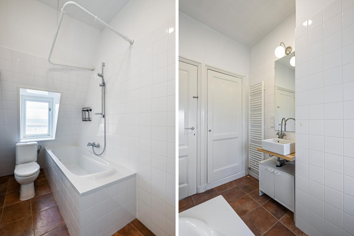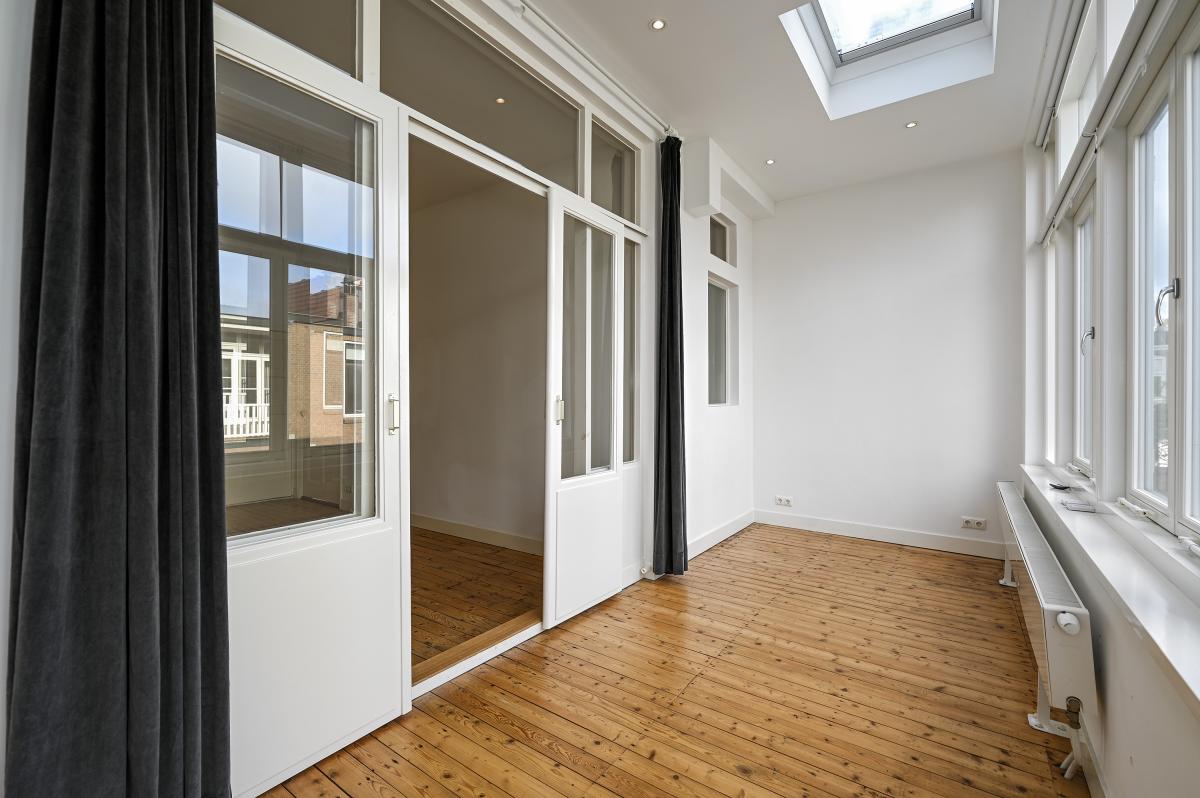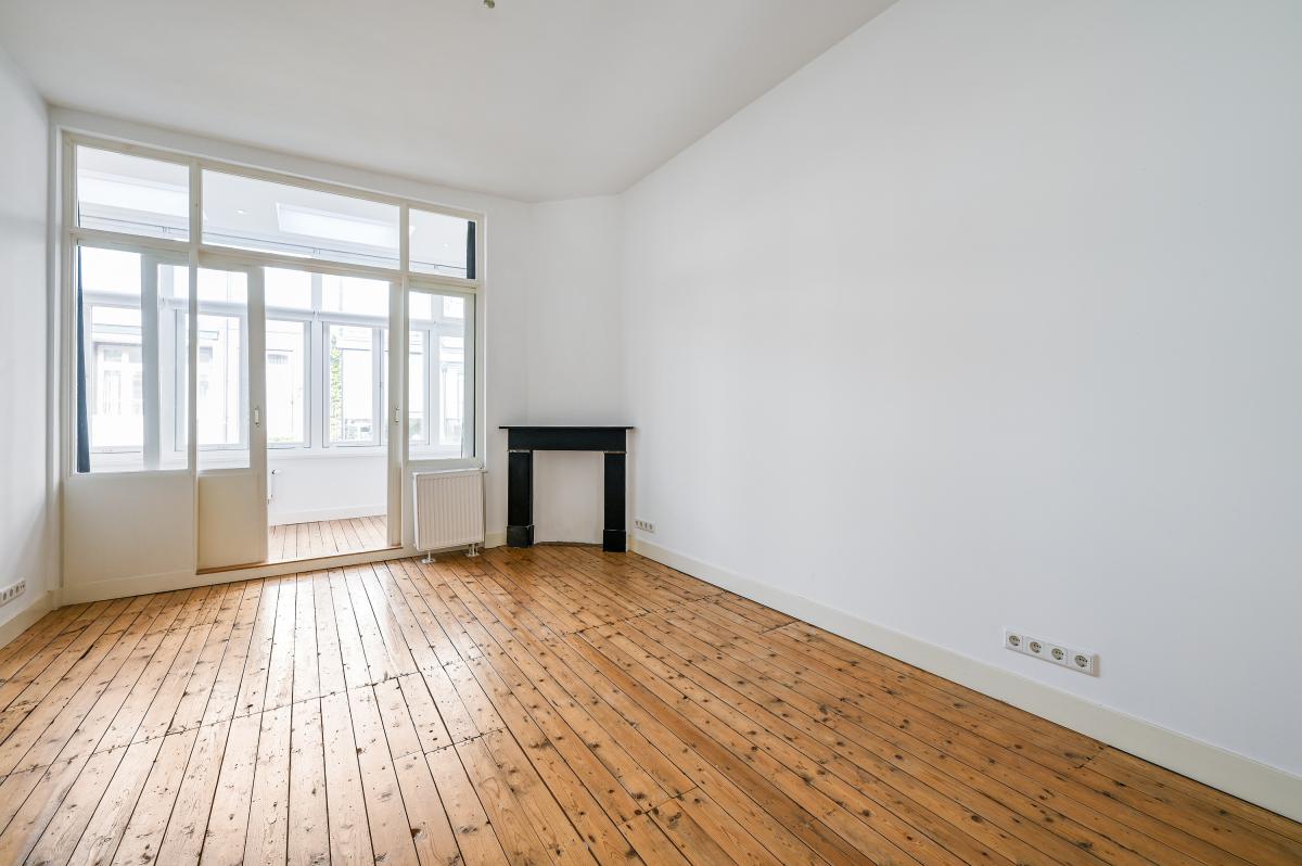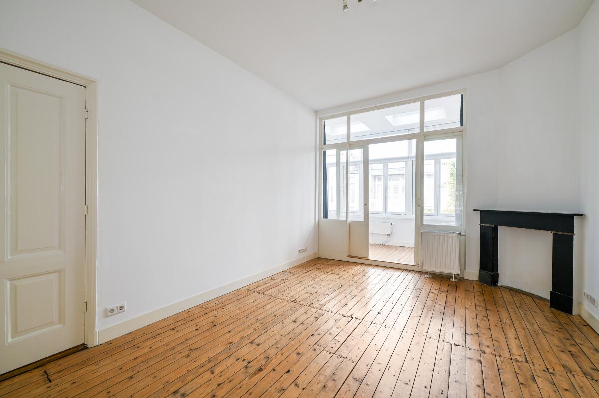 The beautiful staircase leads to the first floor. Here, you reach the landing, with a toilet. At the front is a side room, ideal for a home office. At the rear is the first bathroom, which features a walk-in shower, vanity, and space for the washing machine. The bathroom also has (electric) underfloor heating. The showpiece of this floor are the spacious en suite bedrooms, which open at the back side onto a conservatory with loads of natural light. These rooms, like the ground floor, also feature the original sliding doors, several built-in wardrobes, and marble fireplaces. This large space can easily be divided into two separate bedrooms. At the front, French doors open onto a balcony overlooking the street.