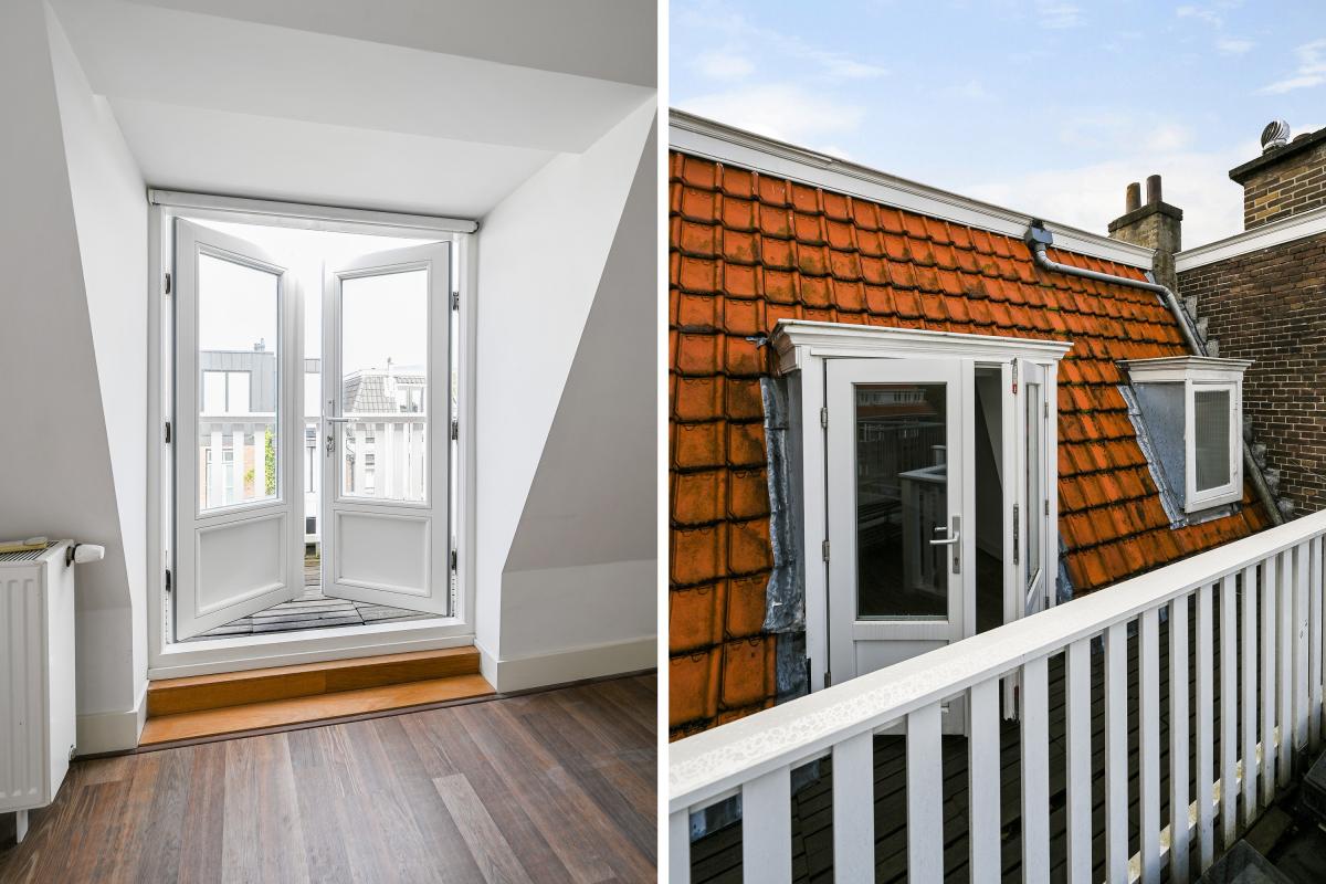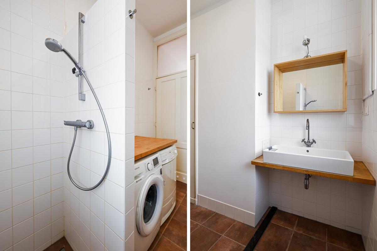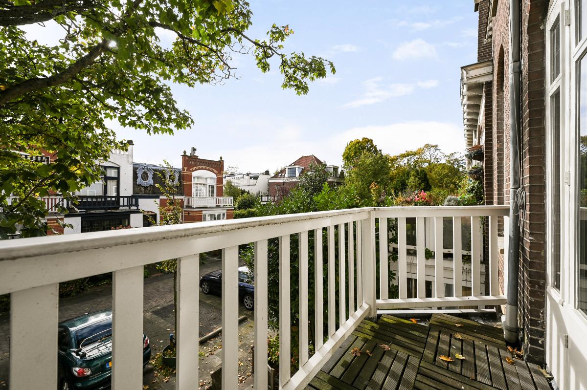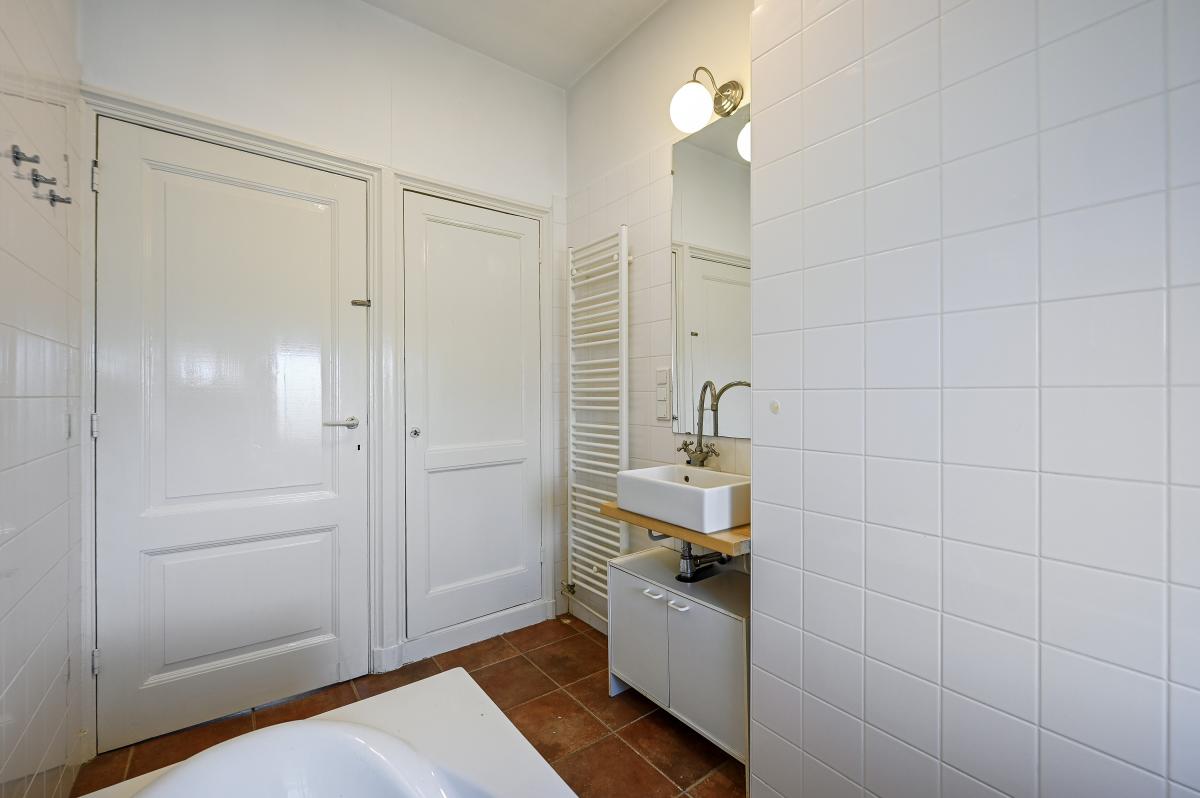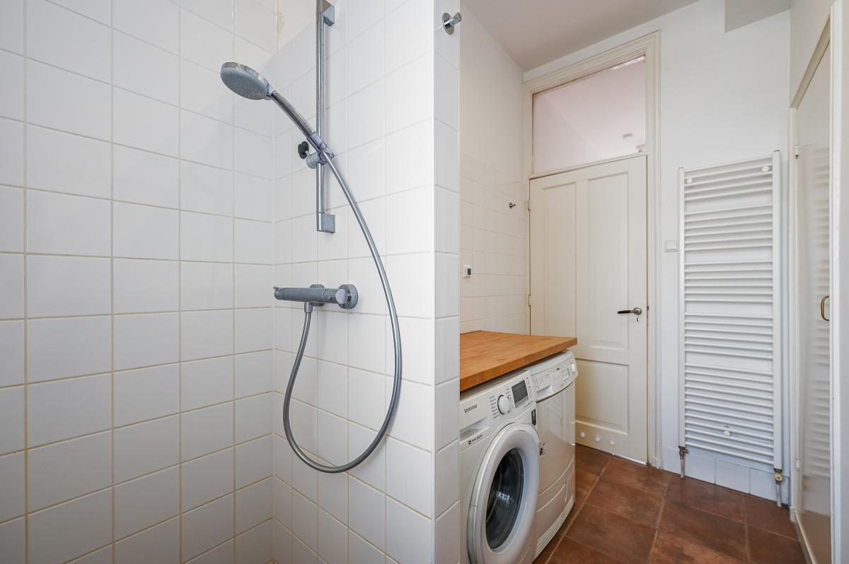 The beautiful staircase leads to the first floor. Here, you reach the landing, with a toilet. At the front is a side room, ideal for a home office. At the rear is the first bathroom, which features a walk-in shower, vanity, and space for the washing machine. The bathroom also has (electric) underfloor heating. The showpiece of this floor are the spacious en suite bedrooms, which open at the back side onto a conservatory with loads of natural light. These rooms, like the ground floor, also feature the original sliding doors, several built-in wardrobes, and marble fireplaces. This large space can easily be divided into two separate bedrooms. At the front, French doors open onto a balcony overlooking the street.