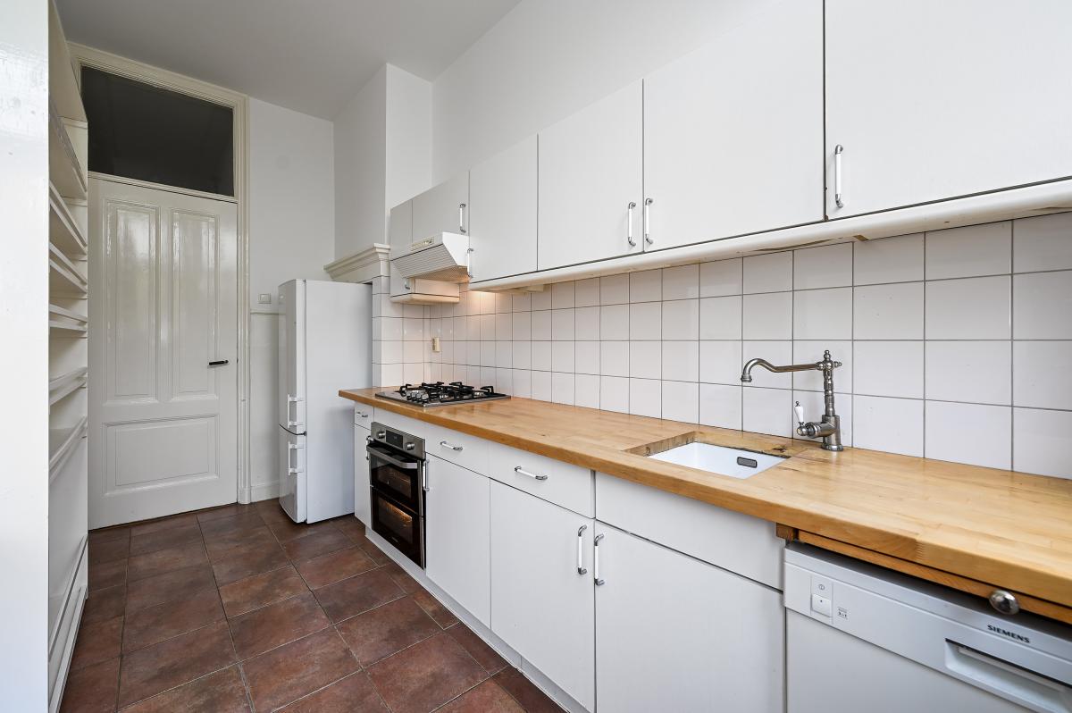 De indeling: Via de voortuin bereikt men de entree tot het huis. Tochtportaal met garderobe en meterkast. Via een fraaie tochtdeur bereikt men de gang, met ruimte onder de trap, een vaste kast en een toilet met fonteintje. Aan de gang bevinden zich twee deuren die toegang bieden tot de voor- respectievelijk achterkamer van de kamers en suite. Deze kamers beschikken nog over diverse stijlkenmerken die de bouwperiode kenmerken, zoals marmeren schouwen, plafonds met getrokken lijstwerk, een buffetkast en de originele suite-separatie die is voorzien van schuifdeuren met glas-in-lood alsmede vier inbouwkasten. Aan de achterzijde bevindt zich een serre, die is opengebroken naar de keuken. De keuken, die overigens ook vanuit de gang toegankelijk is, is eenvoudig doch functioneel van opzet en is voorzien van enige inbouwapparatuur. Vanuit de keuken, alsmede middels openslaande deuren vanuit de serre, is de beknopte achtertuin te bereiken. Deze is circa 5 meter diep en gelegen op net noordwesten. In de tuin is een berging aanwezig.