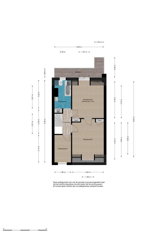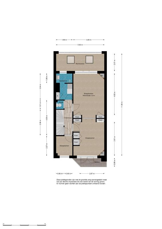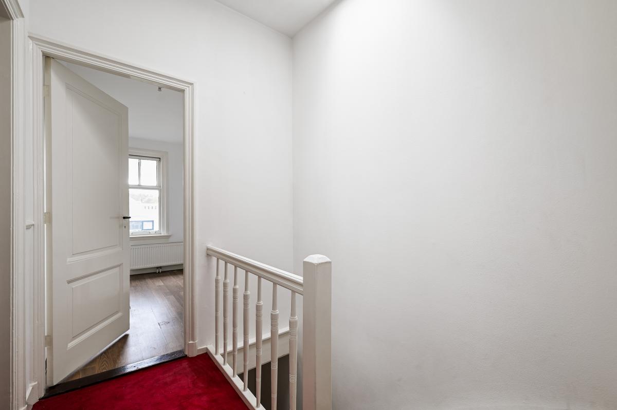 Trap naar de tweede verdieping alwaar men weer een overloop bereikt. Op deze verdieping bevinden zich nog drie slaapkamers: een ruime voorzijkamer en twee grote slaapkamers die middels een tussendeur met elkaar zijn verbonden, maar die eveneens vanaf de overloop separaat toegankelijk zijn. Vanuit de achterkamer is een ruim balkon bereikbaar. Aan de achterzijde van de woning is de tweede badkamer gesitueerd, die is voorzien van een ligbad, toilet en wastafel.