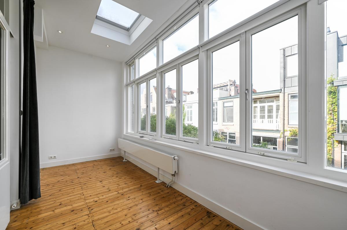 Via het fraaie trappenhuis bereikt men de eerste verdieping. Hier komt men op de overloop waaraan zich een toilet bevindt. Aan de voorzijde is een voorzijkamer gelegen, die ideaal geschikt is voor kantoor aan huis. Aan de achterzijde is de eerste badkamer gelegen, die is voorzien van een inloopdouche, wastafelmeubel en wasmachine aansluiting. De badkamer is tevens voorzien van (elektrische) vloerverwarming. Het spektakelstuk van deze verdieping zijn de riante slaapkamers en suite, doorlopend in een serre met een zee aan daglicht. Ook deze ruimtes zijn, net als de begane grond, voorzien van de originele schuifseparatie en diverse vaste kasten en marmeren schouwen. Uiteraard kan deze grote ruimte op eenvoudige wijze worden opgedeeld in twee separate slaapkamers. Aan de voorzijde bieden openslaande deuren toegang tot een balkon uitkijkend over de straat.