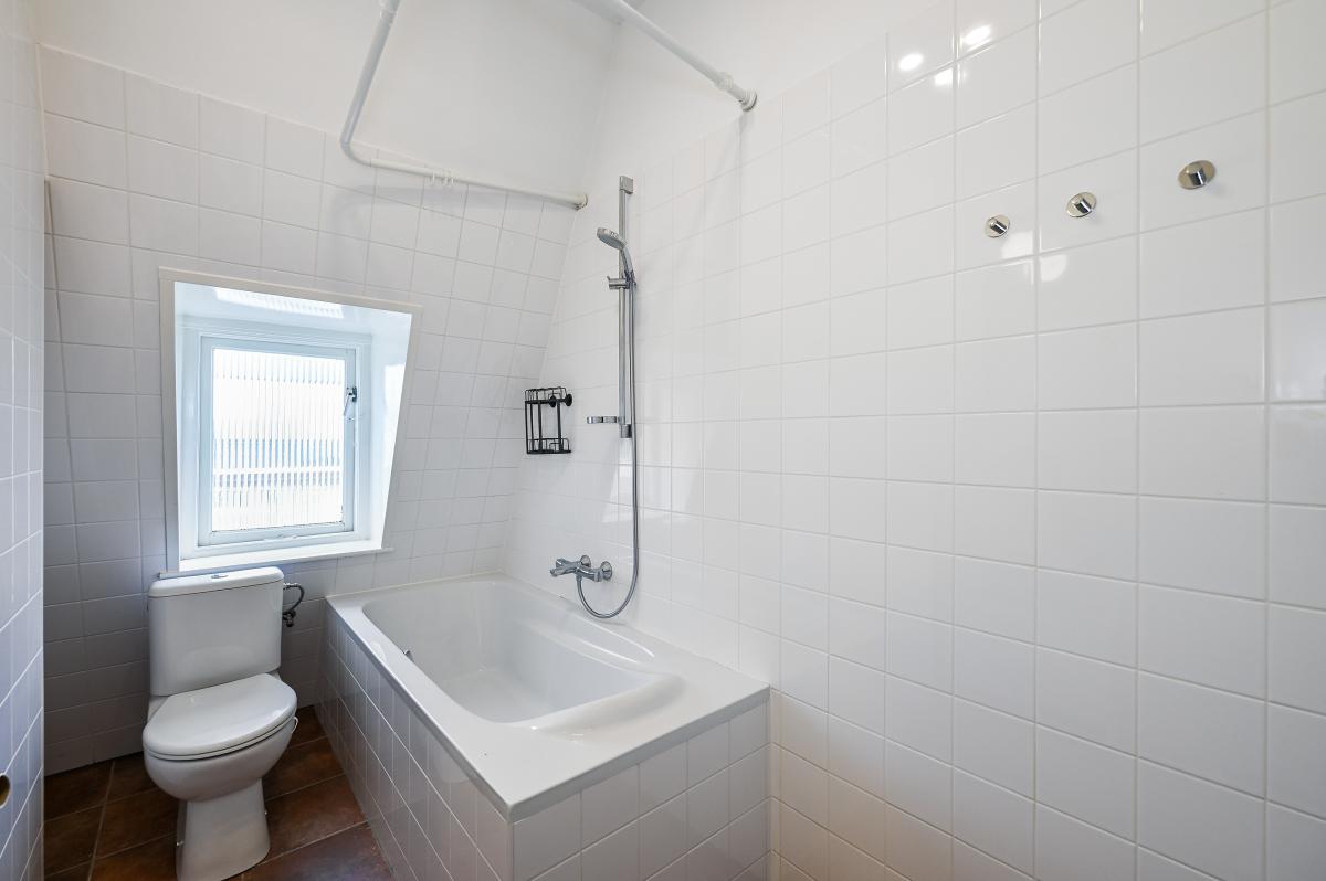 Stairs lead to the second floor, where another landing is reached. This floor contains three more bedrooms: a spacious front room and two large bedrooms with a connecting door, but also separately accessible from the landing. A spacious balcony is accessible from the back room. The second bathroom is located at the rear of the house and is equipped with a bathtub, toilet, and sink.