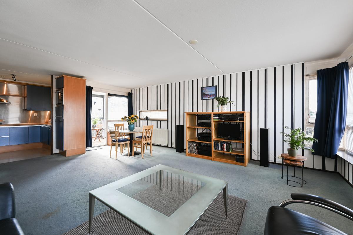 Gemeenschappelijke hoofdentree met de brievenbussen en de intercom. Lift of de trap naar de derde verdieping. Entree van het appartement, L-vormige hal met de meterkast en een toilet voorzien van een fonteintje. De ruime woonkamer telt maar liefst 40 m² en heeft door de hoekligging aan 3 zijden ramen waardoor de living bijzonder licht is. Direct aan de woonkamer liggen twee buitenruimtes (balkon en een met glazen schuiframen afsluitbaar balkon) waardoor je altijd wel een fijne plek in de zon of juist de schaduw kunt vinden, ook buiten de zomer. De halfopen keuken heeft een L-vormige opstelling en is voorzien van diverse inbouwapparatuur zoals een 4-pits gaskookplaat, een RVS afzuigkap, een vaatwasser en een oven. Direct naast de keuken ligt de handige bijkeuken met de opstelling van de CV ketel en de aansluiting voor de wasmachine en eventueel de droger. Het appartement heeft een goed bemeten hoofdslaapkamer en er is een tweede slaapkamer van prima formaat. De badkamer is voorzien van een douche, een ligbad en een vaste wastafel. In de onderbouw van het appartementencomplex is een eigen berging en een eigen parkeerplaats in de afgesloten garage aanwezig.