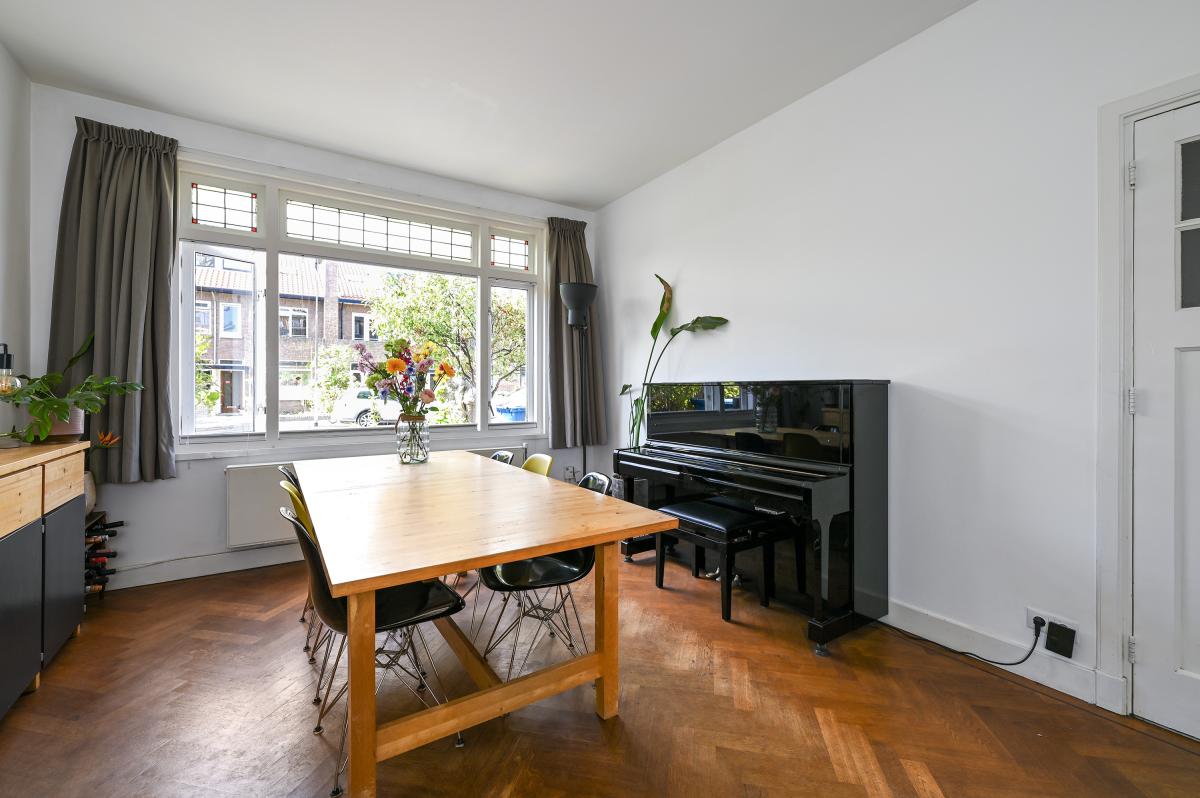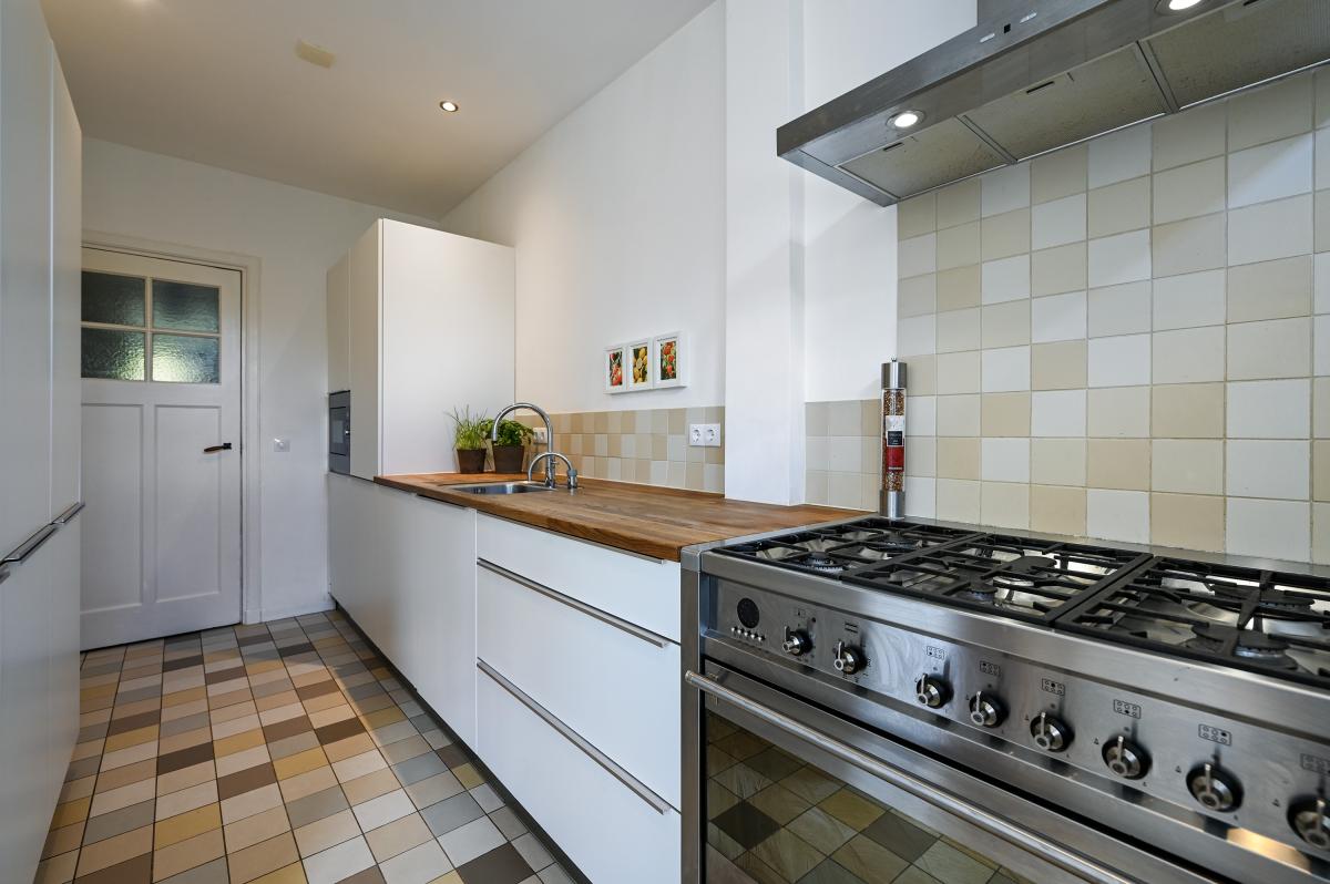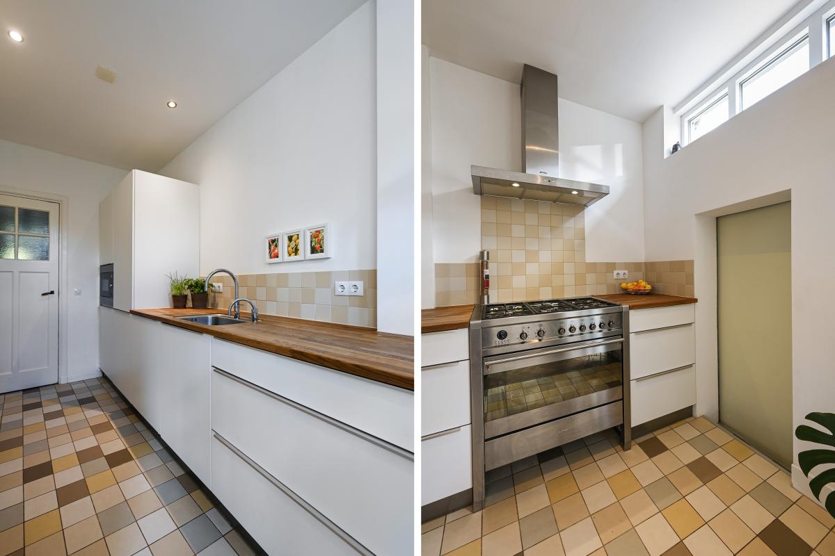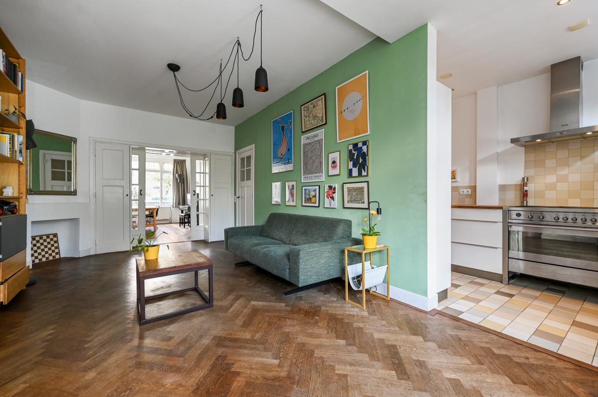 Vanuit de gang bieden twee deuren toegang tot de voor- en achterkamer van de kamers en suite. De voorkamer is momenteel in gebruik als eetkamer, maar kan uiteraard ook dienen als woonkamer. Er is een gezellige open haard aanwezig en de vloer is, net als in de achterkamer uitgevoerd in een eiken visgraatparket. Via de nog aanwezige, originele suite-separatie met schuifdeuren met glasroedeverdeling, bereikt men de achterkamer. Deze is aan de achterzijde uitgebouwd, waardoor deze ruimte ca. 7 meter diep is. Aan de achterzijde is er een doorgang gemaakt naar de moderne keuken, die overigens ook vanaf de gang te bereiken is. De keuken is voorzien van een houten topblad en veel inbouwapparatuur, waaronder een 6-pits gasfornuis met oven, vaatwasser, koelkast, vriezer, magnetron en Quooker-kraan. De op maat gemaakte inbouwkasten bieden hier veel extra bergruimte. Vanuit de keuken bereikt men via een schuifdeur de bijkeuken, met daarin de opstalplaats voor de wasmachine en droger. Vanuit de achterkamer bieden openslaande deuren toegang tot de circa 11,50 meter diepe achtertuin. Deze is ingedeeld met een terras aan het huis en een terras aan de achterzijde van de tuin. Tevens is er een houten berging aanwezig en biedt een elektrisch zonnescherm schaduw op de warme dagen.