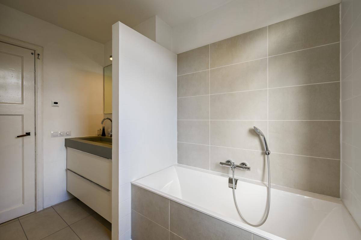 Eerste verdieping: overloop waaraan separaat, modern toilet met fonteintje. Aan de voorzijde vindt u een grote slaapkamer met openslaande deuren naar een balkon aan de voorzijde van het huis. Hiernaast is de voorzijkamer gelegen, die ideaal geschikt als kantoortje. Aan de achterzijde is de derde slaapkamer van deze verdieping gelegen, voorzien van ruime inloopkast/berging en eveneens met toegang tot een balkon. De moderne badkamer bevindt zich aan de achterzijde van het huis. Deze is voorzien van een wastafelmeubel met twee kranen, een ligbad en dubbele douche. Tevens is er een handdoekradiator en vloerverwarming aanwezig.
