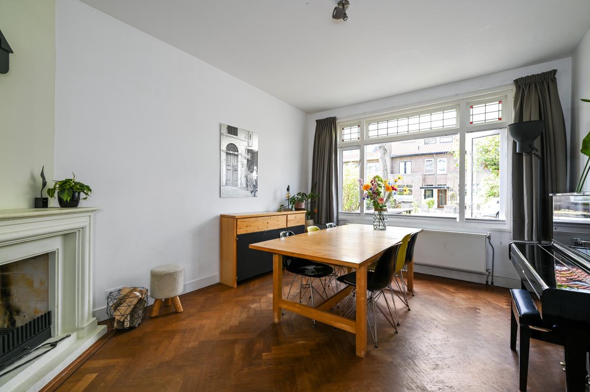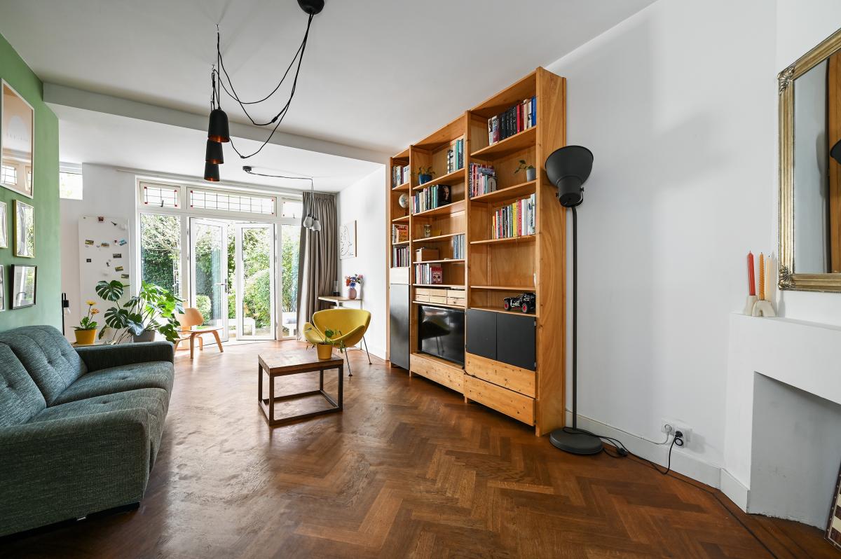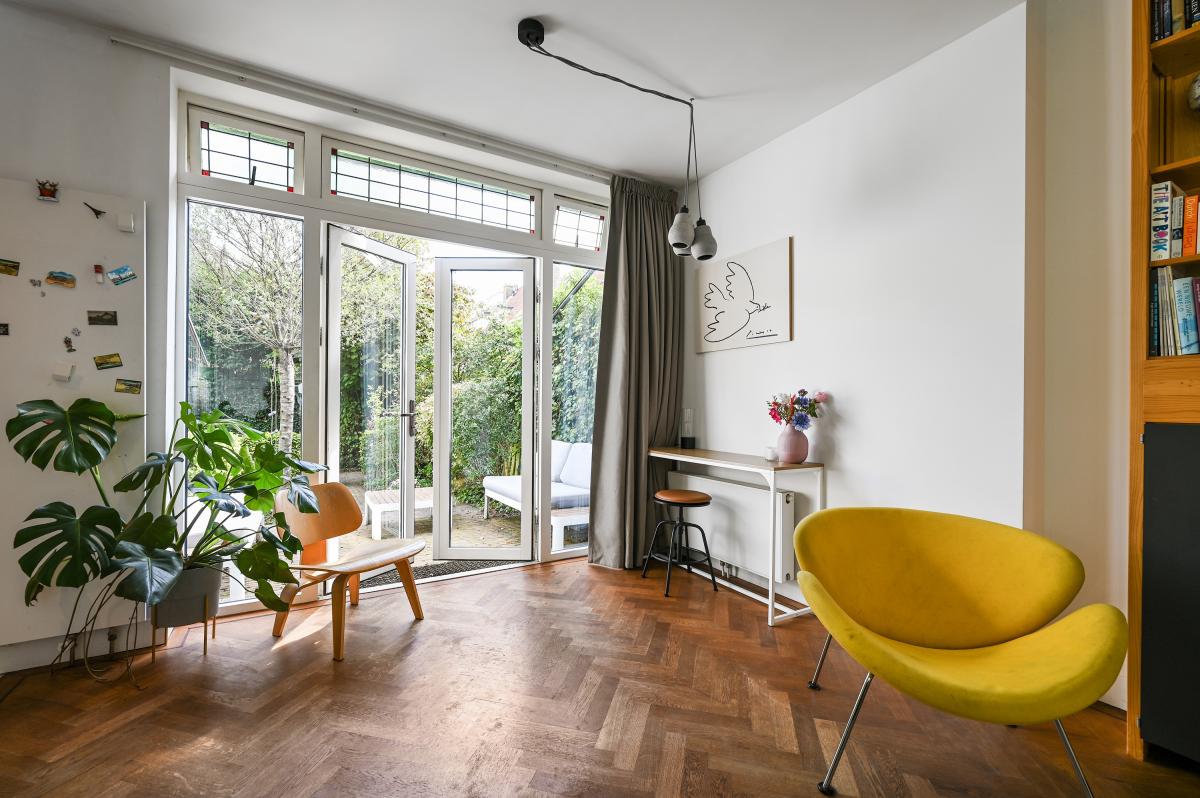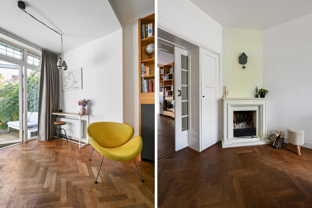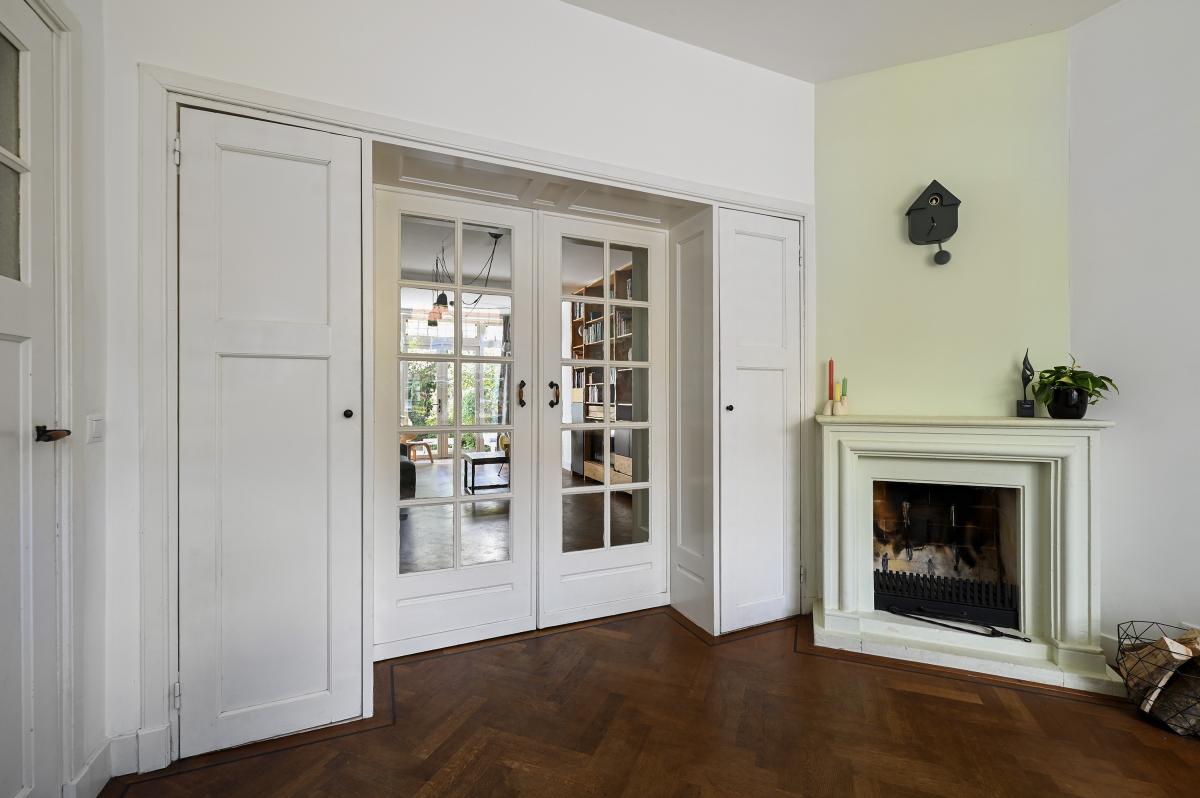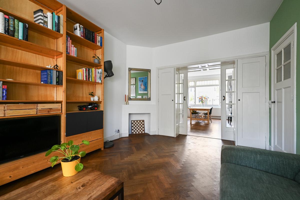Two doors from the hallway provide access to the front and back room of the en-suite living and dining room. The front room is currently used as a dining room, but could also serve as a living room. It features a cozy fireplace and, like the back room, the floor is in oak herringbone parquet. The back room is reached through the original suite partition, which features sliding doors with glass panels. This room has been extended at the rear, making it approximately 7 meters deep. At the rear, a passageway leads to the modern kitchen, which is also accessible from the hallway. The kitchen features a wooden countertop and a wide range of built-in appliances, including a 6-burner gas stove with oven, dishwasher, refrigerator, freezer, microwave, and Quooker tap. Custom-made built-in cabinets provide ample additional storage space. A sliding door from the kitchen leads to the utility room, which houses the washing machine and dryer. From the back room, French doors open onto the approximately 11.5-meter-deep back garden. This garden features a terrace adjacent to the house and another at the rear. There is also a wooden shed and an electric awning offering shade on hot days.