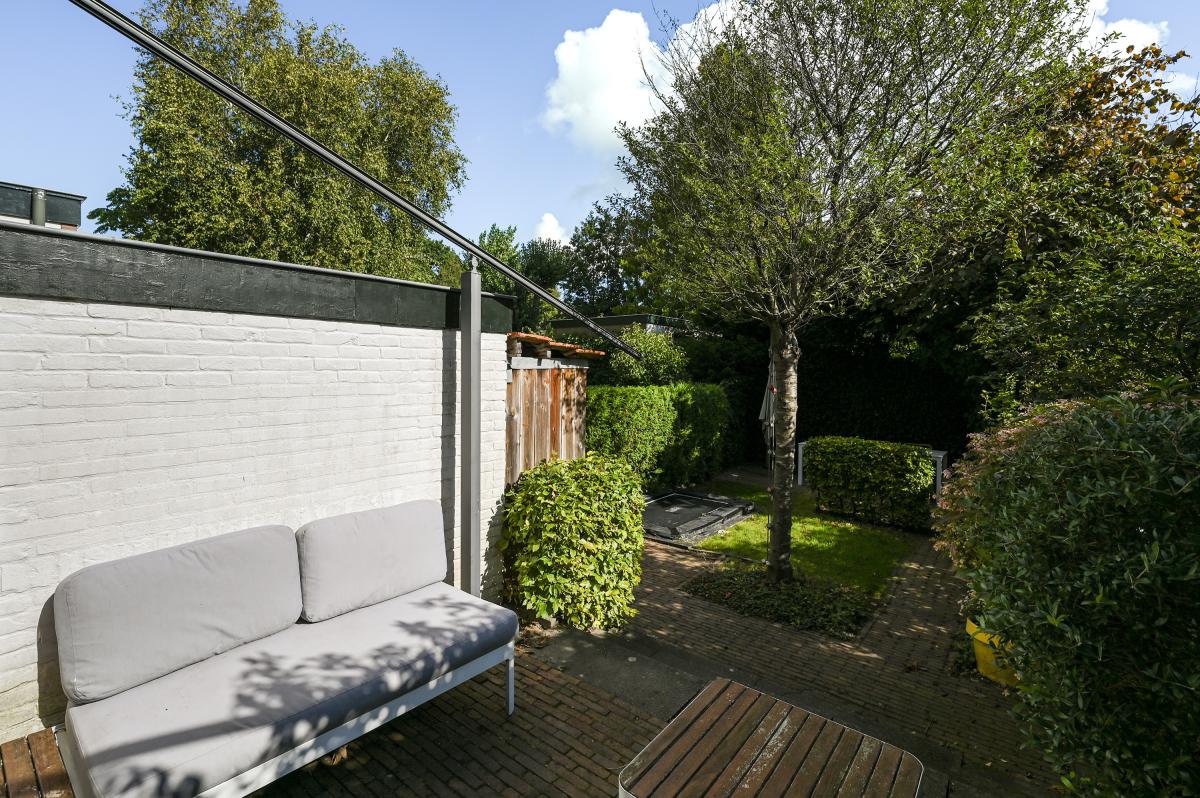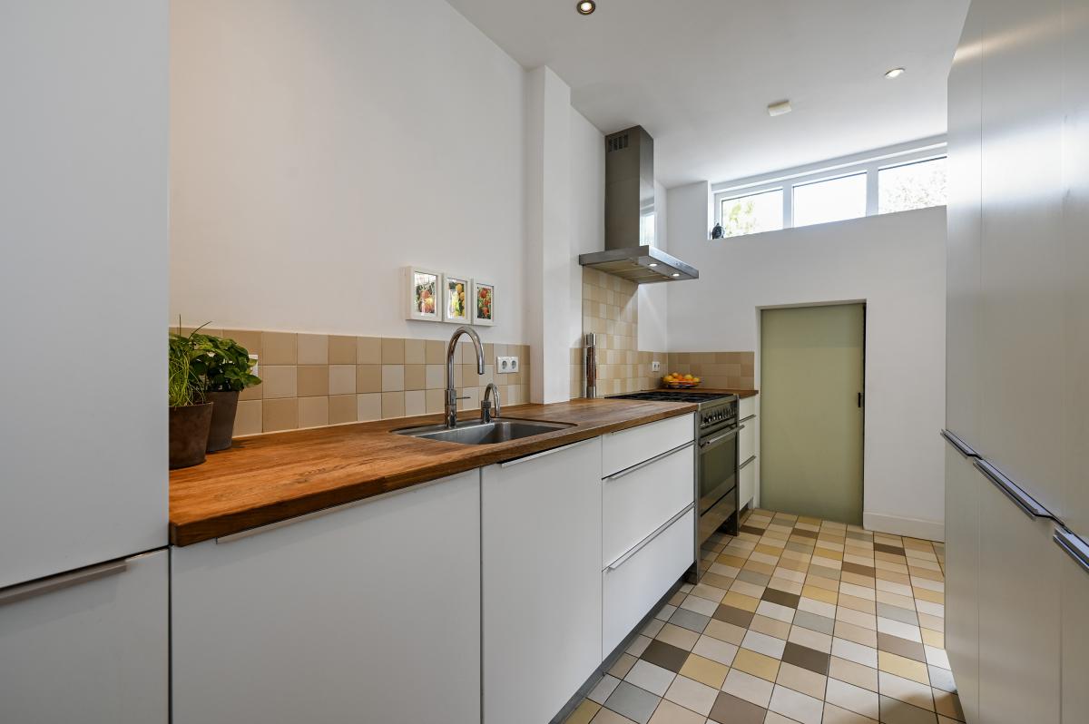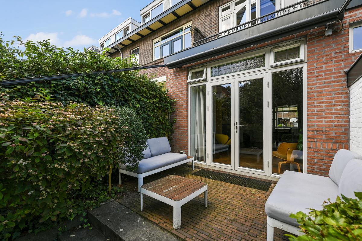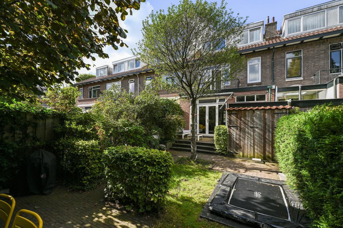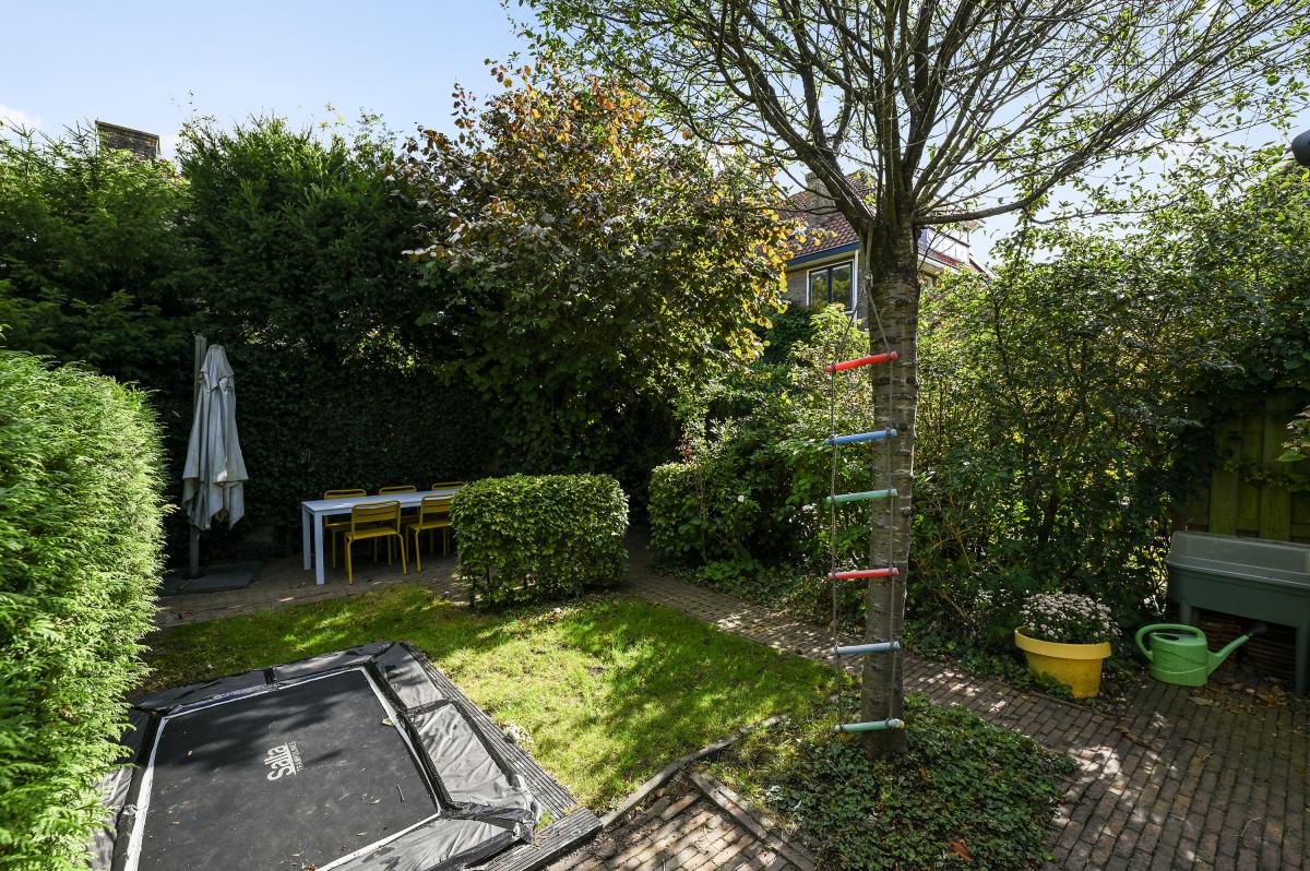 Two doors from the hallway provide access to the front and back room of the en-suite living and dining room. The front room is currently used as a dining room, but could also serve as a living room. It features a cozy fireplace and, like the back room, the floor is in oak herringbone parquet. The back room is reached through the original suite partition, which features sliding doors with glass panels. This room has been extended at the rear, making it approximately 7 meters deep. At the rear, a passageway leads to the modern kitchen, which is also accessible from the hallway. The kitchen features a wooden countertop and a wide range of built-in appliances, including a 6-burner gas stove with oven, dishwasher, refrigerator, freezer, microwave, and Quooker tap. Custom-made built-in cabinets provide ample additional storage space. A sliding door from the kitchen leads to the utility room, which houses the washing machine and dryer. From the back room, French doors open onto the approximately 11.5-meter-deep back garden. This garden features a terrace adjacent to the house and another at the rear. There is also a wooden shed and an electric awning offering shade on hot days.