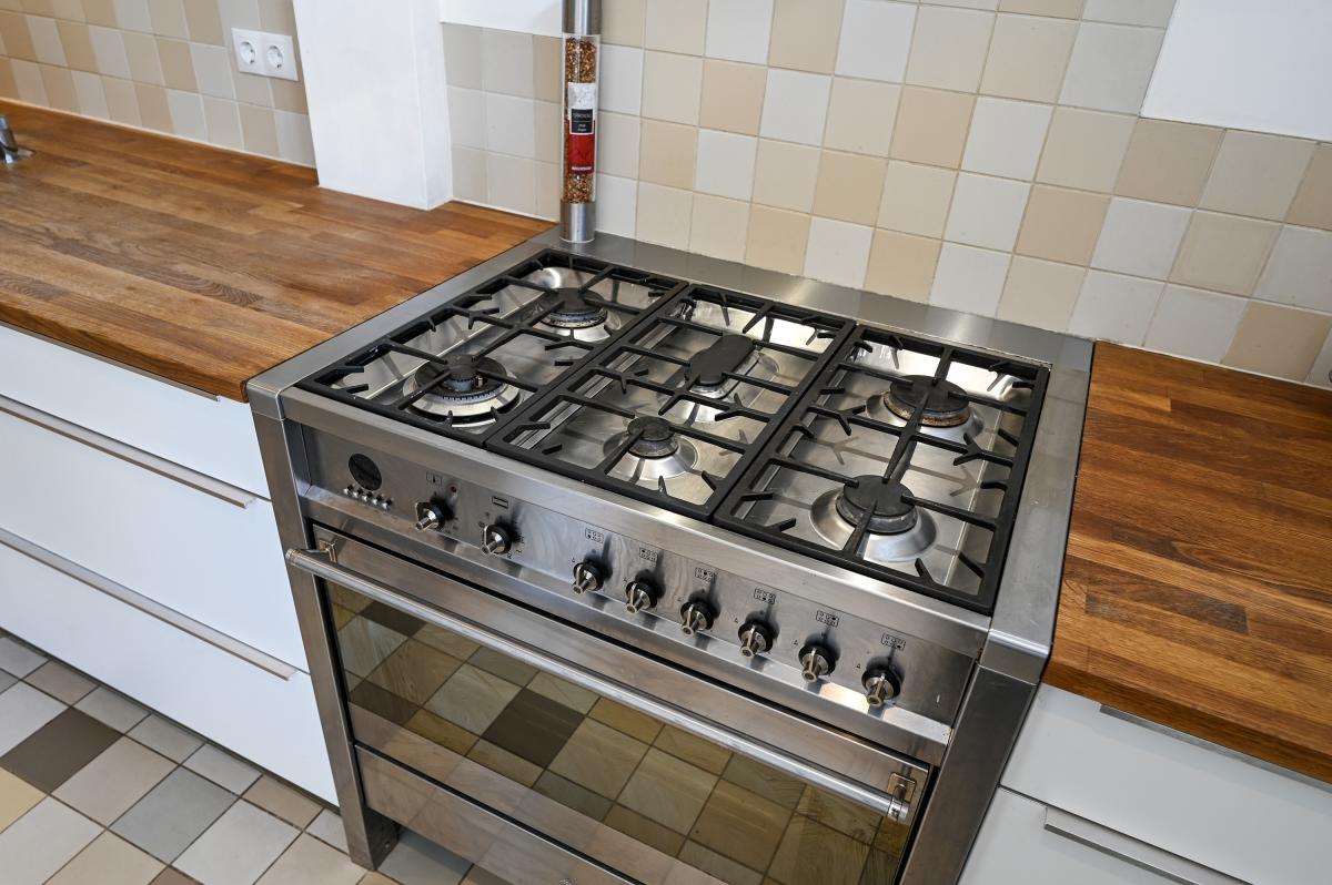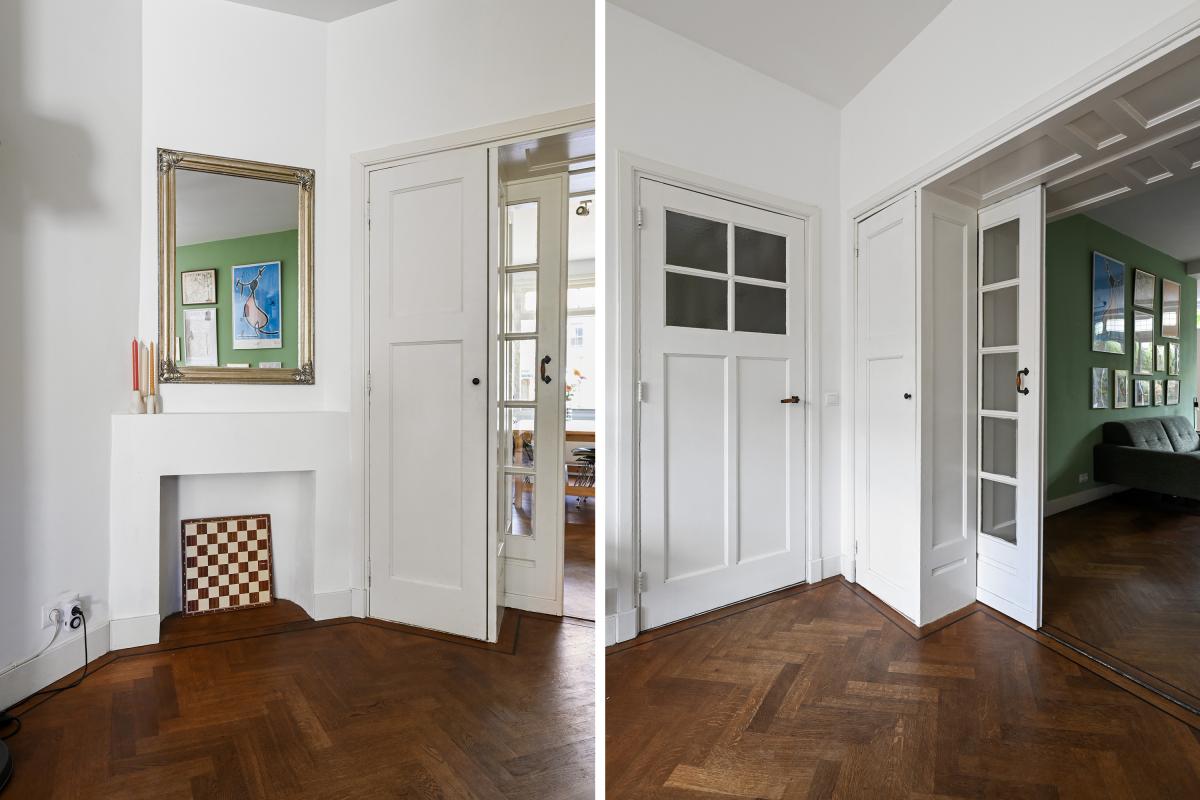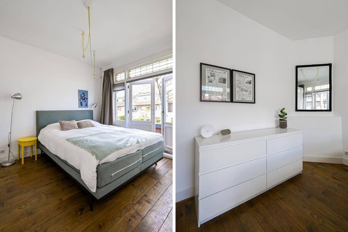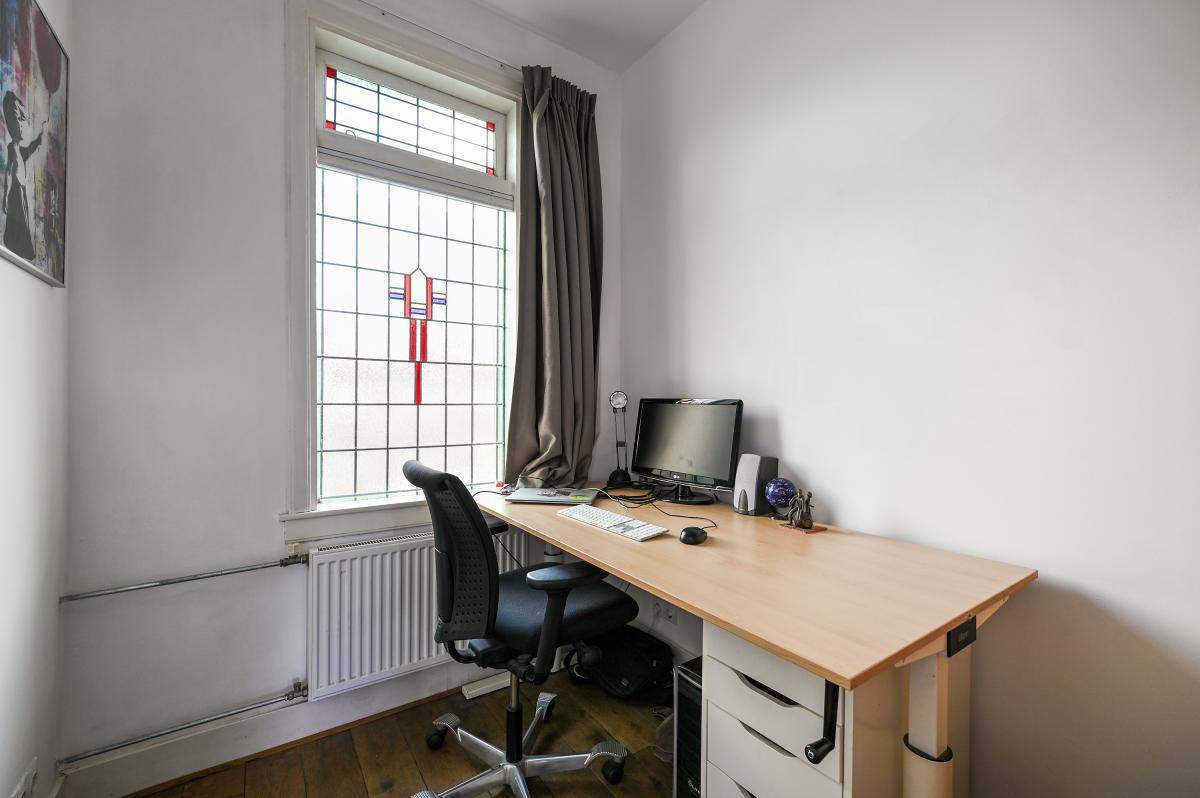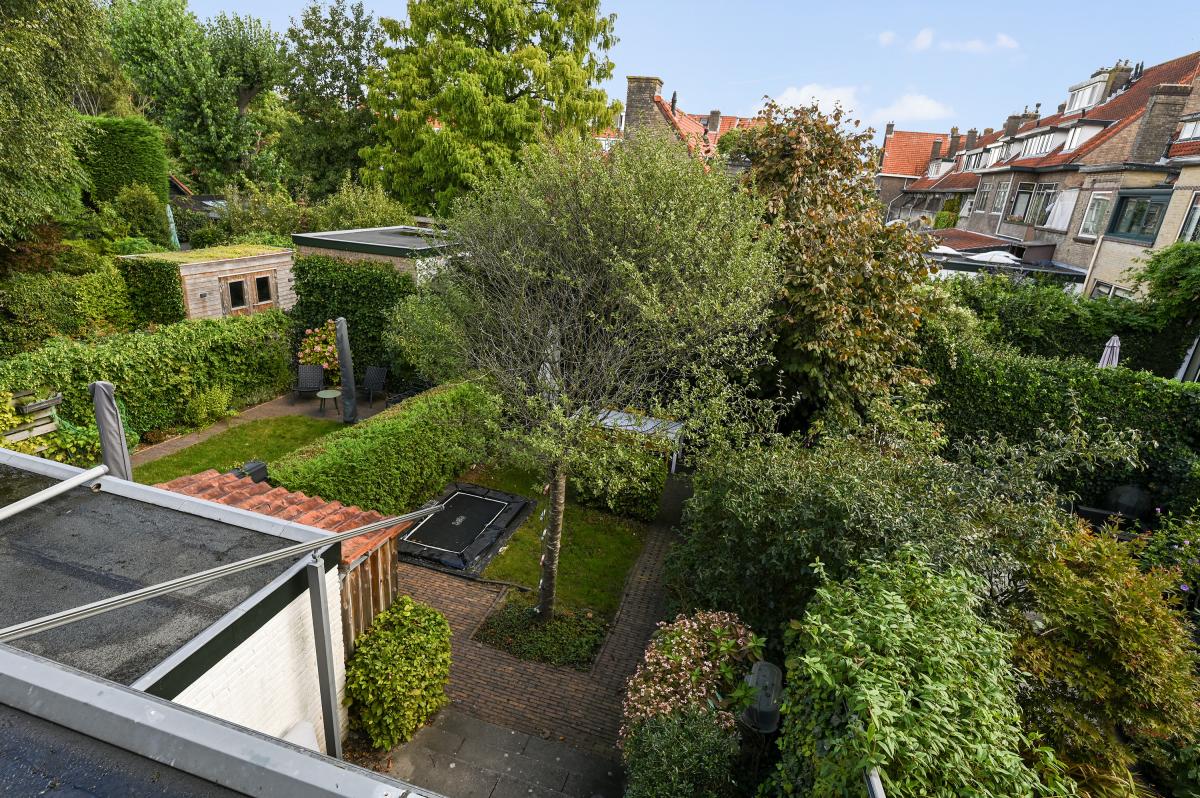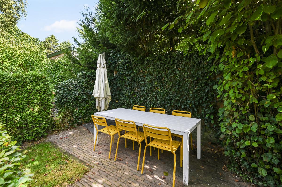 Two doors from the hallway provide access to the front and back room of the en-suite living and dining room. The front room is currently used as a dining room, but could also serve as a living room. It features a cozy fireplace and, like the back room, the floor is in oak herringbone parquet. The back room is reached through the original suite partition, which features sliding doors with glass panels. This room has been extended at the rear, making it approximately 7 meters deep. At the rear, a passageway leads to the modern kitchen, which is also accessible from the hallway. The kitchen features a wooden countertop and a wide range of built-in appliances, including a 6-burner gas stove with oven, dishwasher, refrigerator, freezer, microwave, and Quooker tap. Custom-made built-in cabinets provide ample additional storage space. A sliding door from the kitchen leads to the utility room, which houses the washing machine and dryer. From the back room, French doors open onto the approximately 11.5-meter-deep back garden. This garden features a terrace adjacent to the house and another at the rear. There is also a wooden shed and an electric awning offering shade on hot days.