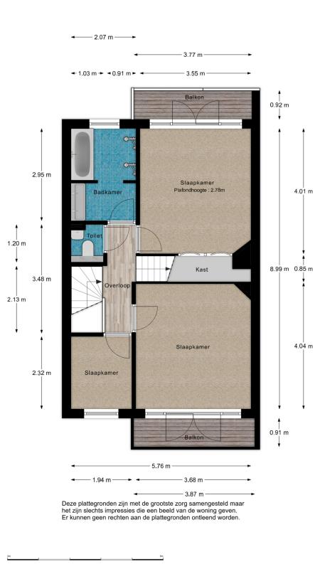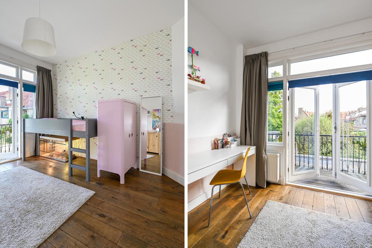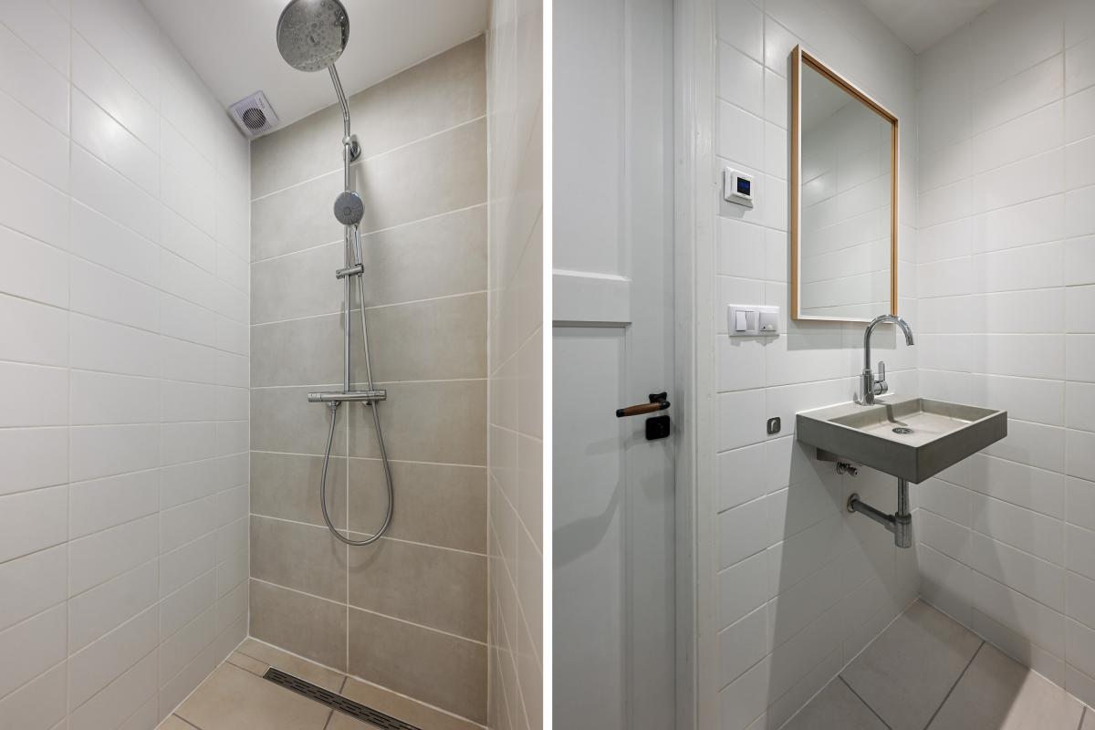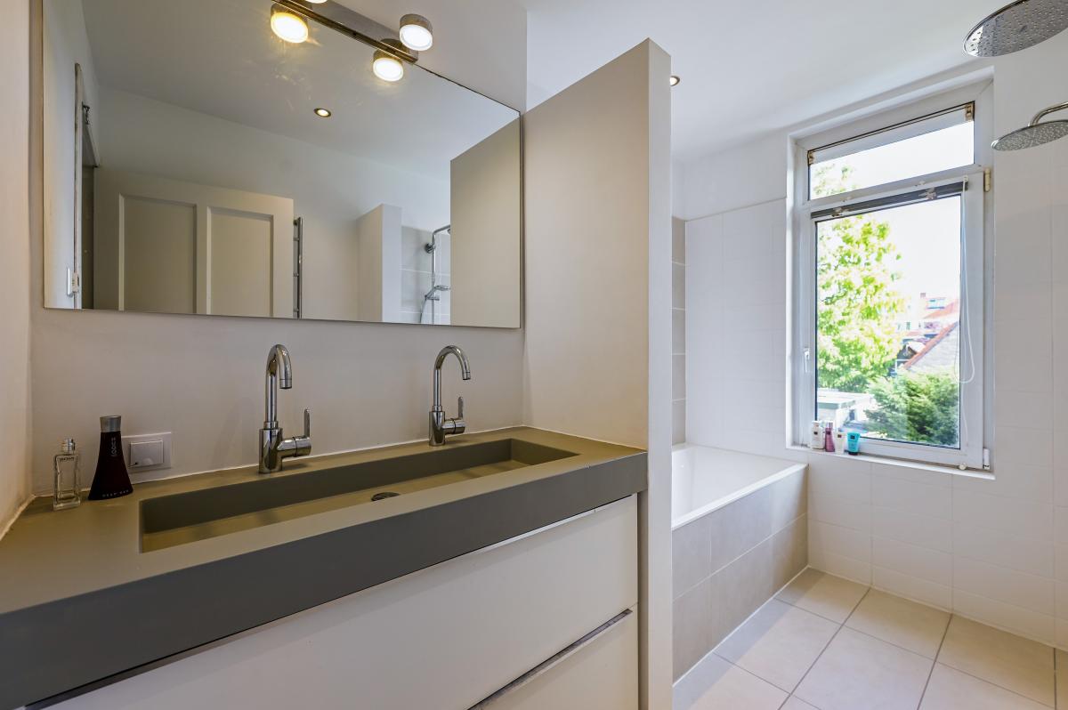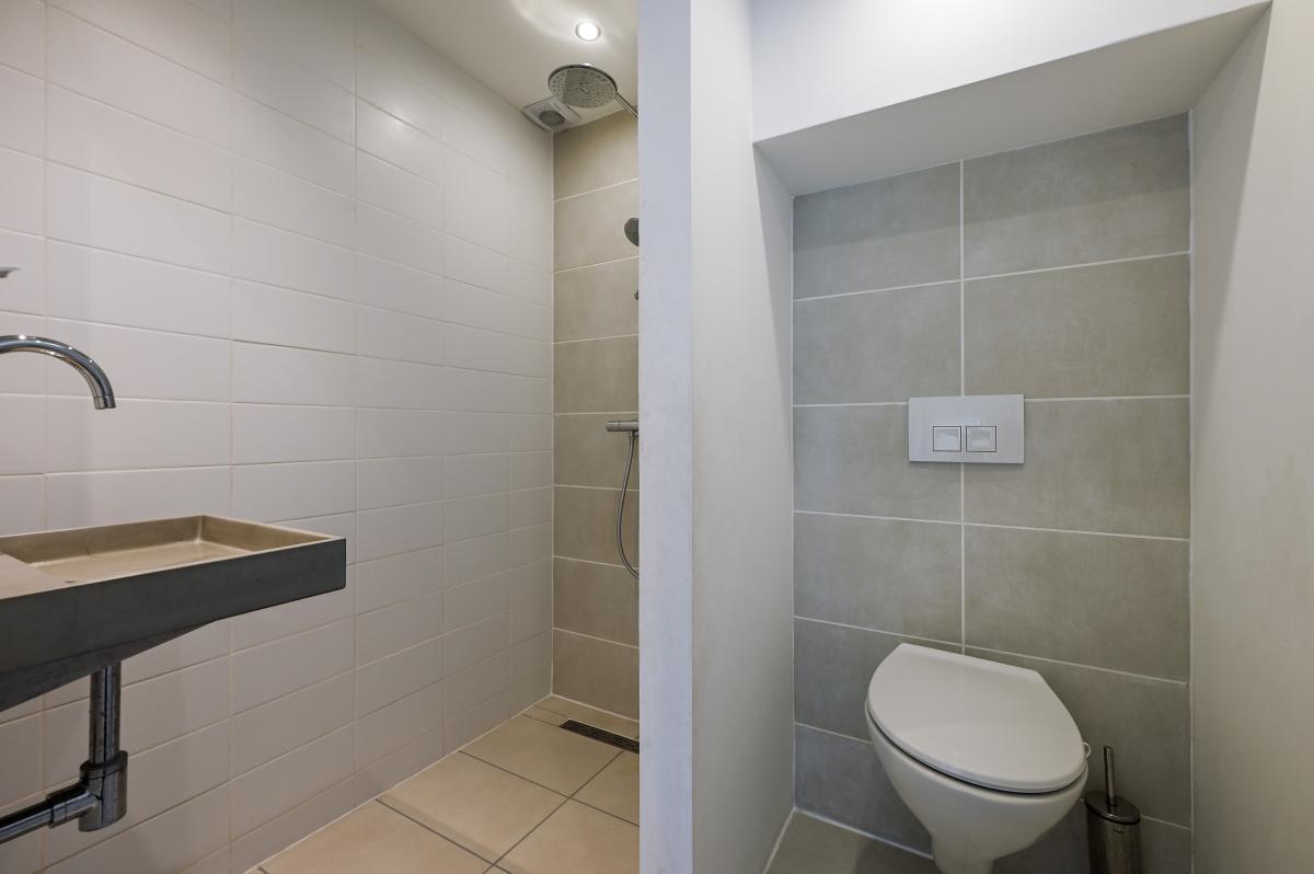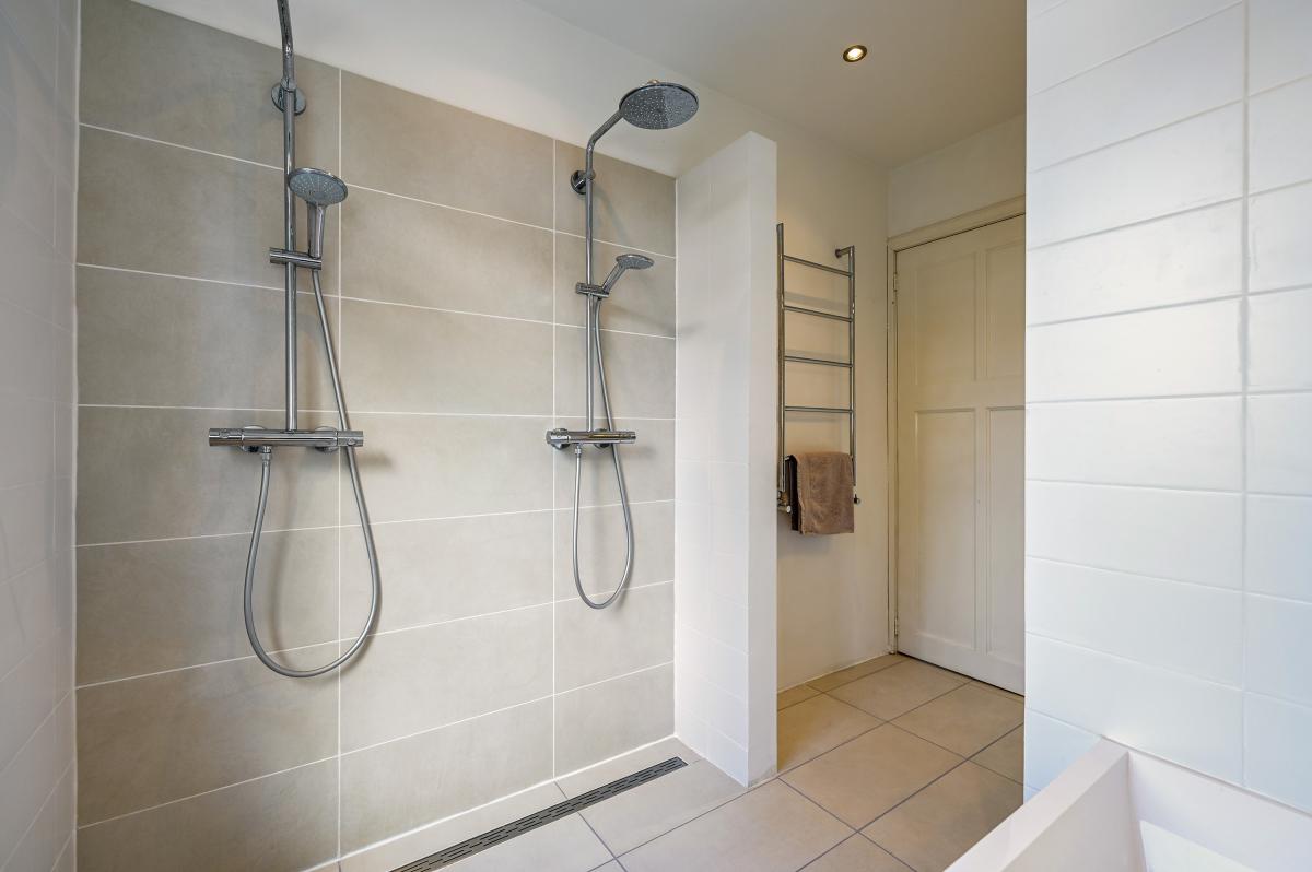 Second floor: The layout of this floor has been carefully considered: here you'll find three more good-sized bedrooms and a second bathroom! The layout is as follows: a landing with a cupboard housing the central heating boiler, two bedrooms at the front, one with a dormer window and one with a large Velux window. A bedroom at the rear spans the entire width of the house. There is ample storage space behind the walls in all bedrooms. The second bathroom is finished in the same modern style as the bathroom on the first floor. It features a spacious walk-in shower, a vanity unit, and a third toilet. This bathroom also has underfloor heating.