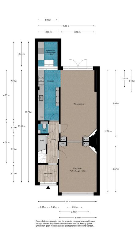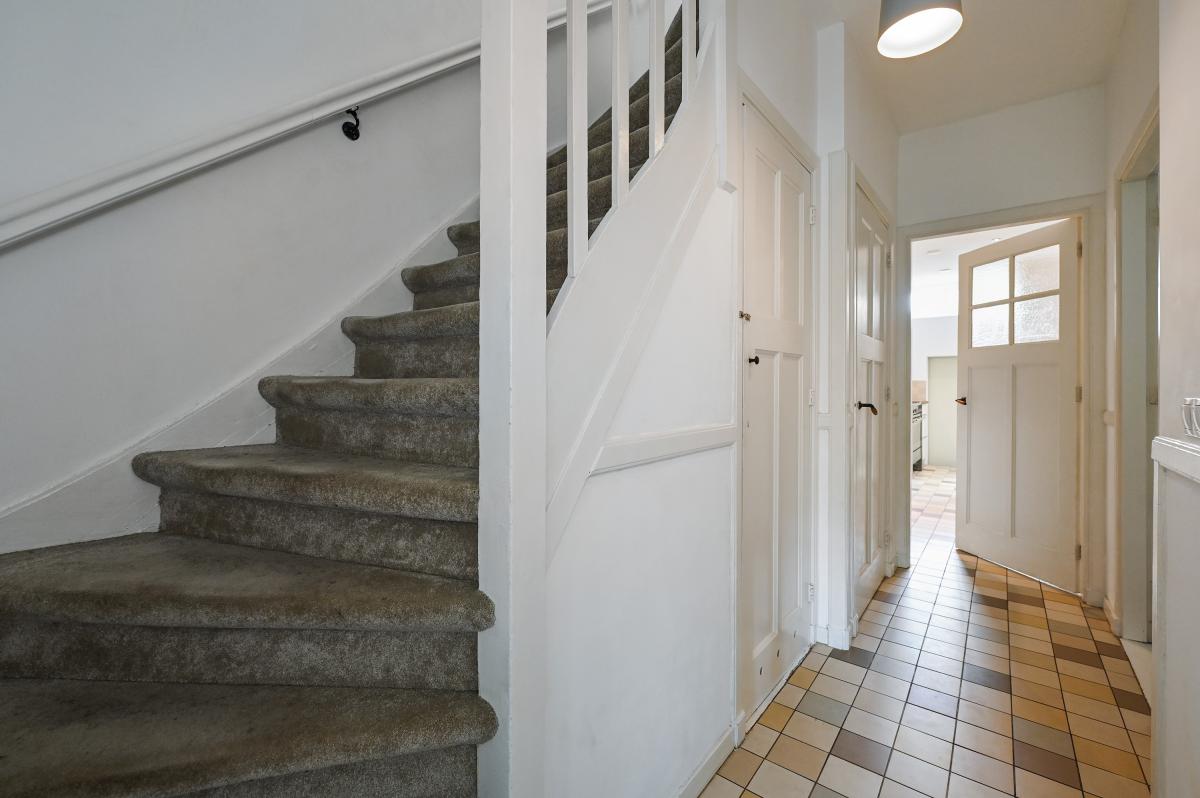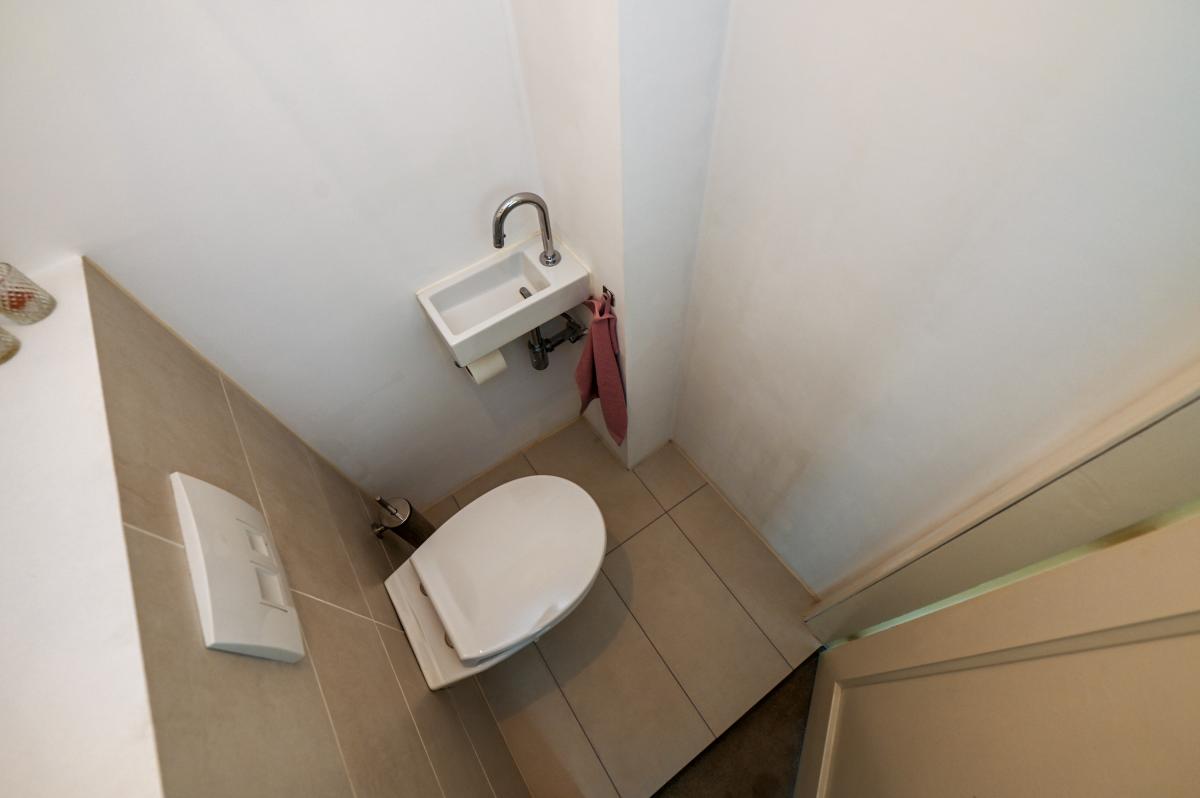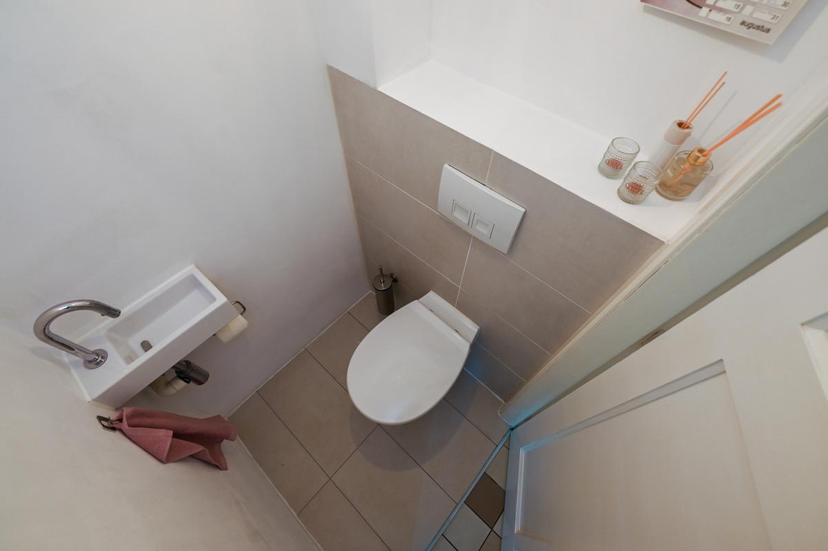 The layout: The entrance to the house is reached through the approximately 6-meter deep front garden, which features a sunken bicycle shed and a charging station for an electric car. You first enter the hall, with on the left a built-in wardrobe with ample storage space, a warderobe and the meter cupboard with extensive electrical installation. A door leads to the hallway, which includes a closet under the stairs and a modern toilet with a wall-hung toilet and a small sink.