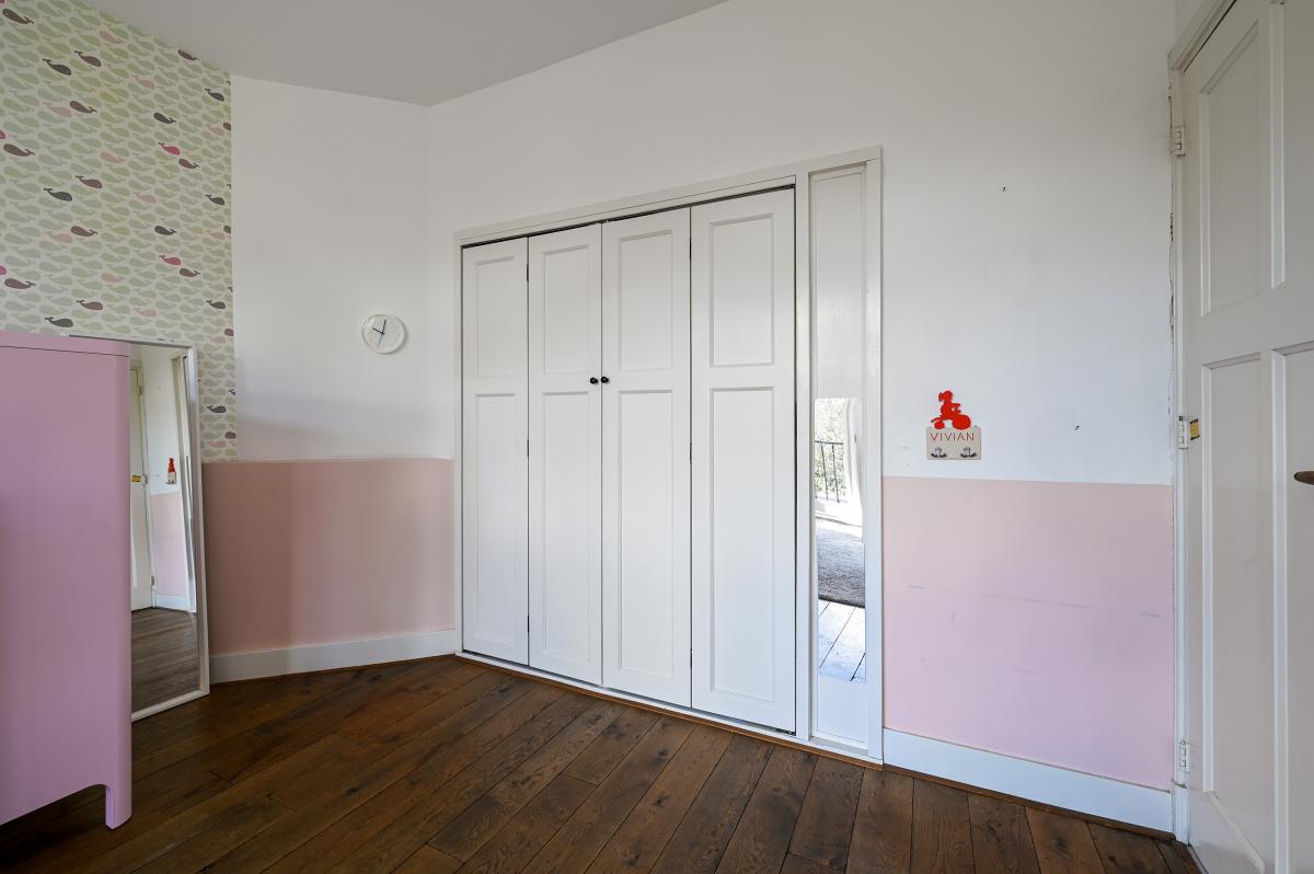 First floor: landing with a separate, modern toilet and hand basin. At the front, you'll find a large bedroom with French doors opening onto a balcony at the front of the house. Adjacent is the side room, ideal for use as an office. At the rear is the third bedroom on this floor, featuring a spacious walk-in closet/storage room and also accessing a balcony. The modern bathroom is located at the rear of the house. It features a vanity with two taps, a bathtub, and a double shower. There is also a heated towel rail and underfloor heating.
