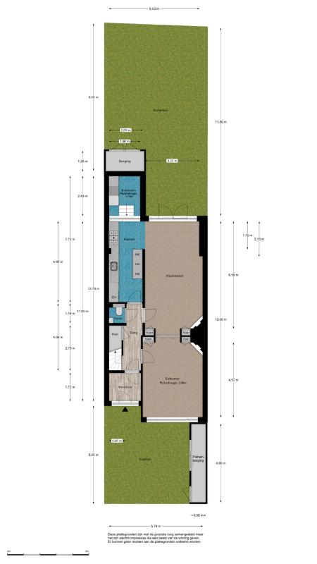 De indeling: Via de circa 6 meter diepe voortuin, met verdiepte fietsenberging en laadpaal voor een elektrische auto, bereikt men de entree van het huis. Hier komt men eerst in de hal met aan de linkerzijde een vaste kastenwand met veel bergruimte, garderobe en de meterkast met uitgebreide installatie. Via een tochtdeur bereikt men de gang met daaraan een provisiekast onder de trap en daarnaast een modern toilet met vrijhangend closet en fonteintje.