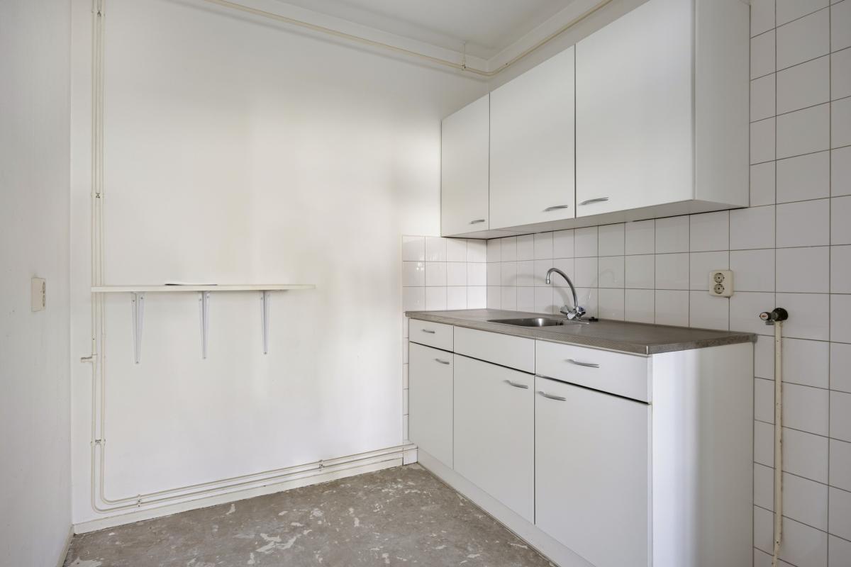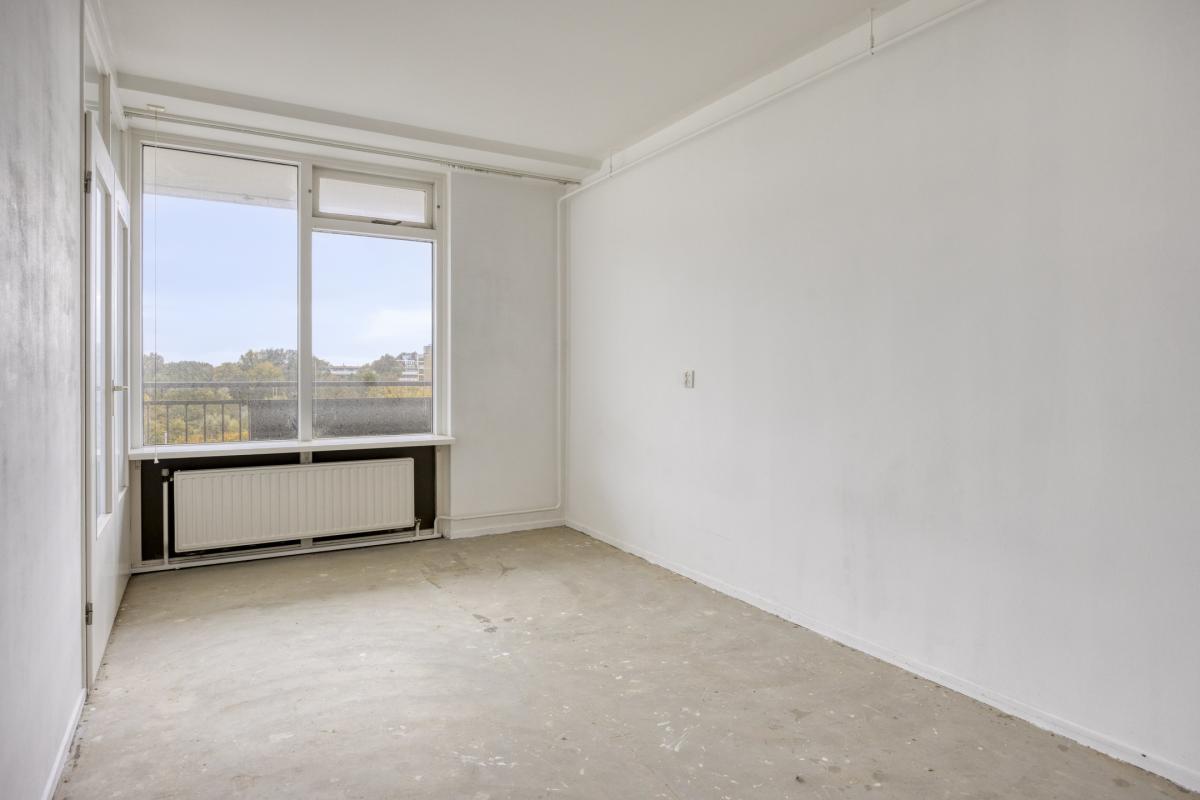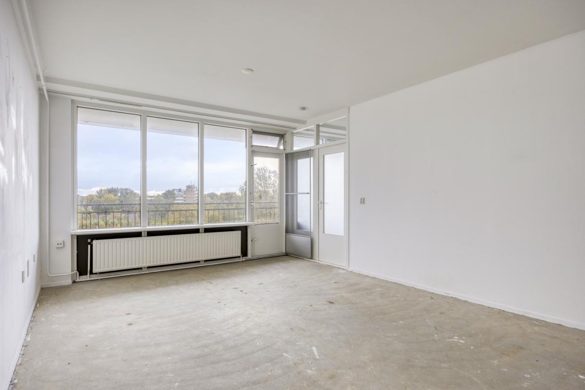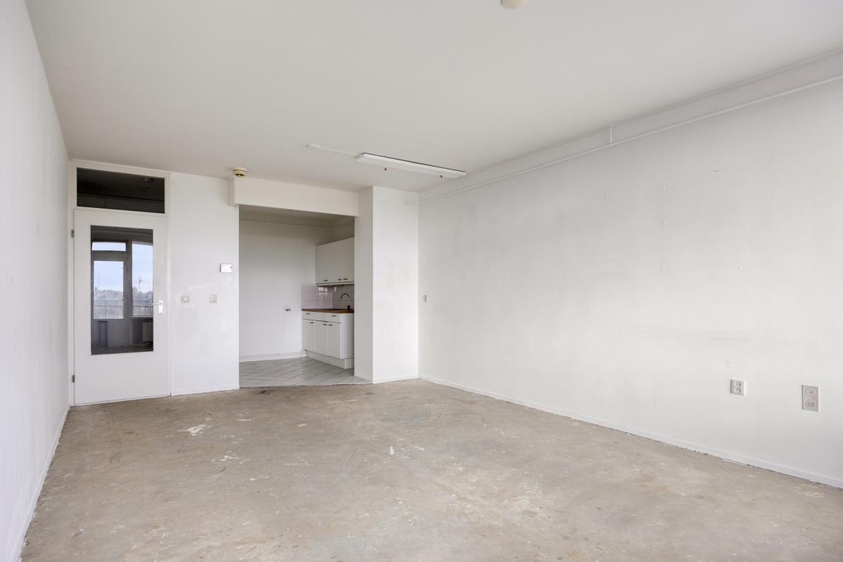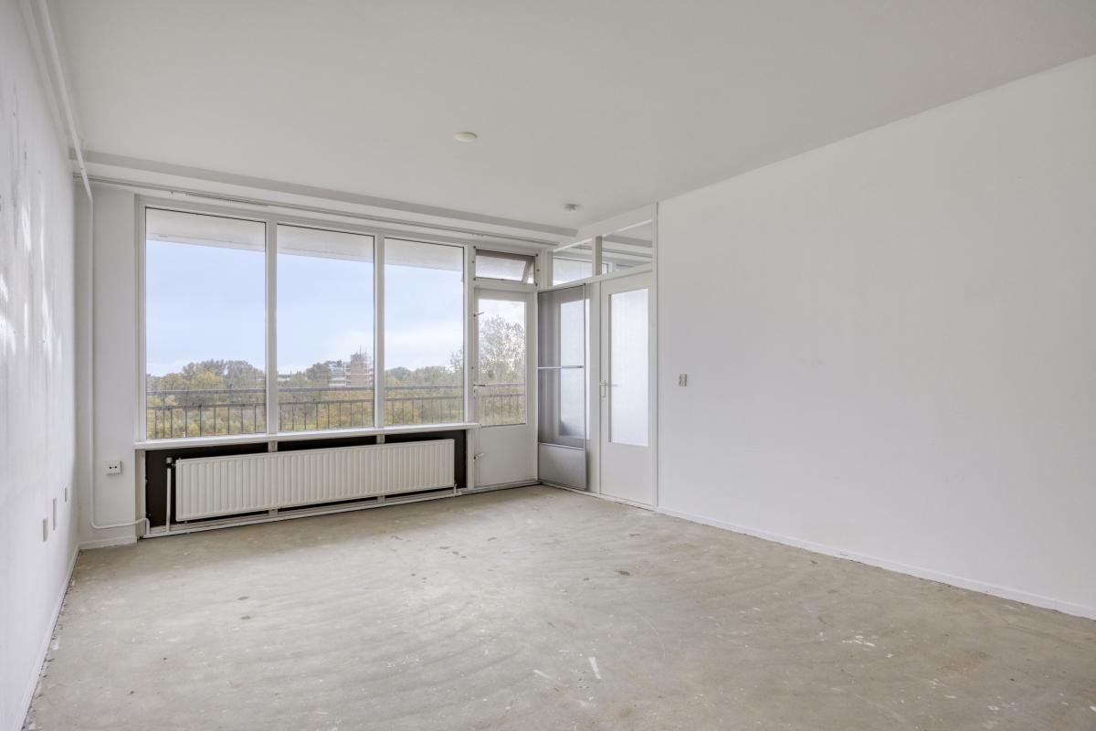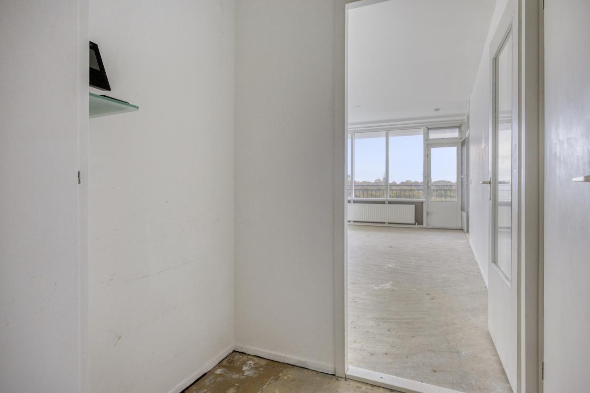 Afgesloten entree met elektrische schuifdeuren, luxe entreehal met de brievenbussen, video-intercomsysteem en de huismeesterruimte. Lift of trap naar de 5e verdieping. Grote gemeenschappelijke hal, entree van het appartement, hal met de meterkast en garderoberuimte. De woonkamer is door de grote ramen erg licht en biedt toegang tot balkon over de volle breedte van het appartement, welke tevens ideaal op de zon is georiënteerd (zuidoosten). De half open keuken is voorzien van een keukenblok, maar biedt voldoende ruimte voor een L-vormige keukenopstelling. Slaapkamer aan de voorzijde van het appartement, eenvoudige badkamer met douche, wastafel, wasmachine aansluiting en een toilet. Ruime inpandige berging.