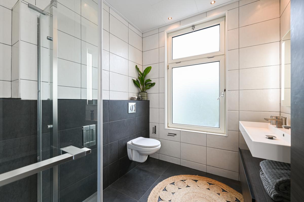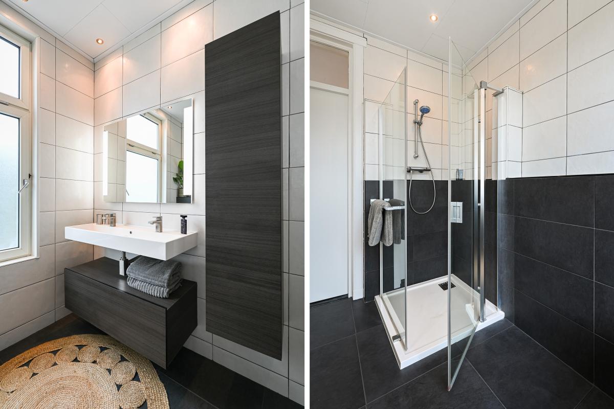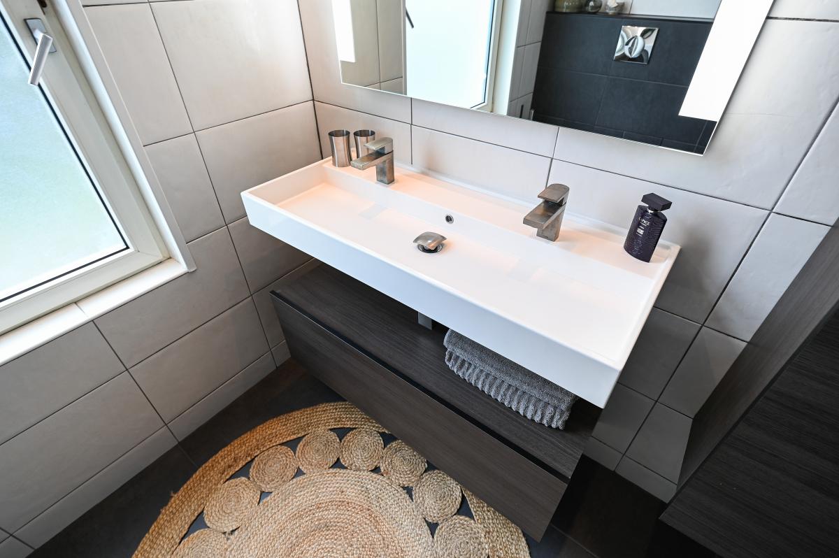 Aan de achterzijde bevindt zich de badkamer is voorzien van een ruime inloopdouche dubbele wastafel en het toilet ( sanibroyeur)